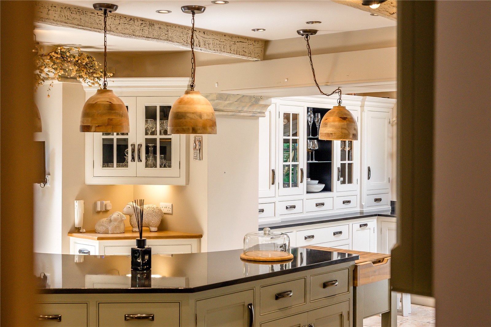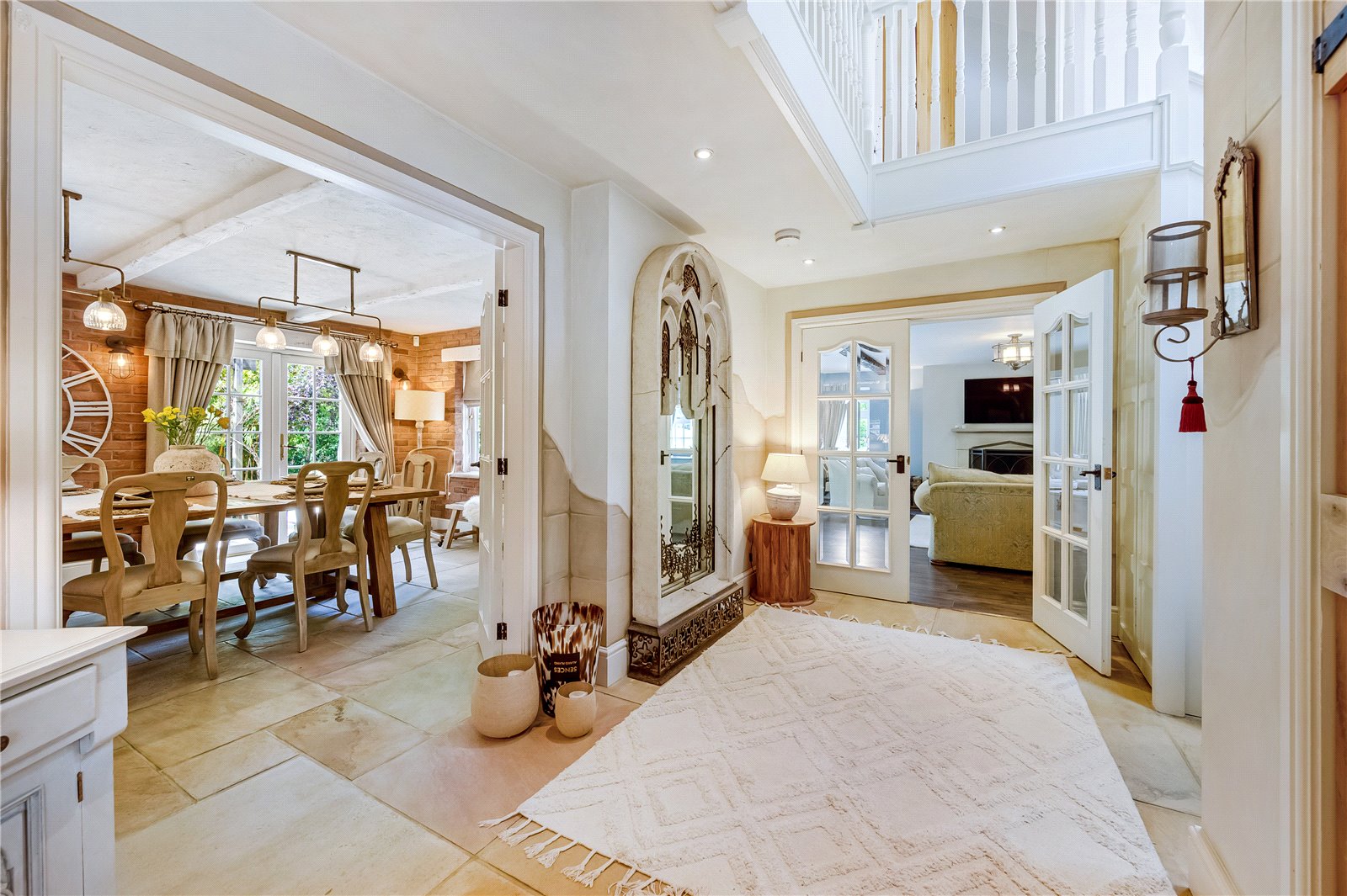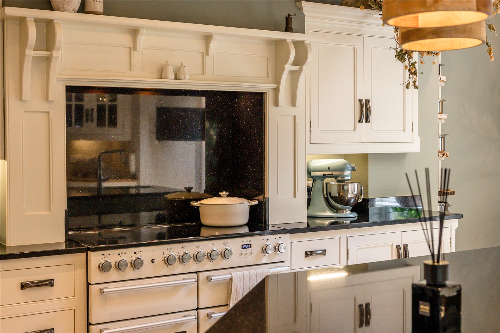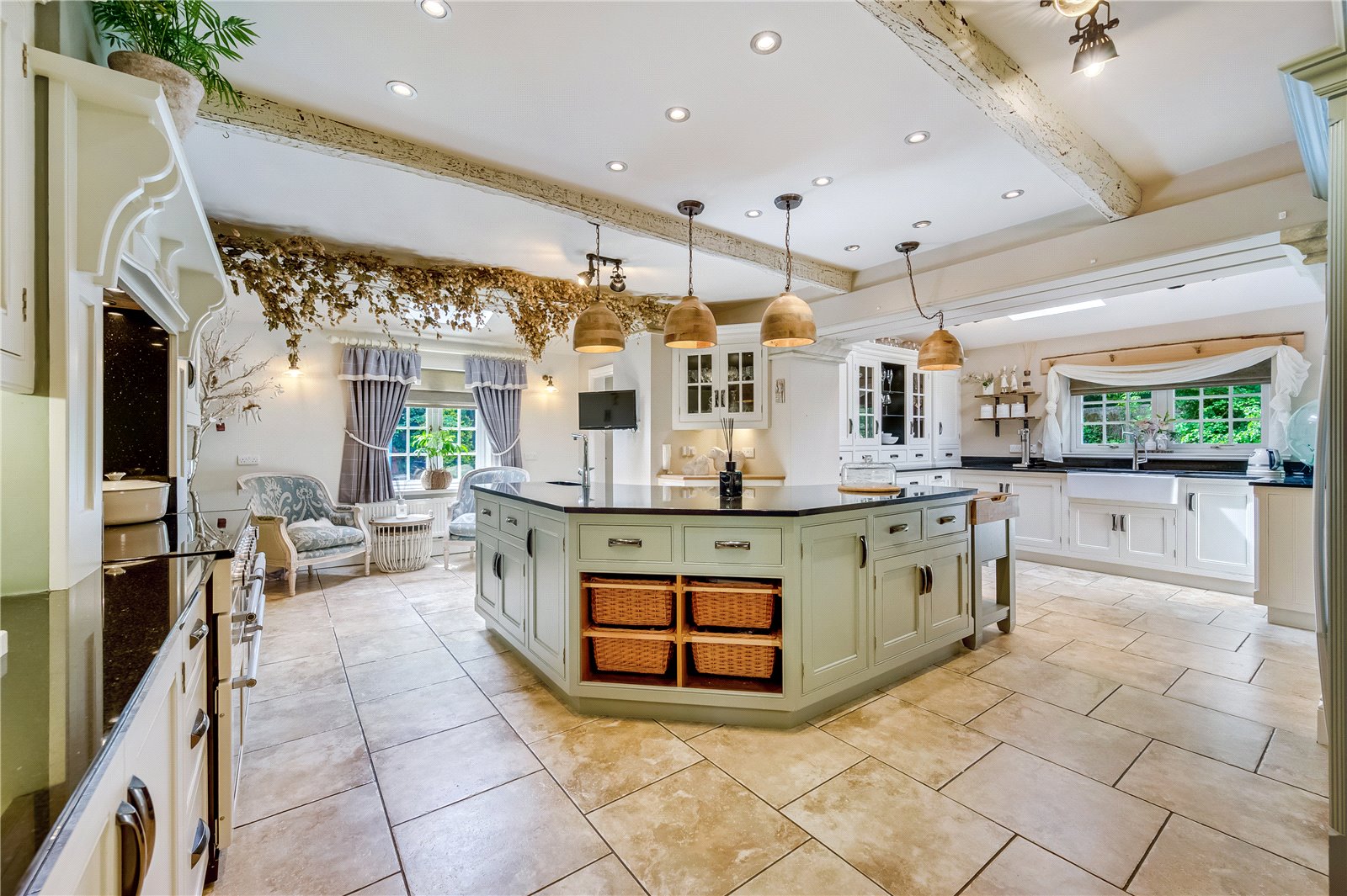 The accommodation is arranged over two floors and offers an abundance of beautifully appointed living space, including five double bedrooms, four bathrooms, and four elegant reception areas. At the heart of the home lies a truly outstanding open-plan kitchen with dining area – a space designed with entertaining in mind – featuring bespoke cabinetry, a central island with bar seating, granite worktops, and a vaulted dining space opening to the gardens.