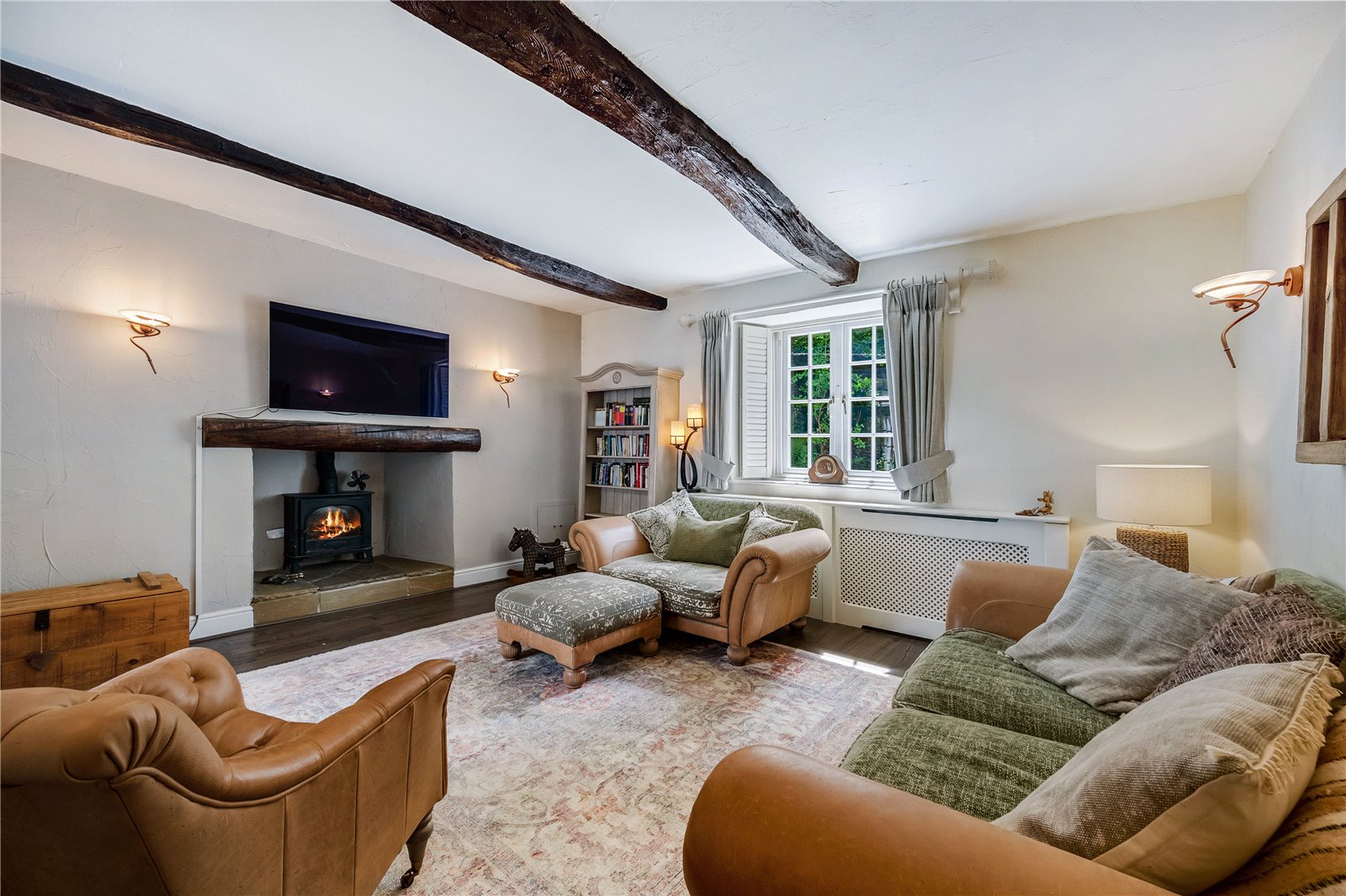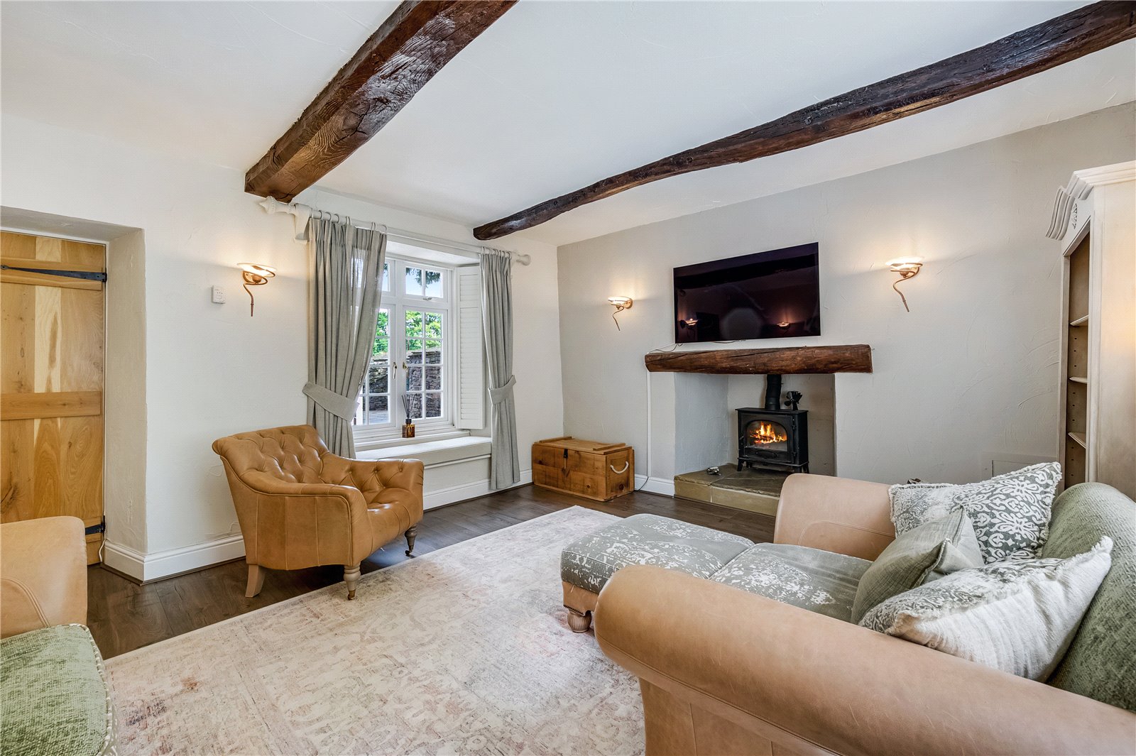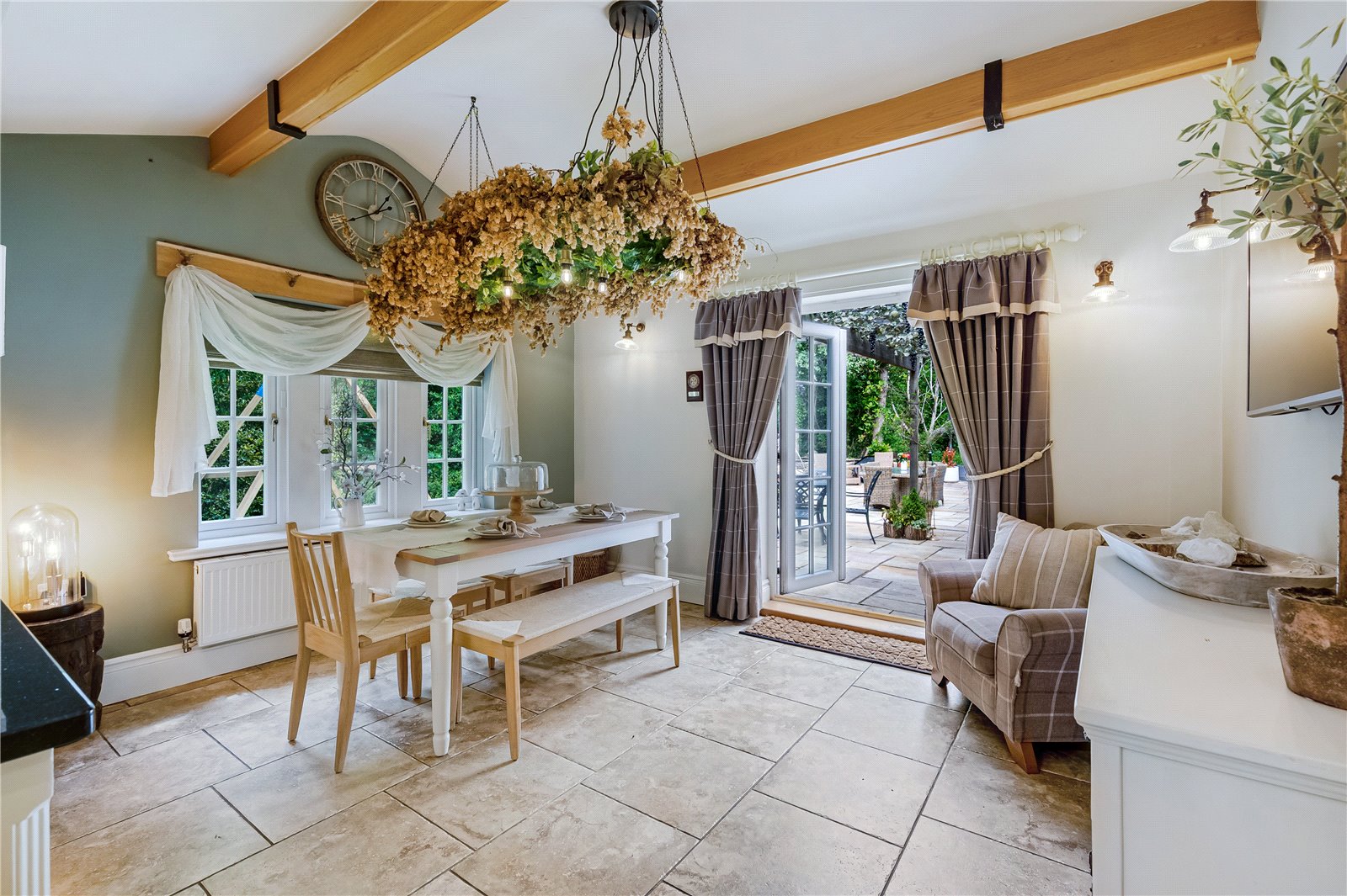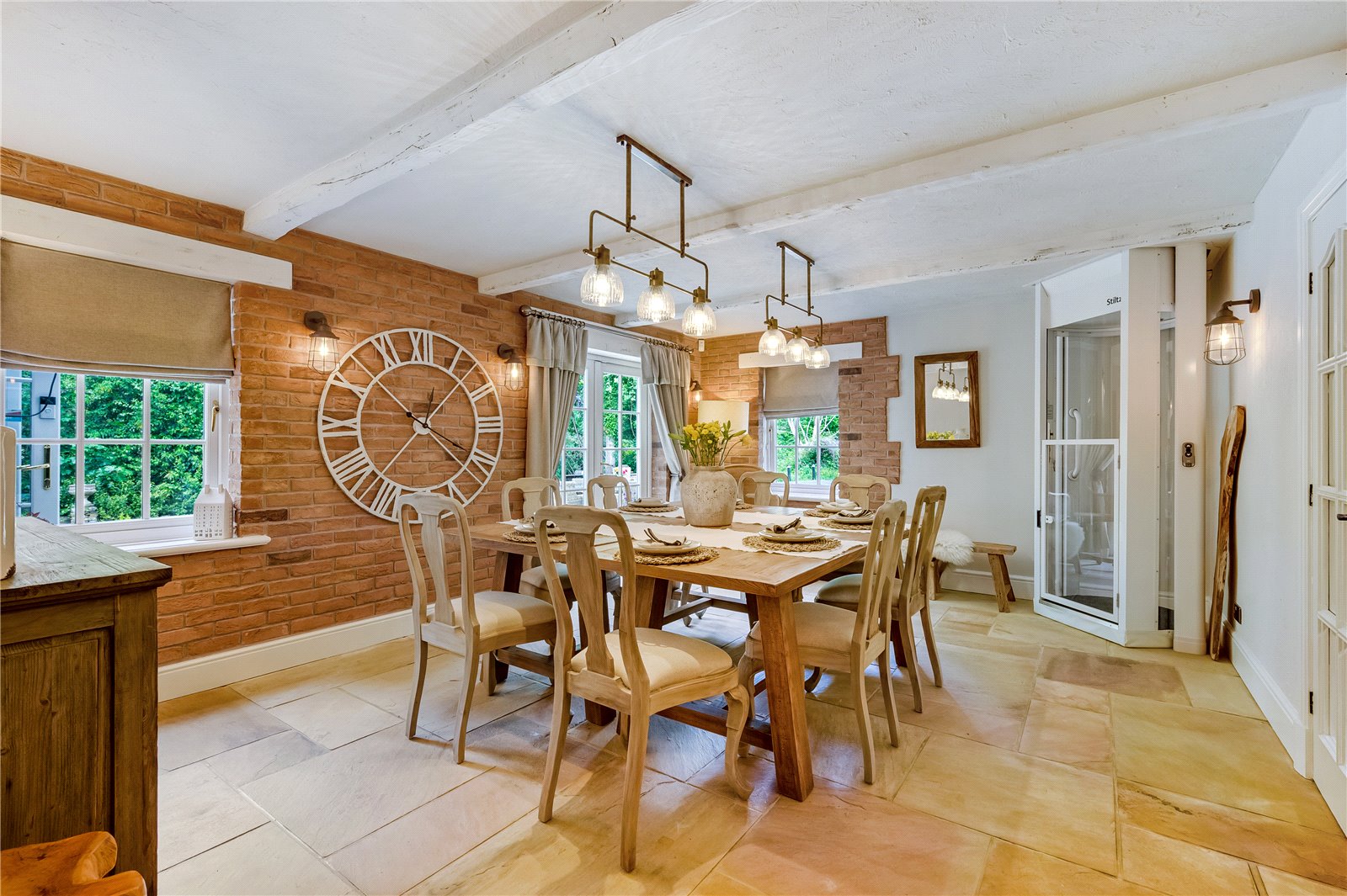 The interior marries character features with contemporary touches: from the main lounge with its open stone fireplace, bay window seating, beamed ceiling and panelled walls, to the dining room with exposed brick, tiled flooring, and direct access to the patio. A snug with log-burning stove offers a cosy retreat, while the ground floor also benefits from a guest cloakroom and a well-equipped utility room.