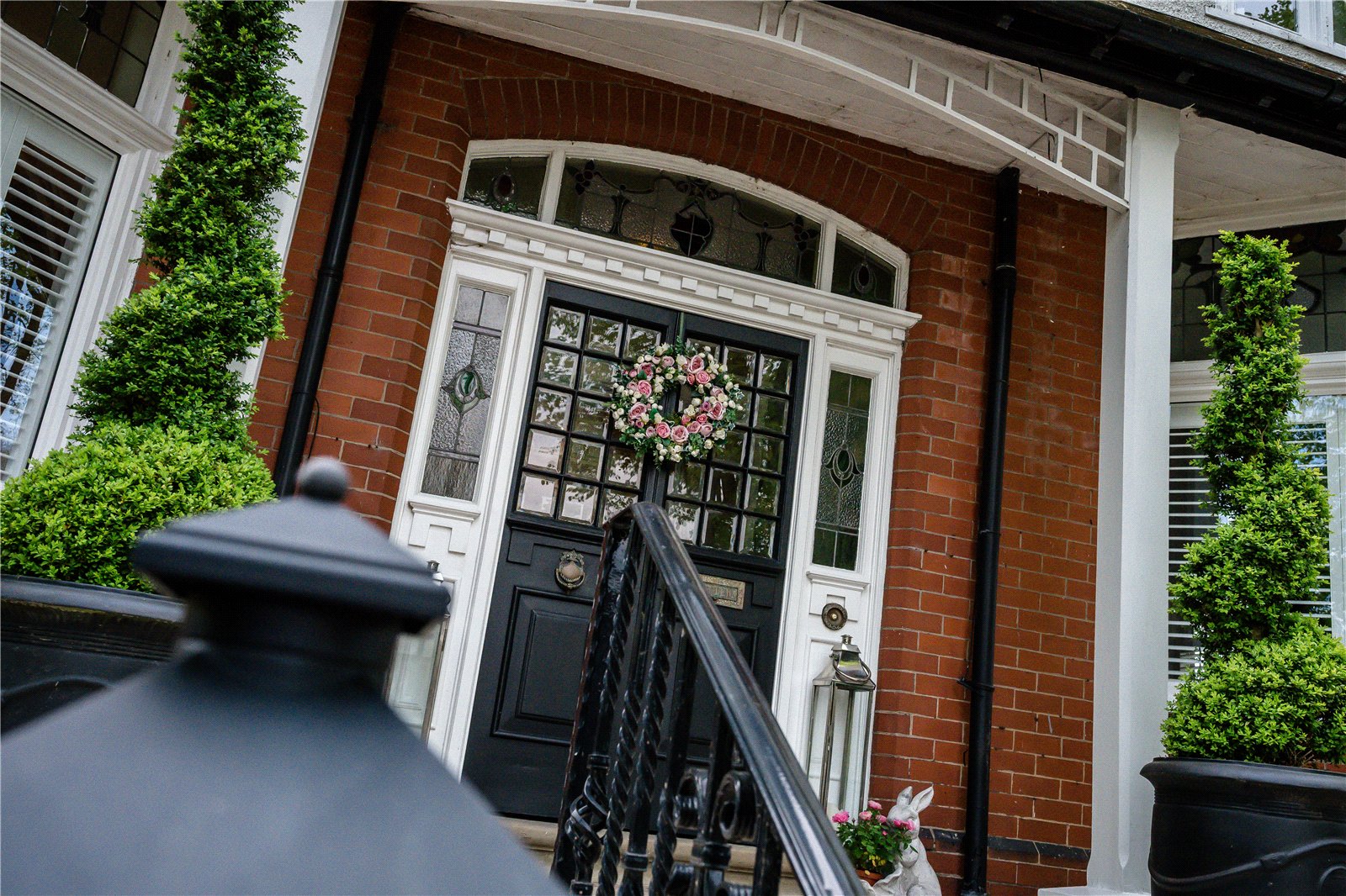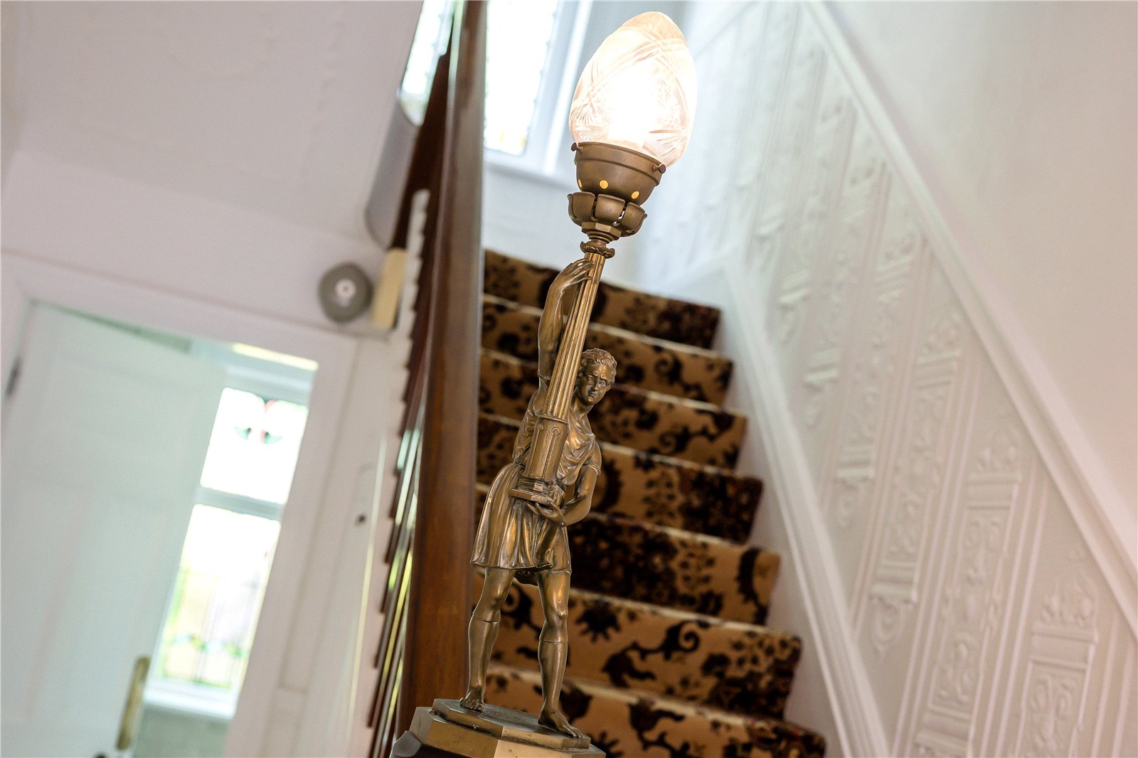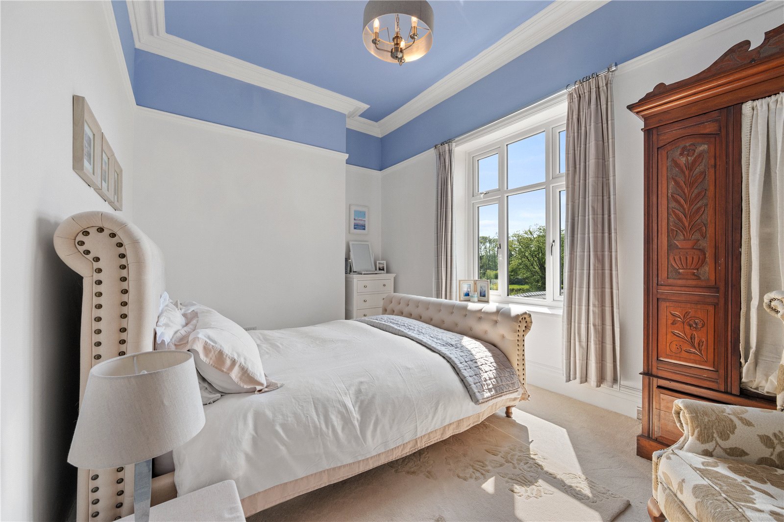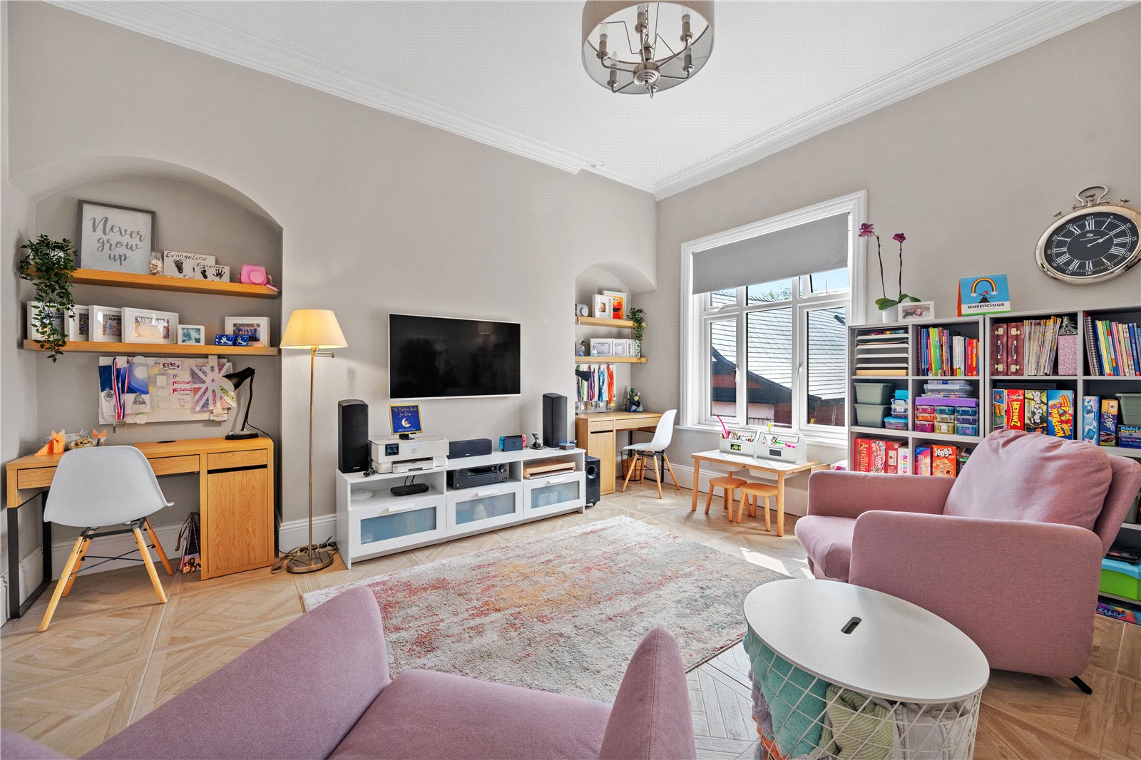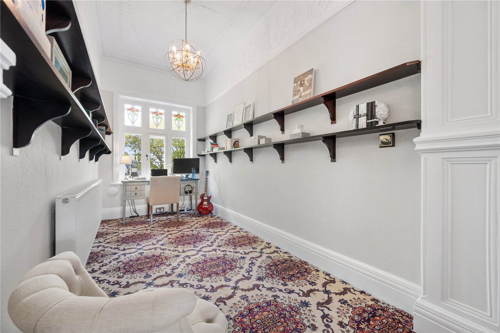 The staircase rises in two parts from the hall, with a sculpted newel post lamp, decorative frieze, and a beautiful leaded window offering a lovely sense of arrival on the first floor. A wide open arch off the landing leads to a spacious area, ideal as a study or easily reconfigured as an additional bedroom or en-suite. Of the five bedrooms, three are excellent doubles with attractive cornicing, one is a smaller double, and the fifth a good-sized single. They are served by a stylish family bathroom comprising a panelled bath with shower attachment, walk-in rainfall shower, hand wash basin, and there is a separate WC with basin.