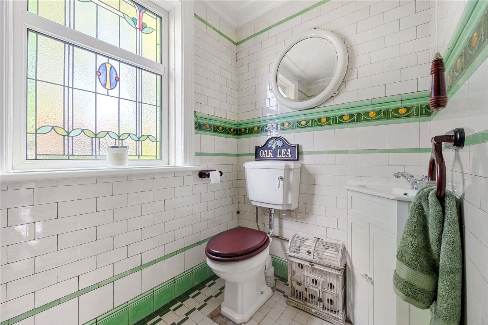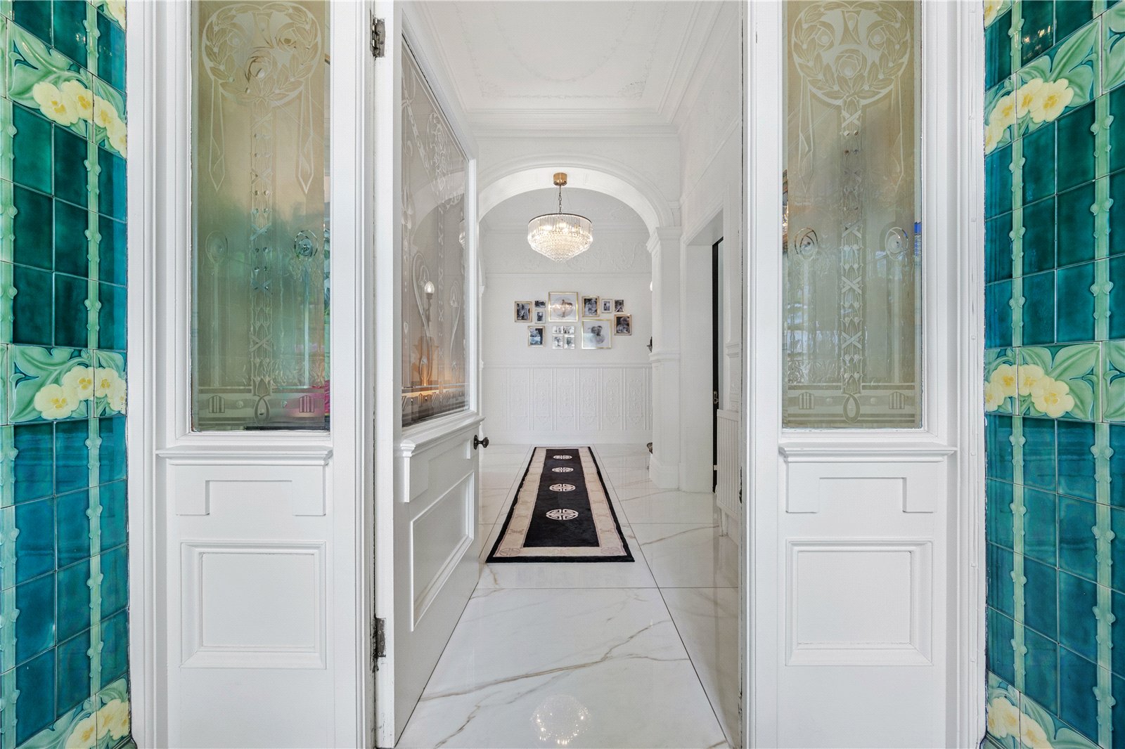 The accommodation begins with a welcoming vestibule, framed by double doors and striking stained glass side and overhead panels. Original tiled floors and walls continue through to an elegant etched glass door with matching surround, opening into a hallway of exceptional character, complete with a decorative plaster frieze, tiled floor, and a charming recessed seating nook lit by a stained glass window. A two-piece cloakroom features a hand wash basin, low-level WC, and original Edwardian tiling.