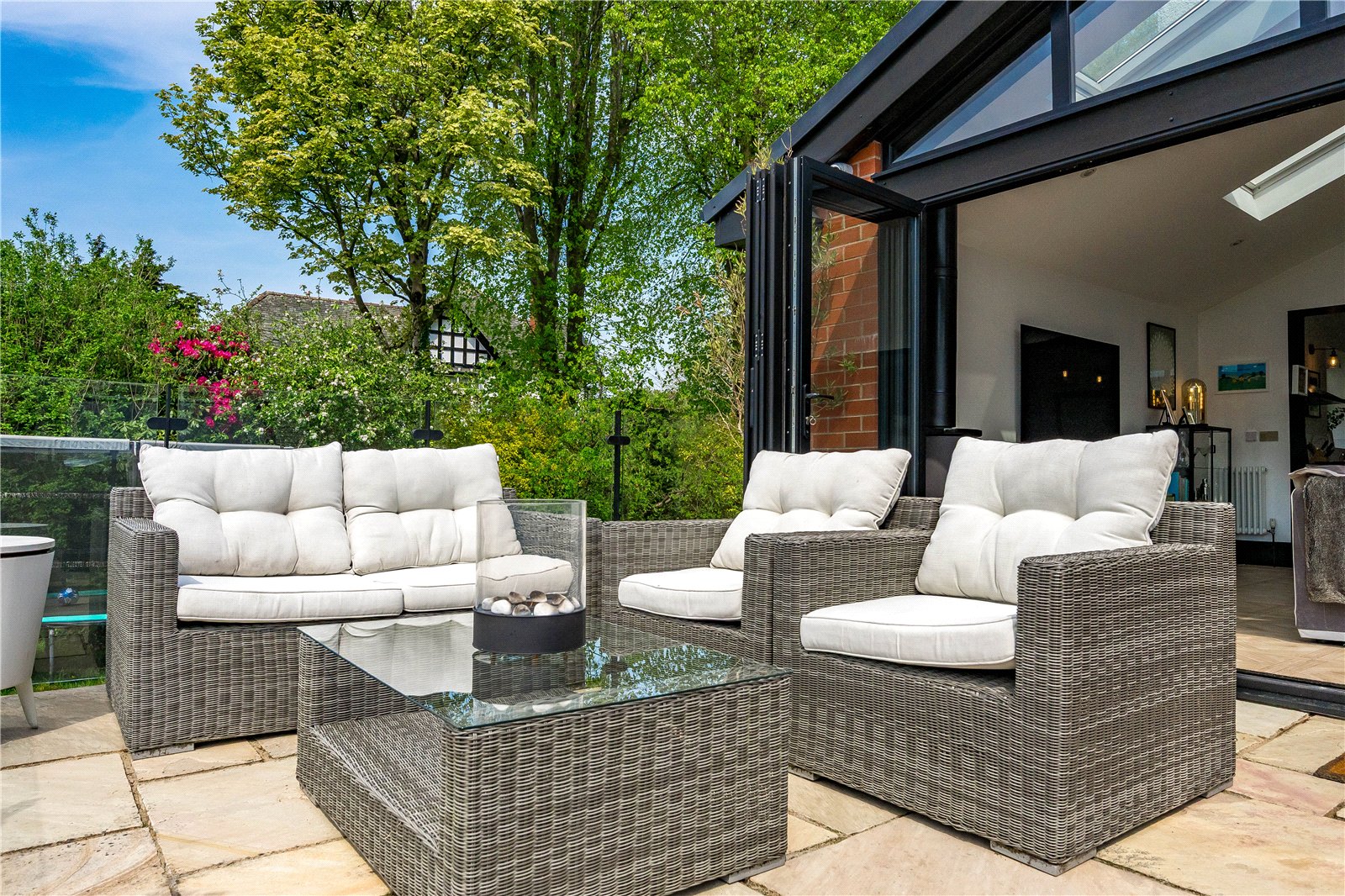 Outside, the electric gates open onto a large block-paved driveway offering extensive parking and leading to a generous detached garage. Stone steps ascend to the front entrance, where a large Indian stone patio creates a welcoming first impression and wraps around to one side of the house. The formal gardens to the rear and side are beautifully landscaped, with expansive lawns bordered by a variety of mature trees, shrubs, conifers, and flowering plants. A raised patio terrace with glazed balustrade offers an ideal spot to enjoy the outlook.