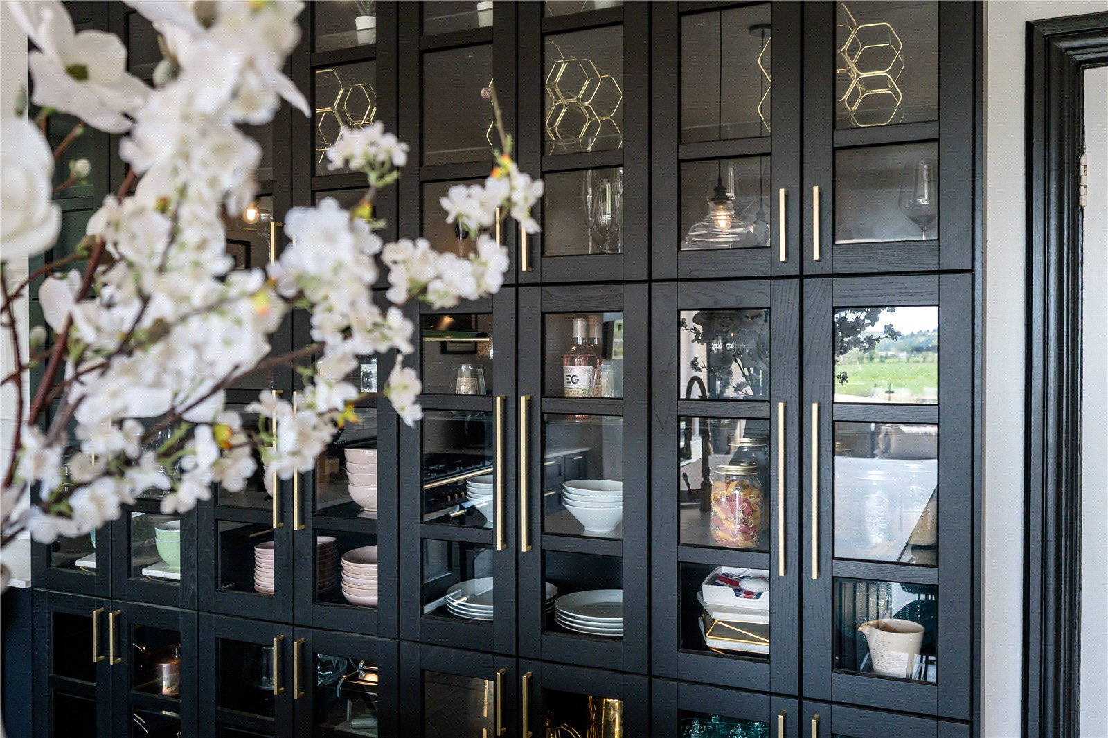 At the heart of the home is a stunning breakfast kitchen, thoughtfully designed with a comprehensive range of base and wall cabinetry, open display units, and premium Dekton work surfaces. A gas point and space for a range cooker sit beneath a fitted extractor, with integrated appliances including a fridge, microwave, space for two dishwashers, along with provision for an American-style fridge-freezer. Twin sinks with mixer taps and a matching central island with breakfast bar and drawer storage complete the space, all set on a tiled floor that flows seamlessly into a bright and spacious family dining area. Here, a feature wood-burning stove adds warmth, while full-width bi-fold doors open completely onto a raised patio with glazed balustrade. A glazed pitched rear elevation, four Velux windows, additional side windows, and an external door flood the space with light. A separate playroom, visible from the kitchen, lies beyond a glazed internal door and enjoys a tiled floor and garden views.