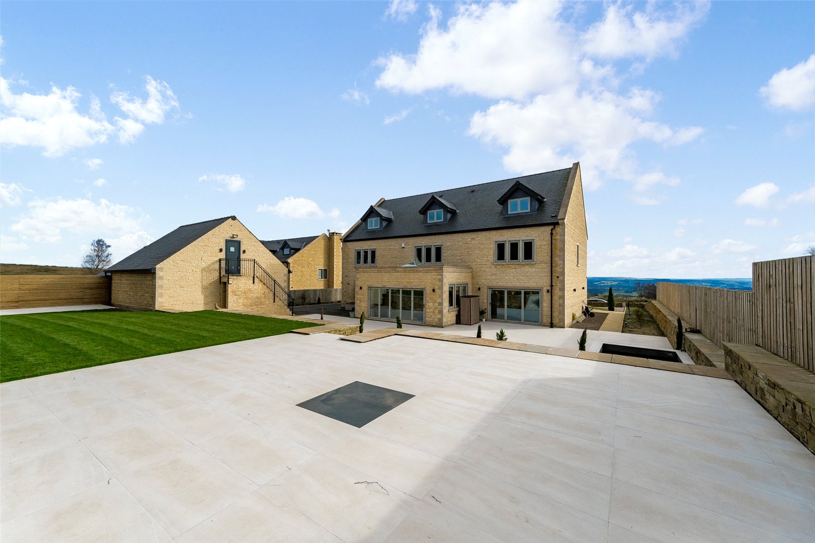 The residence is approached via electric gates that open to a sweeping driveway, offering generous off-road parking and leading to a detached double garage with bi-fold doors and extensive storage. An external staircase ascends to a substantial additional space, ideal for a home office or private gym. The front garden is beautifully landscaped with manicured lawns enclosed by a classic drystone wall and complemented by pea-gravel pathways.