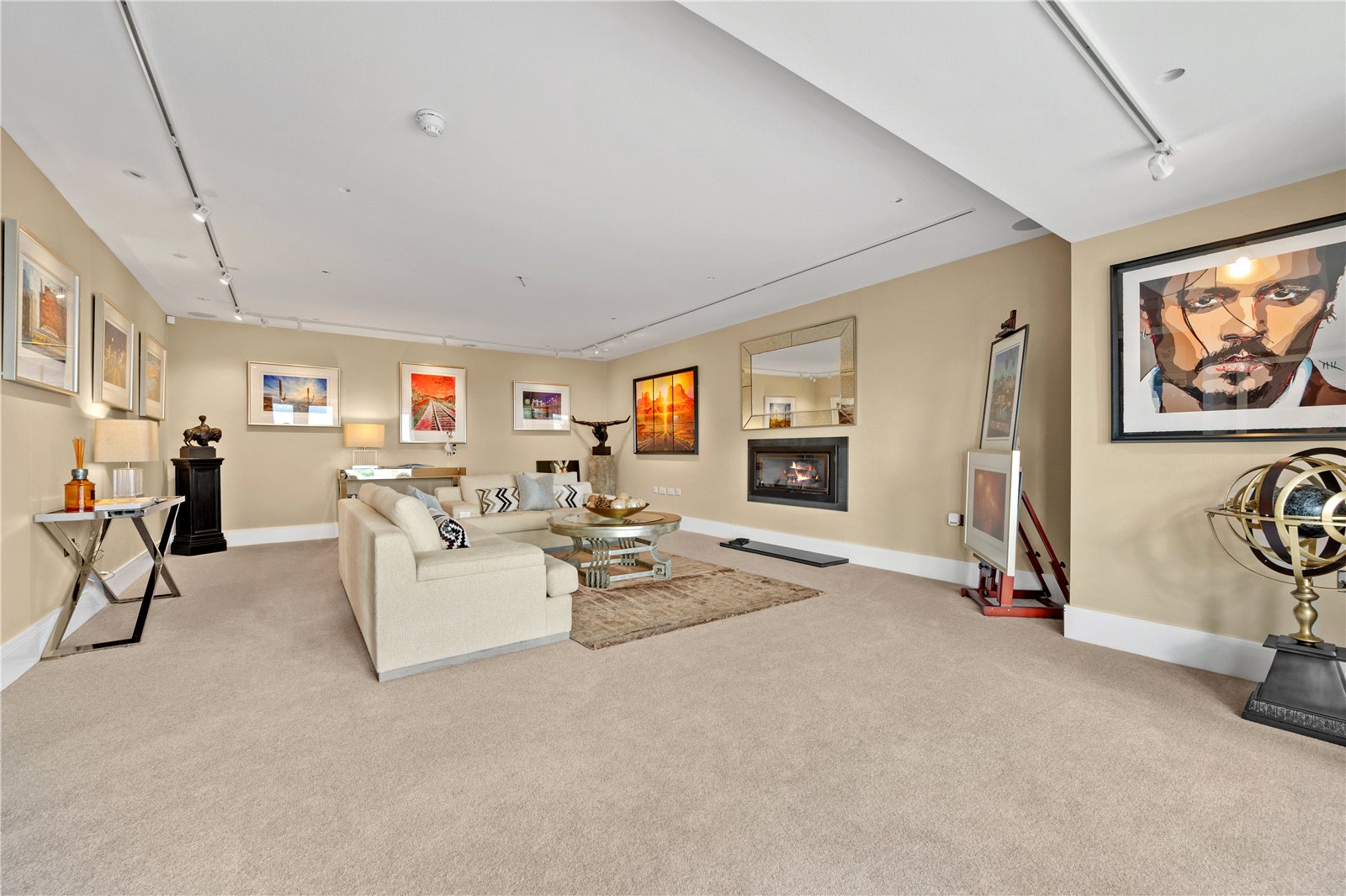 The heart of the home is an extraordinary family dining kitchen, a masterpiece crafted by Extreme Designs of London. This space is equipped with an exceptional suite of mainly Miele and Die Dietrich appliances, including a state-of-the-art induction hob, twin ovens, two warming drawers, microwave/steam oven, and a Gaggenau temperature-controlled drinks cabinet. Sleek stone worktops extend to a striking central island with a recessed double-bowl sink, Quooker hot tap, and breakfast bar. Two sets of expansive bi-fold doors bathe the space in natural light and open onto the rear garden, while a statement lantern-style roof crowns the elegant seating area. A well-appointed utility room features ample built-in storage, a Belfast sink, a wall-mounted boiler, and an advanced air filtration system.