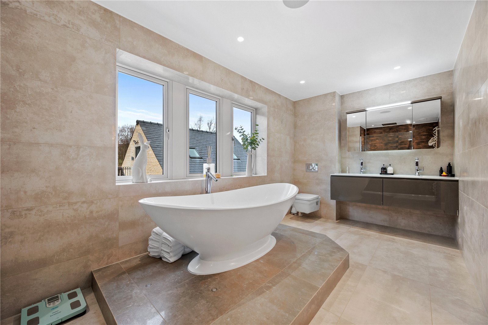 The first-floor galleried landing offers breathtaking panoramic views and built-in storage, including a dedicated comms cupboard. The principal suite is a sanctuary of indulgence, featuring a spacious sleeping area flowing into a bespoke dressing room with elegant hanging space, integrated drawers, and a central countertop display. A set of sliding doors reveals the opulent 5pc en-suite, complete with a raised freestanding bath, a vast walk-in shower with rainfall head and side attachment, his-and-hers wash basins, and a floating dual-flush WC, all set against a backdrop of exquisite tiling. Two additional large double bedrooms, each with walk-in wardrobes and private en-suite shower rooms, complete this floor.
