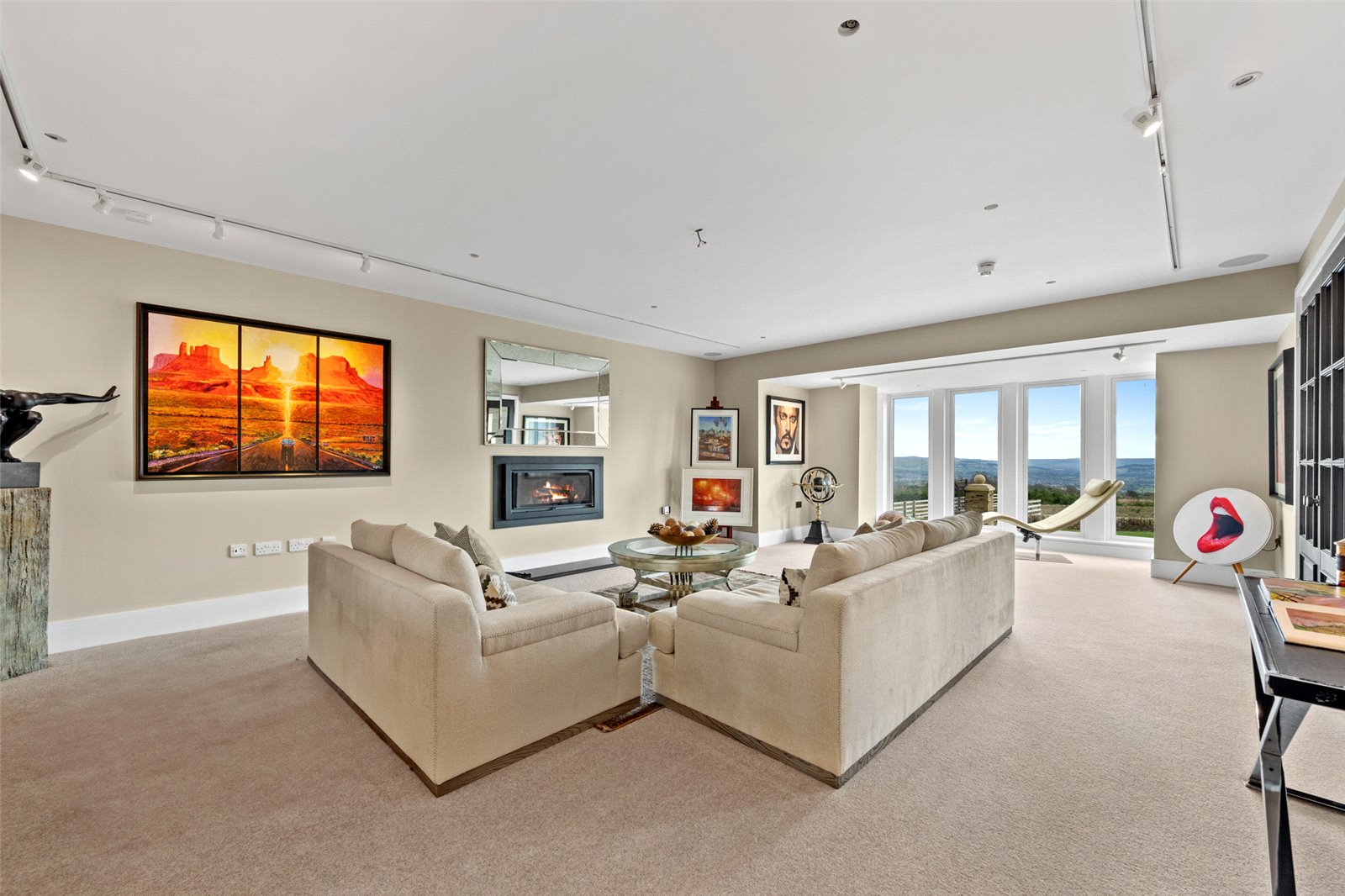 A striking oversized Spitfire fingerprint-entry pivot door opens to a grand reception hall, where a showstopping split staircase ascends to a stunning galleried landing. Underfloor heating flows seamlessly beneath mainly porcelain tiles, ensuring comfort and elegance throughout the entire ground floor. A sleek, contemporary cloakroom with a feature marble-topped wash basin adds a refined touch. Double doors lead to an exquisite living room, anchored by a sophisticated inset Panadero wood-burning stove and an elegant bay window framing countryside vistas. A separate sitting room, also accessed from the hallway, provides a tranquil retreat with bay window and also capturing the views.