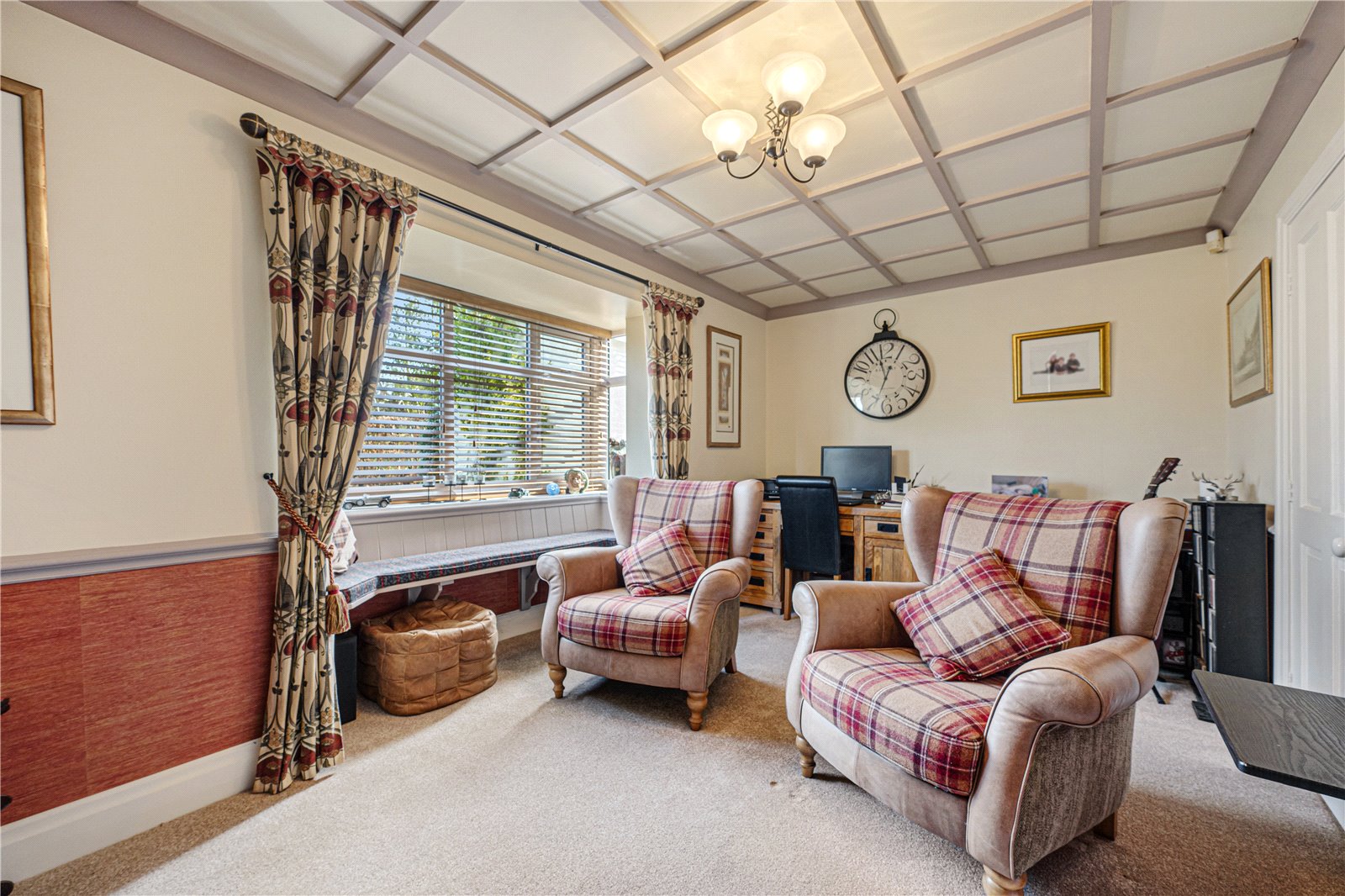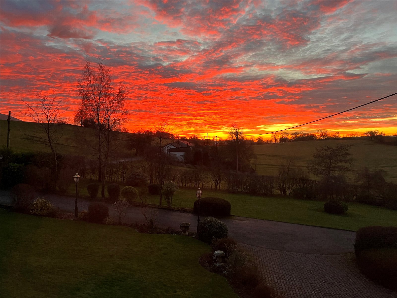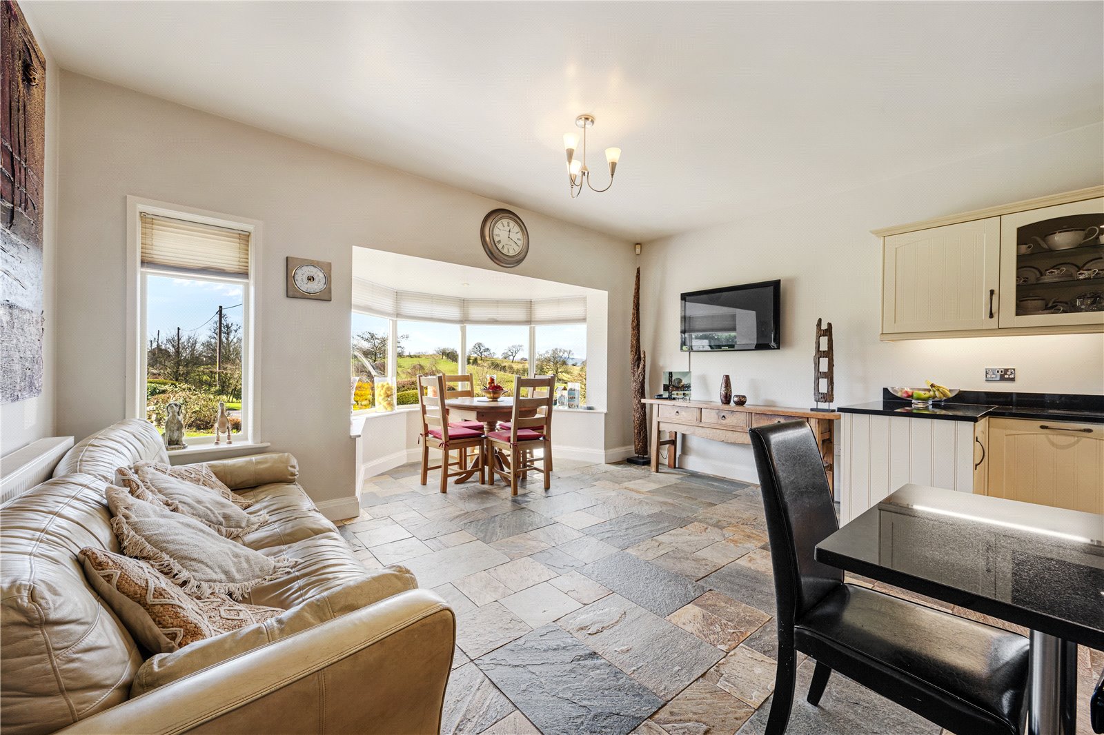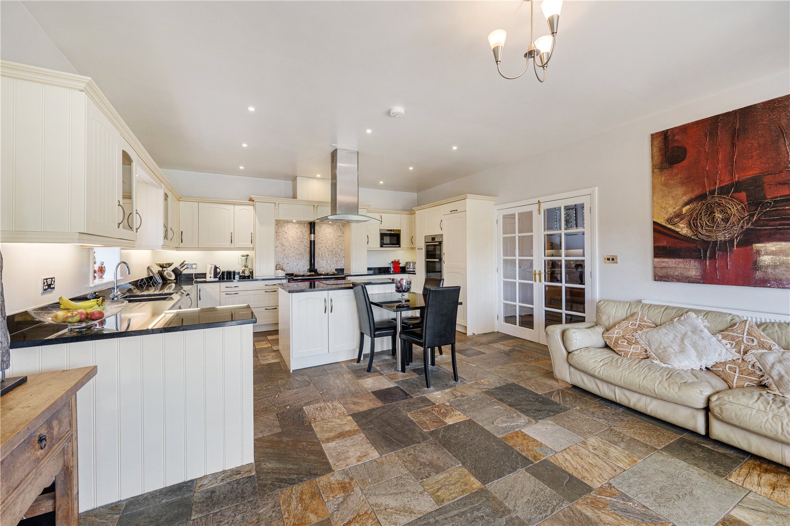 Spanning 3,637 sq. ft., the accommodation is both spacious and thoughtfully designed. A welcoming hallway with a tiled floor leads to a superb dining kitchen fitted with an Aga, induction hob, electric double oven, microwave, granite work surfaces, a central island with a breakfast bar, and a striking circular bay window. A half-landing provides access to the utility room, complete with fitted units, a Belfast sink, and appliance space.