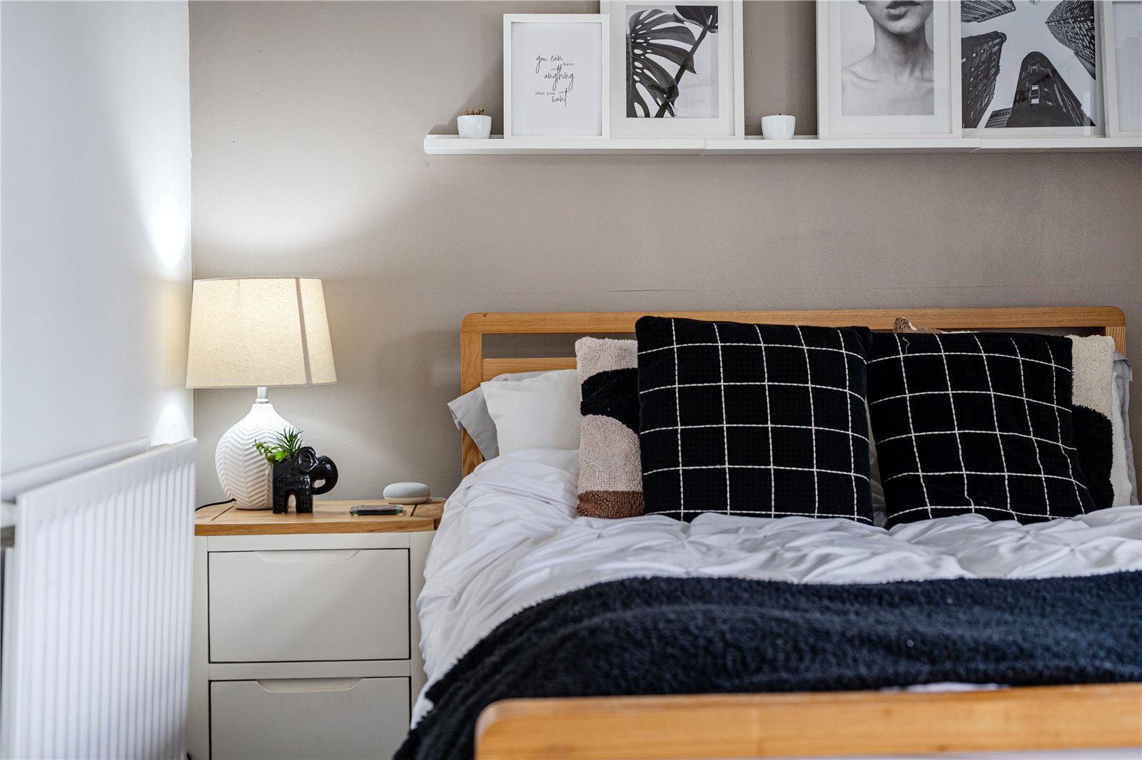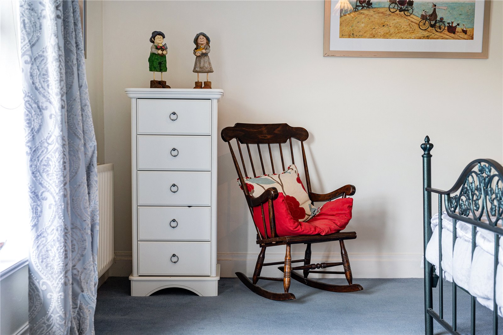 The reception dining hallway features an external door to the rear garden and double doors leading to a charming living room with an open fire, cast iron fireplace, built-in bookshelves, and a bay window. The sitting room boasts a multi-fuel stove set within a sandstone fireplace, while the snug, with its bay window and window seat, offers an inviting retreat with a cast iron open fireplace. To the other end of the hallway is a stone built porch with external access. 2pc cloakroom completes the ground floor.