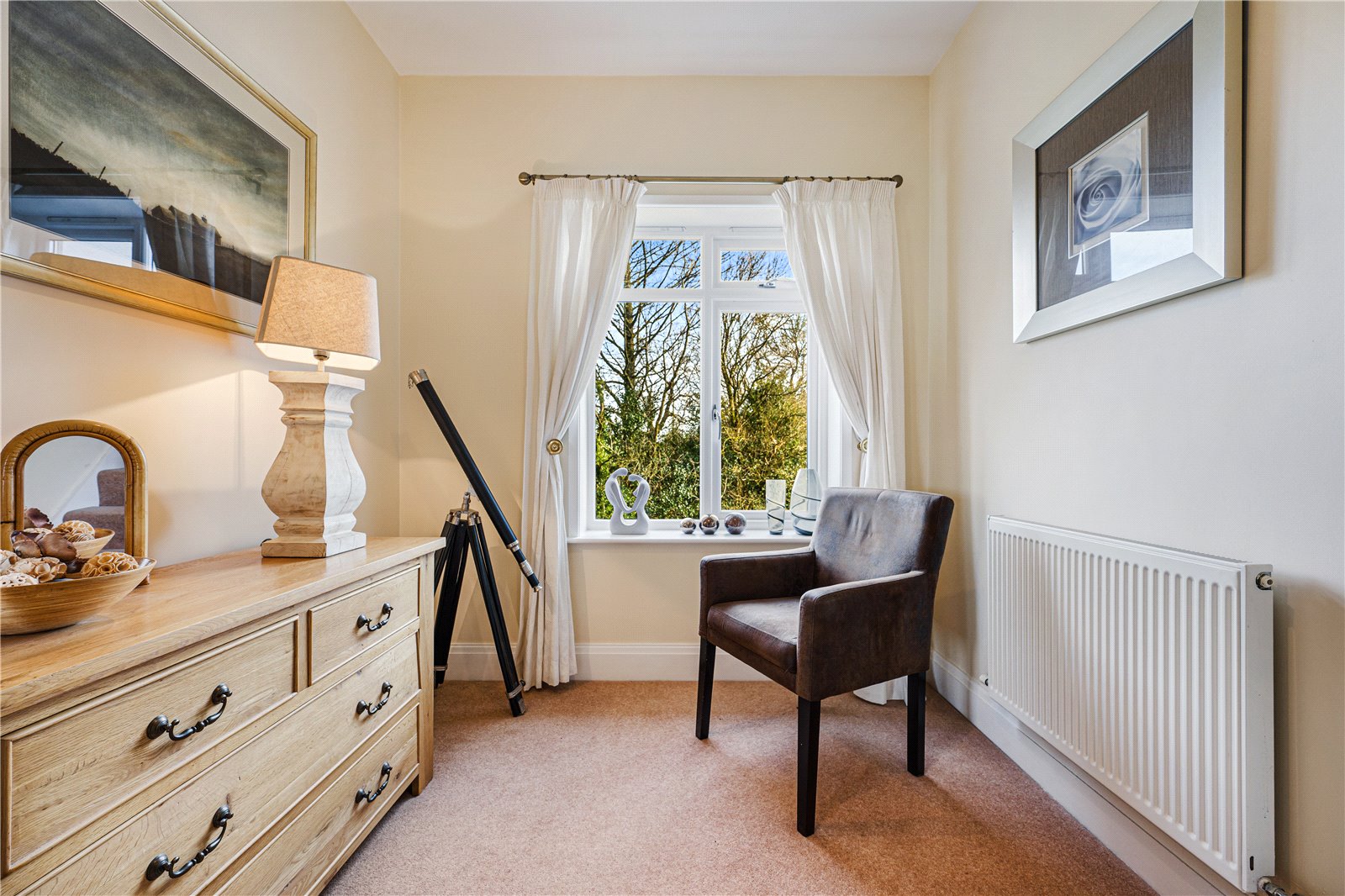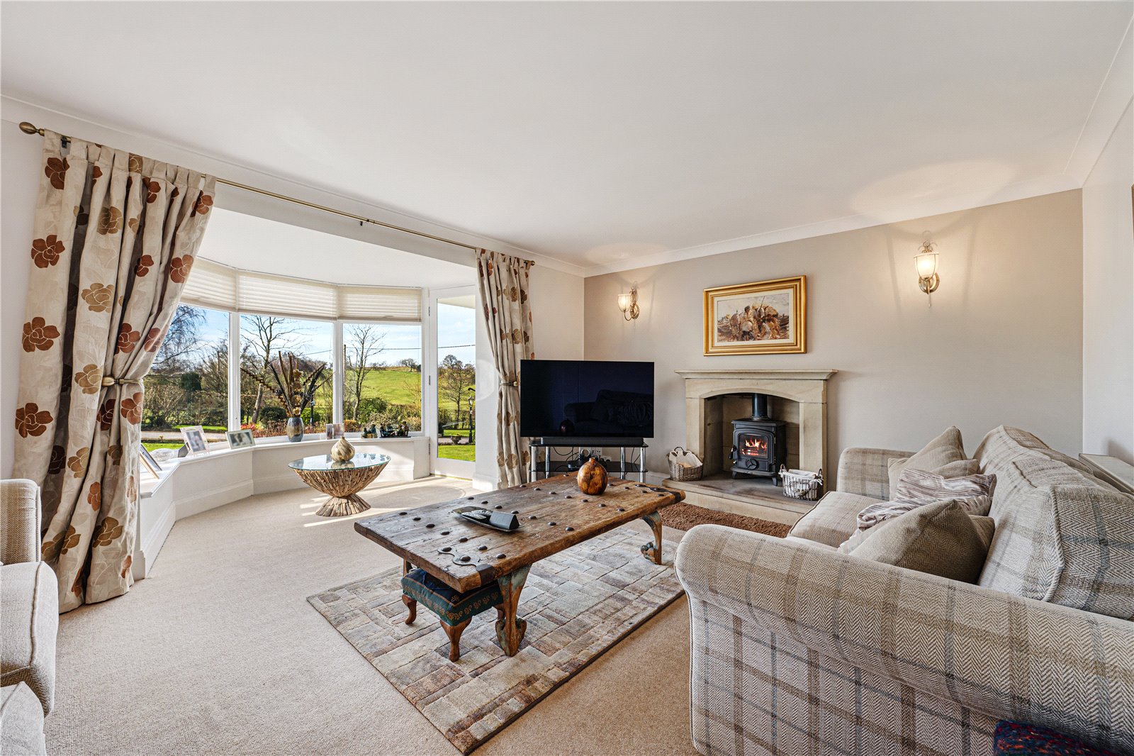 Electric gates open to a sweeping driveway with ample parking, leading to a detached triple garage with electric doors, power, and lighting. The beautifully landscaped gardens to the front enjoy a westerly orientation, capturing breathtaking sunsets and all day sun, while mature trees, shrubs, and hedging enhance the setting. The property also benefits from a stable block with two stables, a tack room, a store, and an adjoining paddock. Historically, the stable block had planning consent for a carport. The rear garden, screened by hedging, includes a lawned area, a rockery, and a useful wood or coal store.
