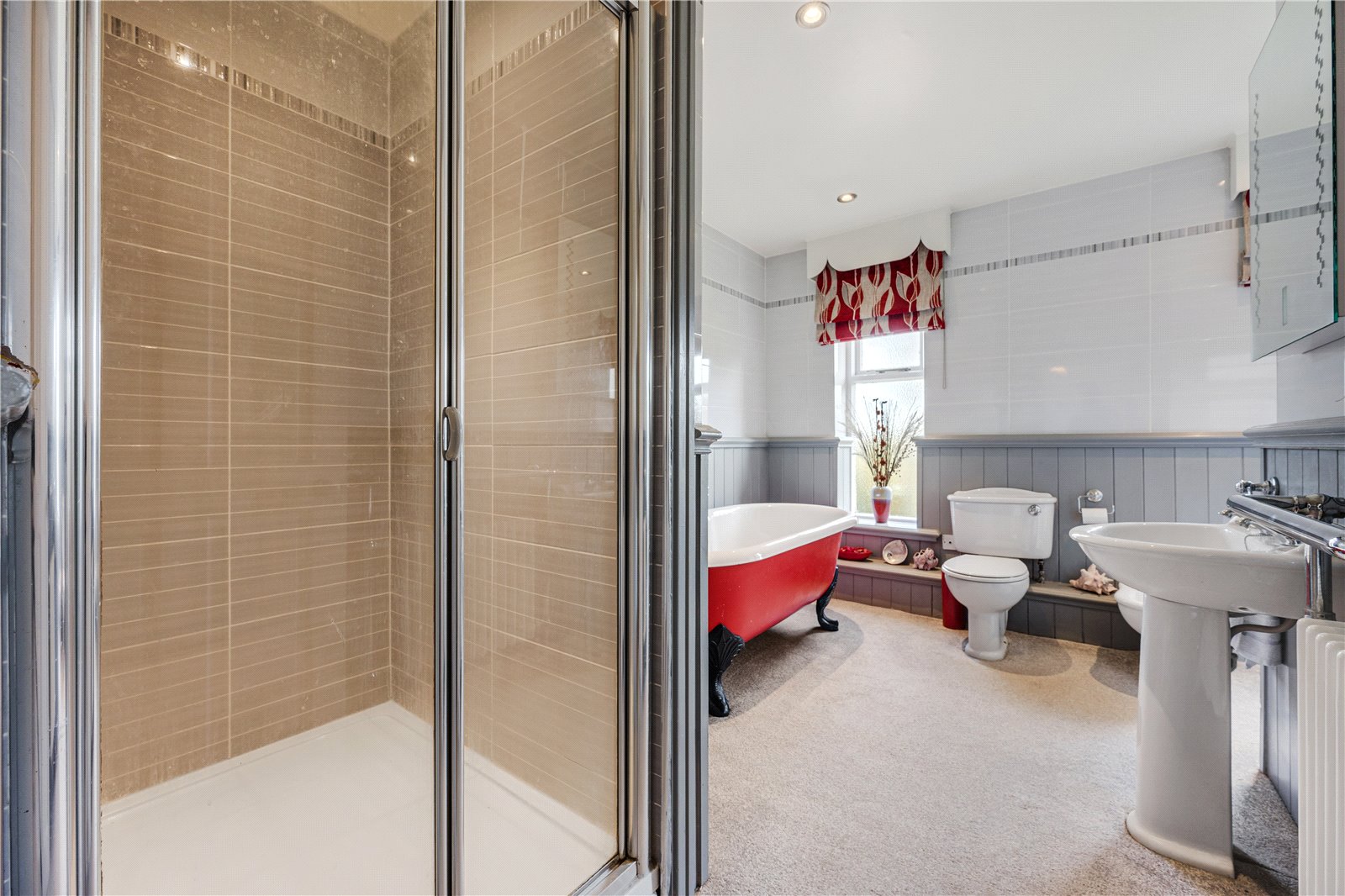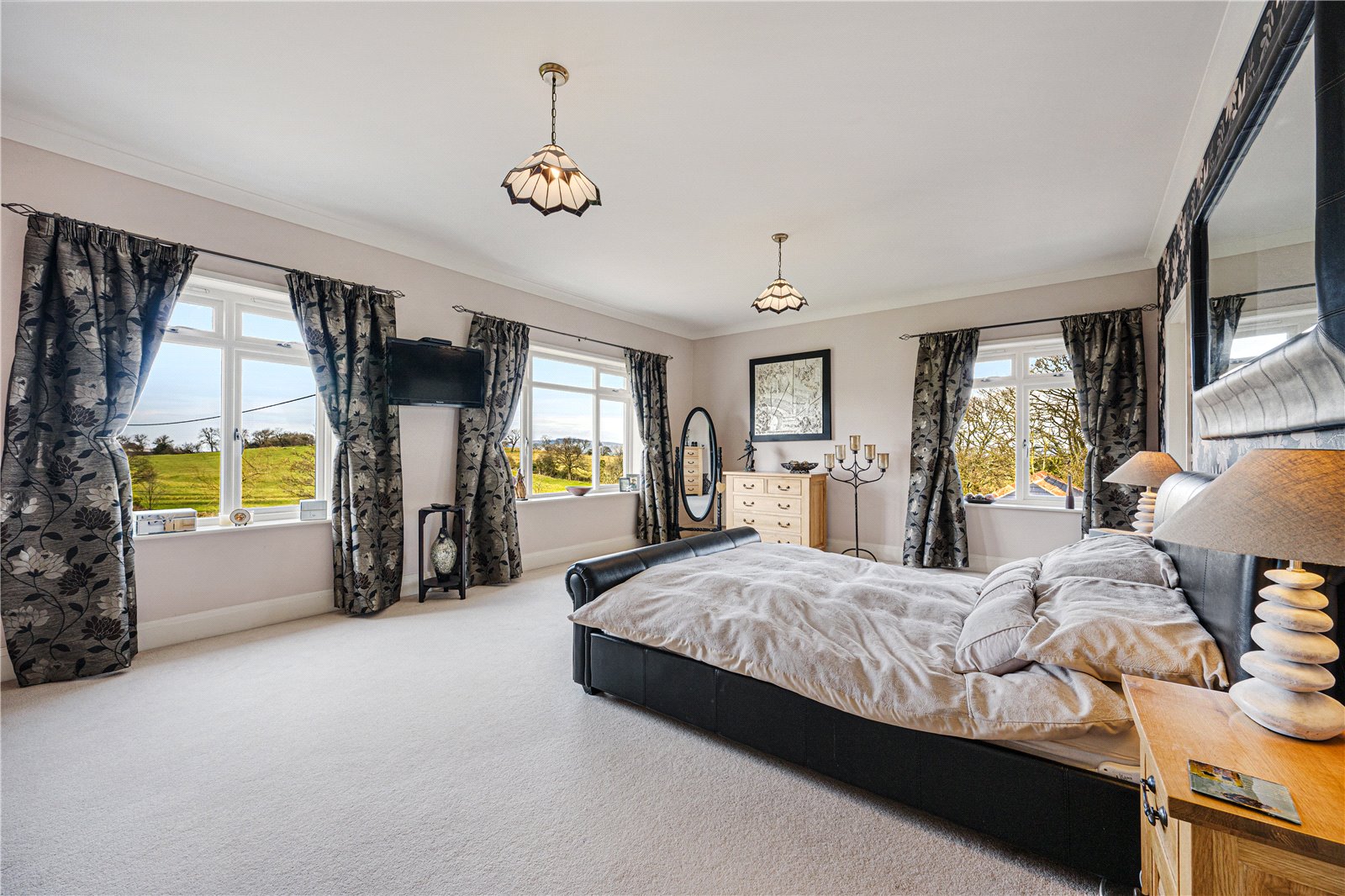 Upstairs, the landing houses an airing cupboard, and loft ladder to attic space with ample storage and off the landing are five generously sized bedrooms. The principal suite is accessed via steps from the landing, featuring a dedicated dressing/reading area, his-and-hers walk-in wardrobes, and an opulent six-piece en-suite bathroom. Two additional bedrooms share a Jack and Jill en-suite, while the family bathroom is fitted with a luxurious five-piece suite, including a rolltop bath and a separate shower.