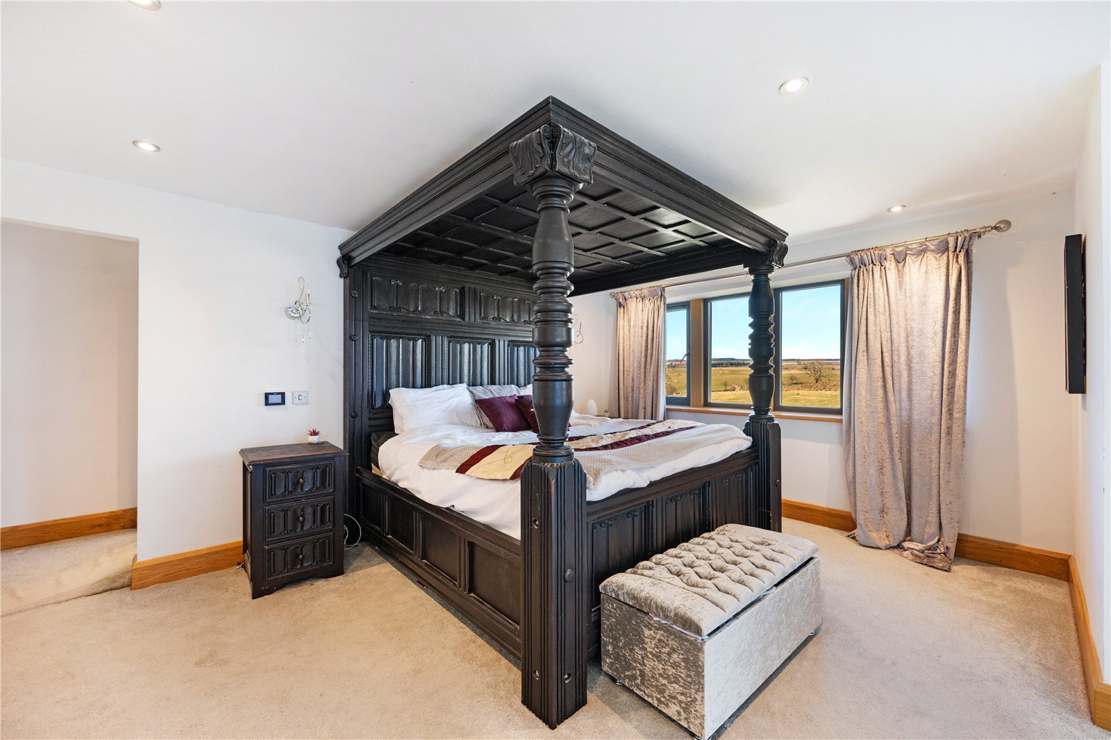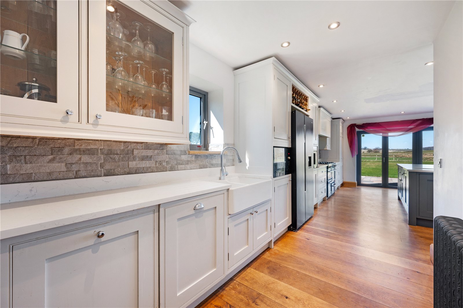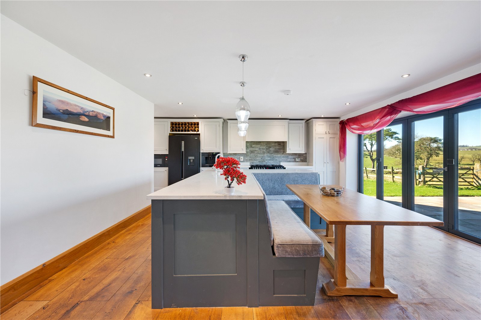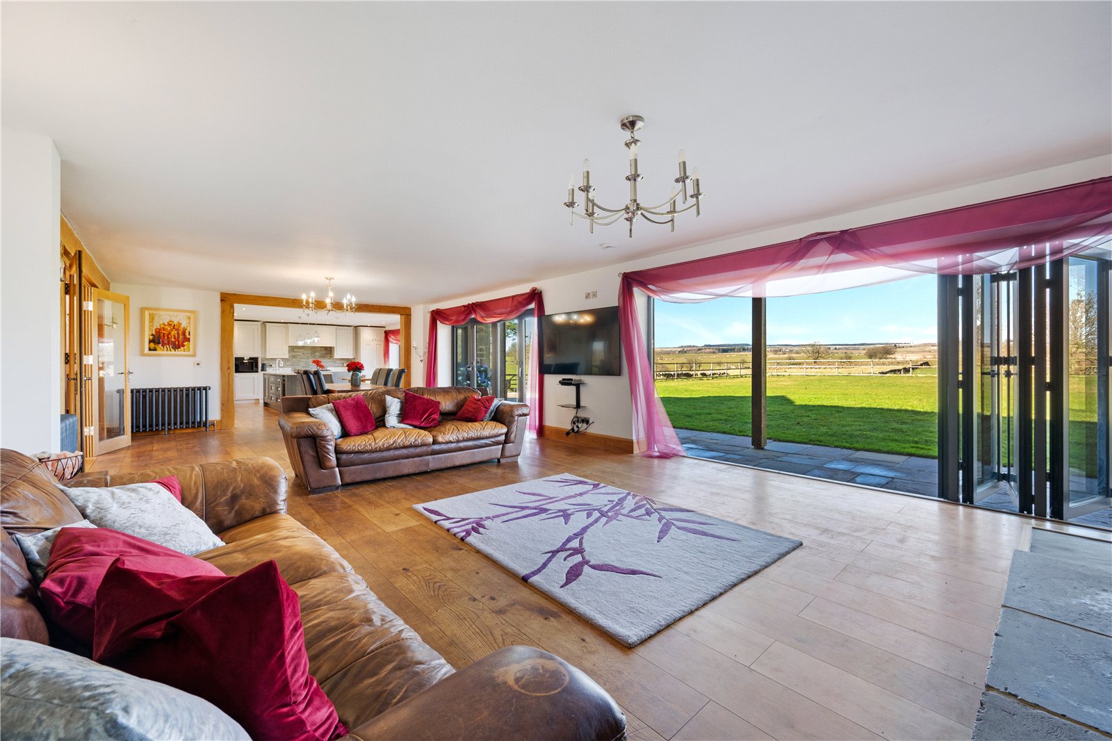 The open-plan living/dining room is a focal point, with a stone fireplace and two sets of multi-fold doors opening onto the gardens. Flowing from this, the handcrafted oak kitchen by Scorton Sawmills is fitted with quartz surfaces, integrated appliances, and an island with seating, complemented by multi-fold doors to the garden. A utility room and plant room complete the ground floor.