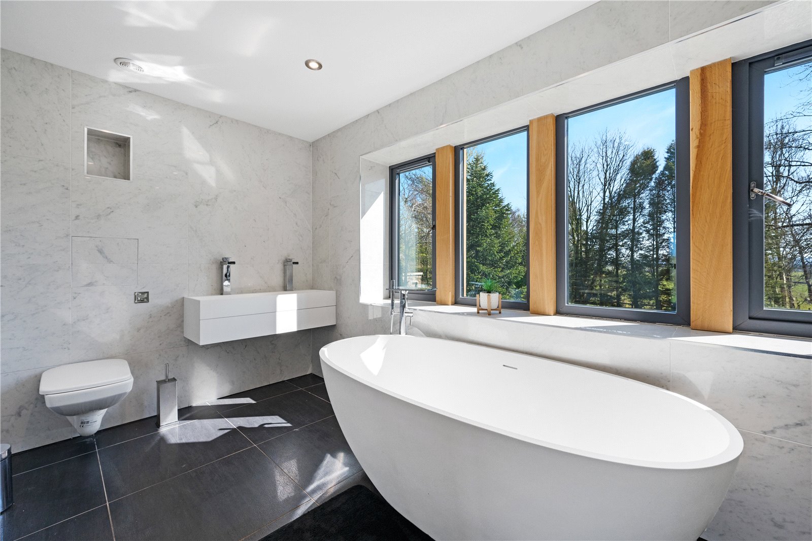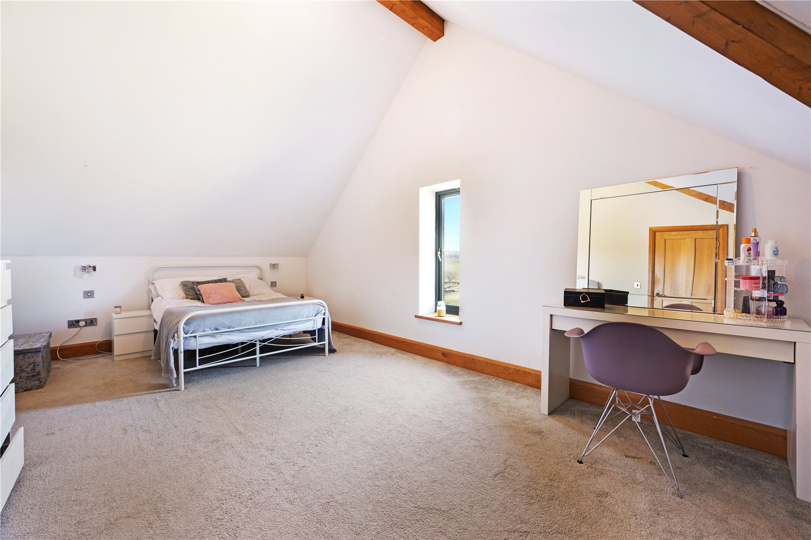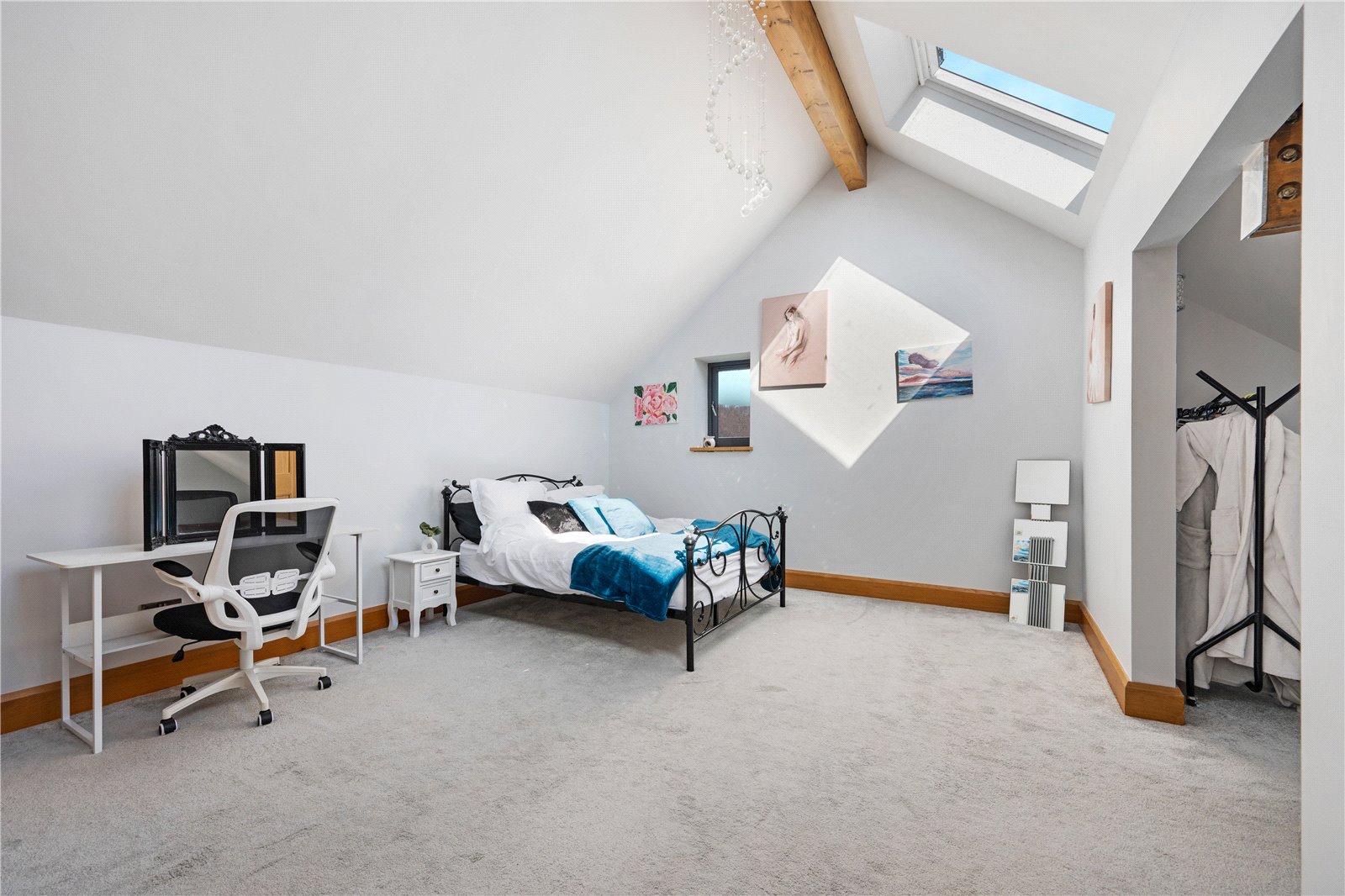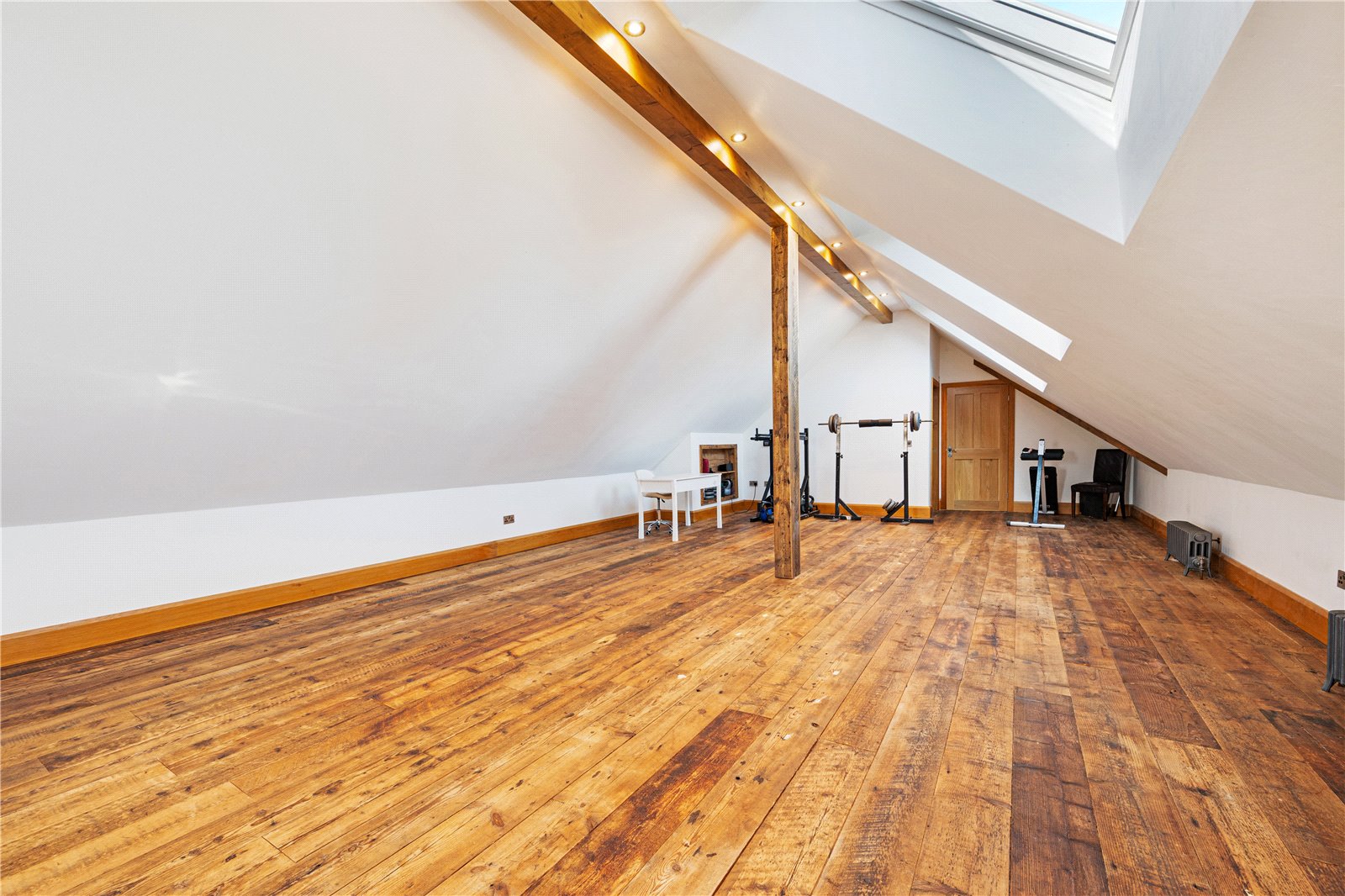The open-plan living/dining room is a focal point, with a stone fireplace and two sets of multi-fold doors opening onto the gardens. Flowing from this, the handcrafted oak kitchen by Scorton Sawmills is fitted with quartz surfaces, integrated appliances, and an island with seating, complemented by multi-fold doors to the garden. A utility room and plant room complete the ground floor.