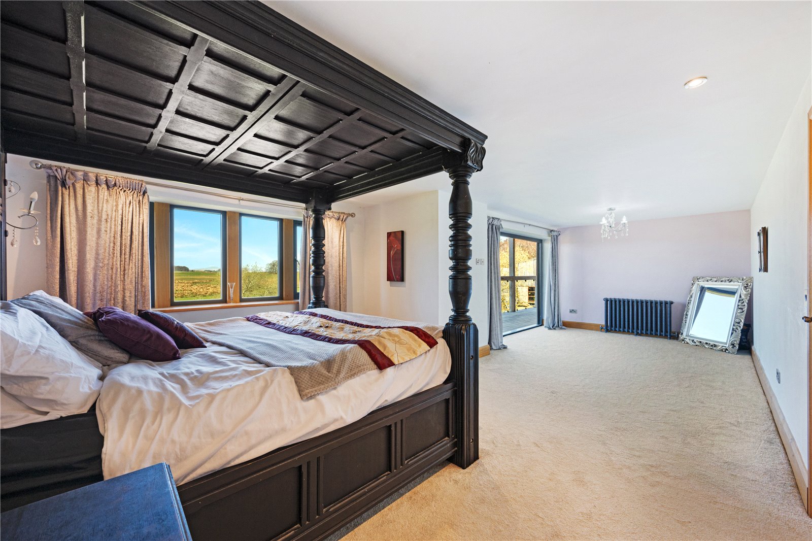 Upstairs, the principal and second suites both feature walk-in wardrobes, luxury en-suites, and multi-fold doors to a colonial-style balcony with panoramic Ingelborough views. A further en-suite double bedroom and a family bathroom with freestanding bath complete this level.