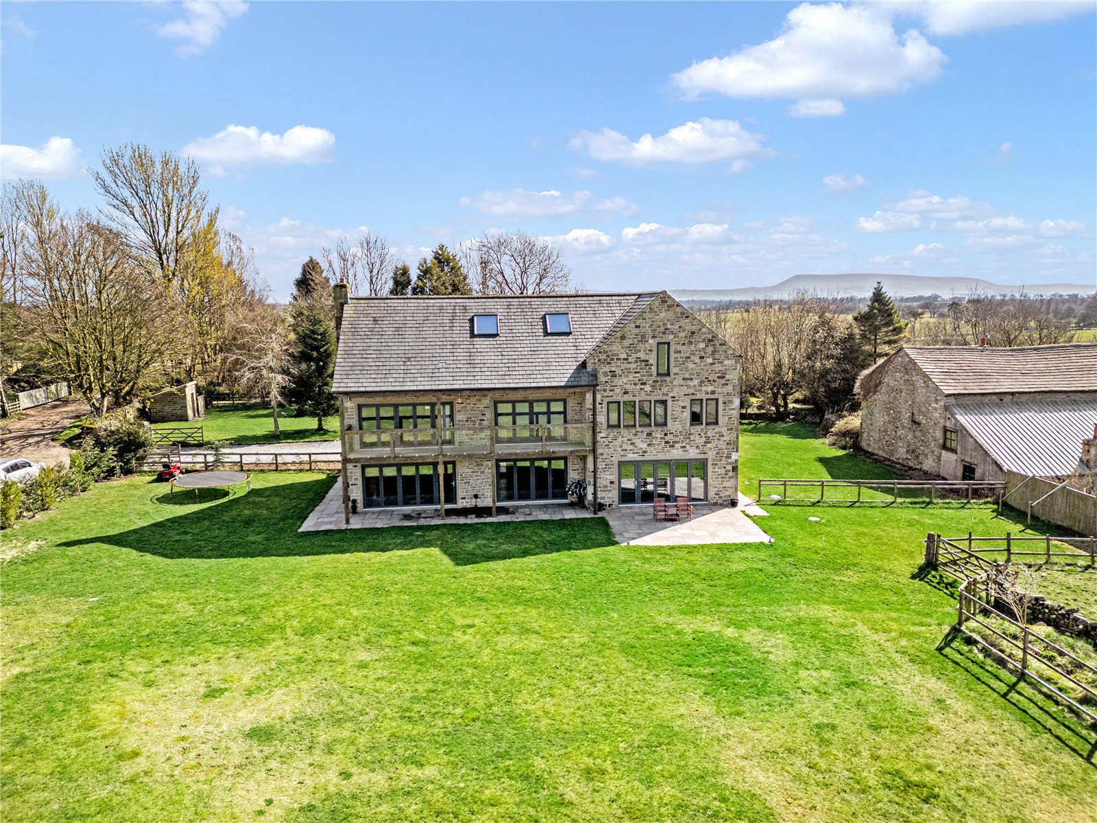Outside, a slate-chipped driveway leads to a double garage with ample parking. Extensive lawns, patios, and a rear field extend the lifestyle appeal, while the land also generates rental income. There is potential to add stables, which could increase field rental income and attract an equestrian Airbnb or retreat, further enhancing the property’s commercial potential. From the track and surrounding grounds, views of Pendle Hill can also be enjoyed. The home is virtually passive thanks to an air-source heat pump, with the opportunity to add solar panels for even lower running costs.
