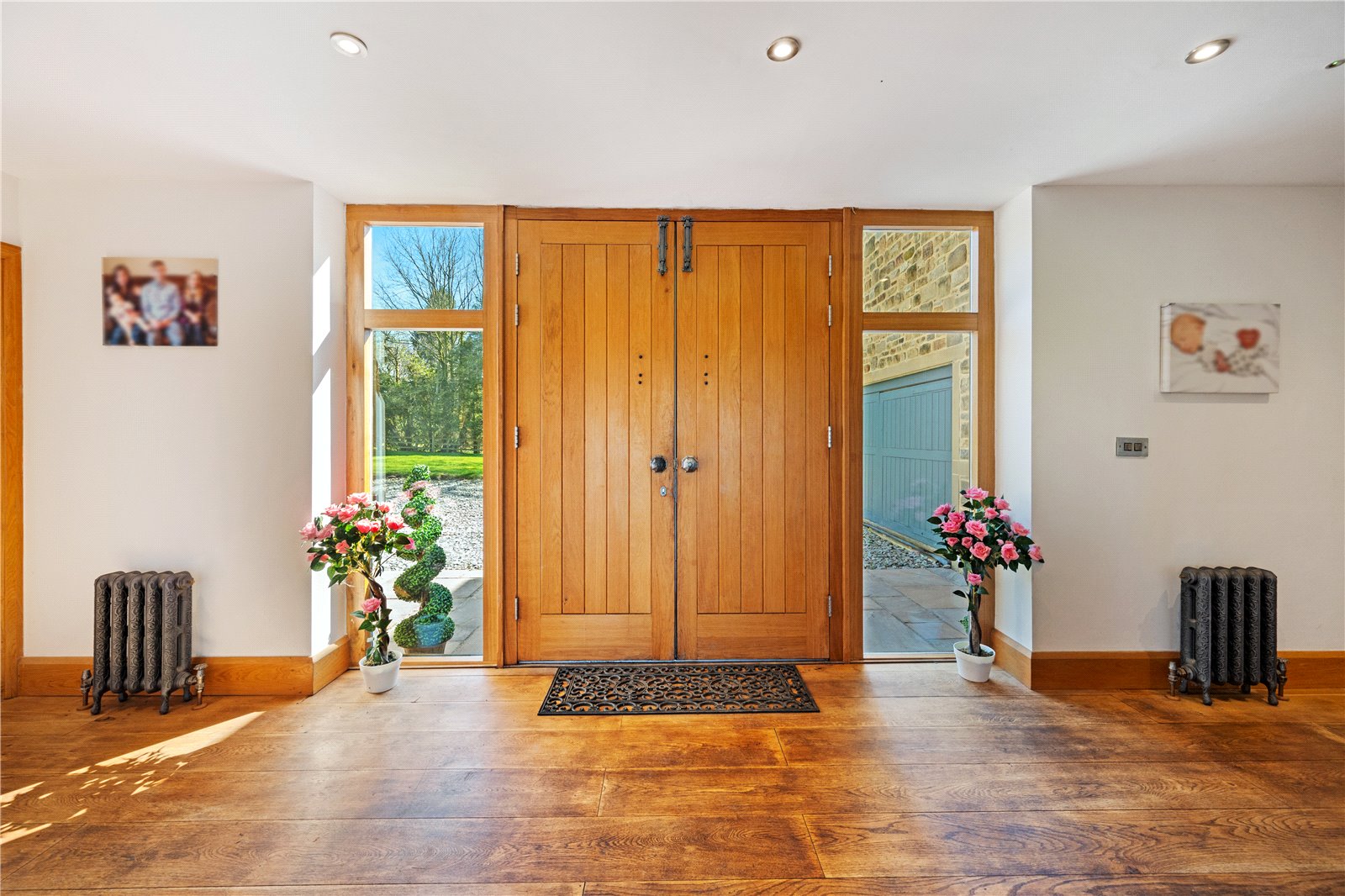 A welcoming oak-framed reception hall with wide-board oak flooring leads to a cloakroom, WC, and versatile snug, ideal as a study or playroom. A bespoke oak staircase rises to the first floor, while natural light floods the hall from feature window lights.