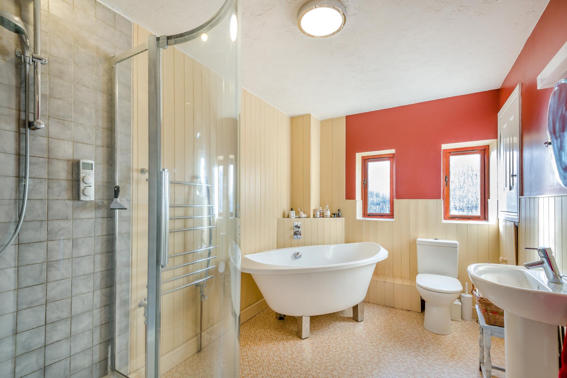 The bathroom is generous in size, and features a large corner shower cubicle with Mira platinum digital shower, freestanding acrylic bath, wash basin, W.C, heated towel rail and storage cupboards.