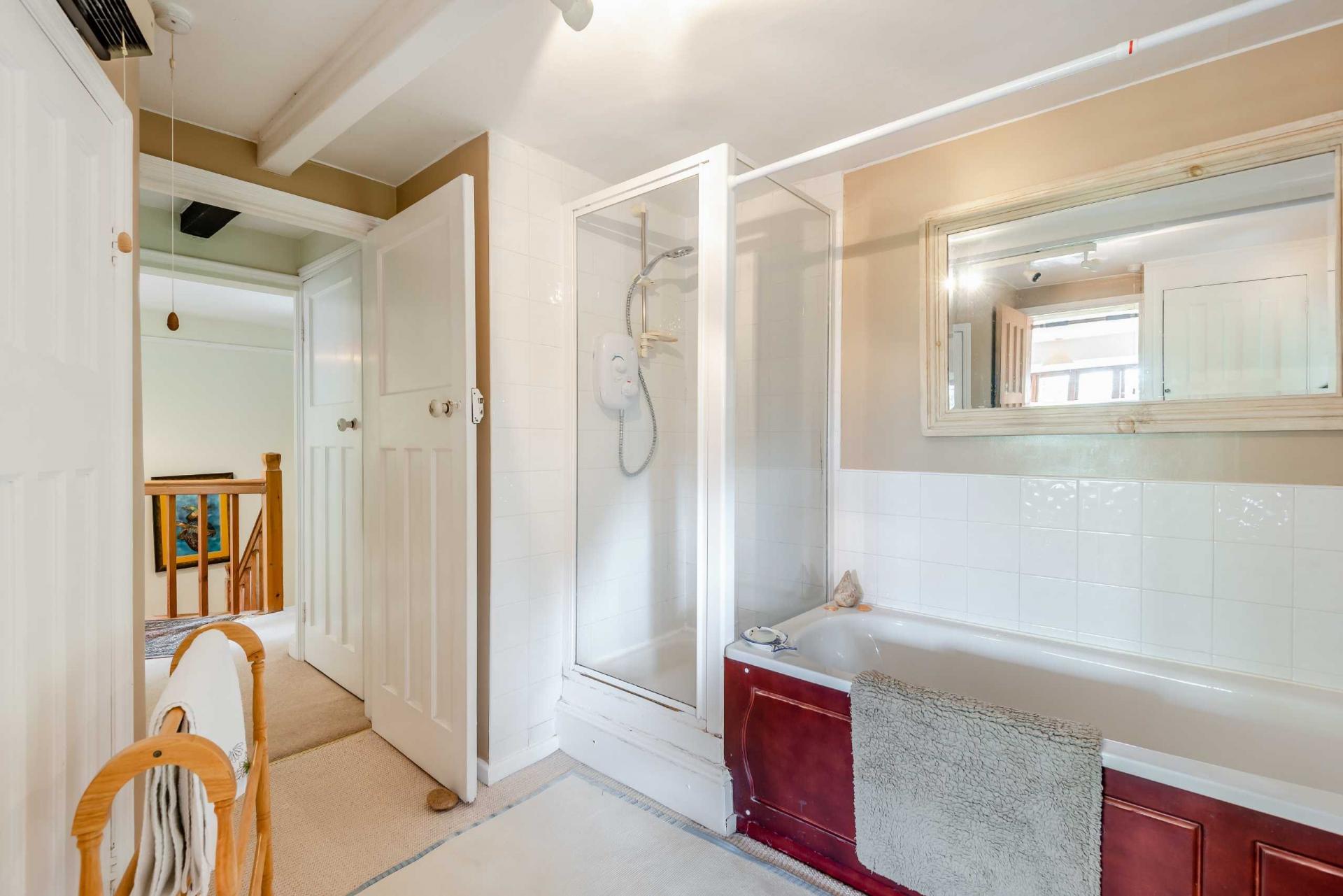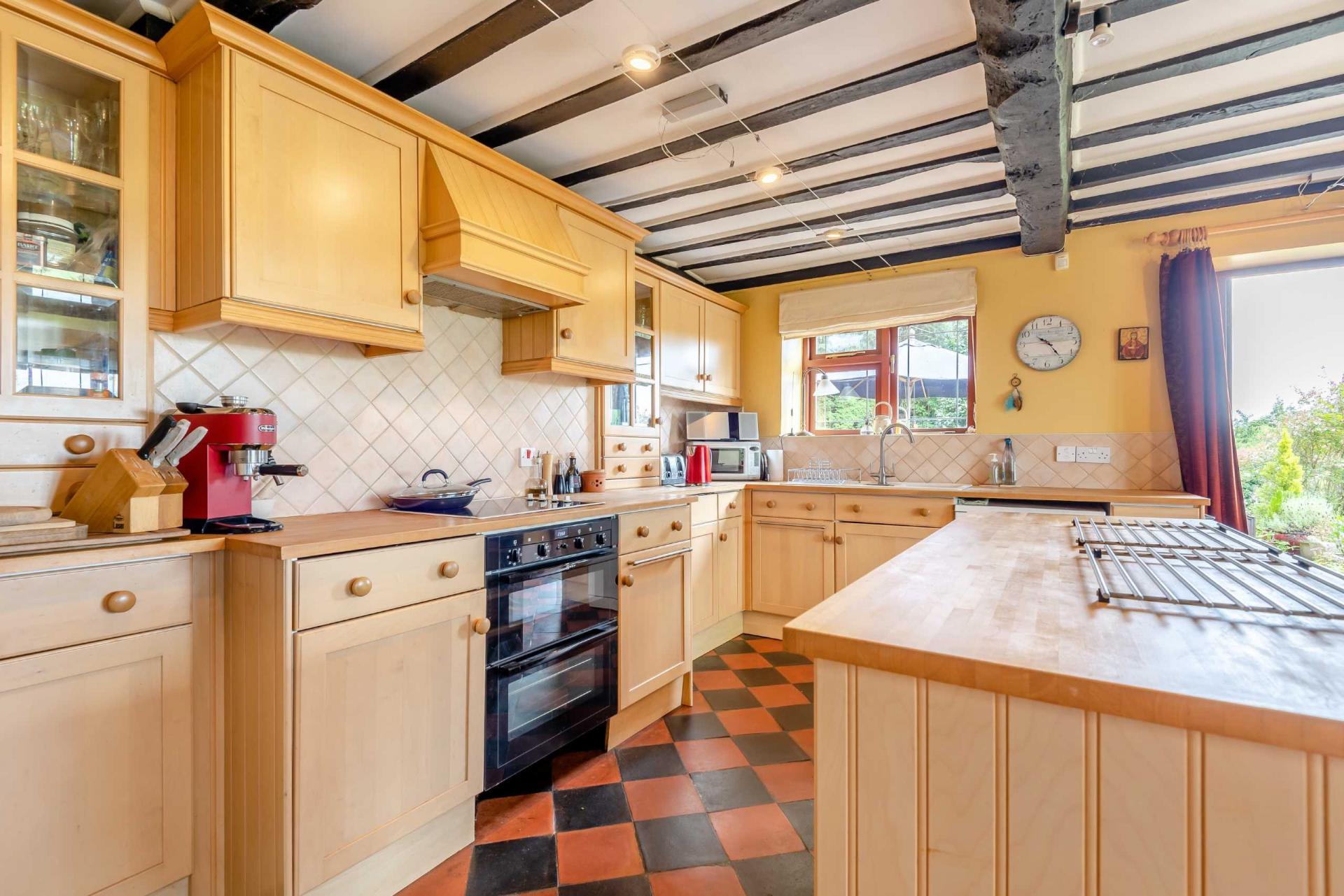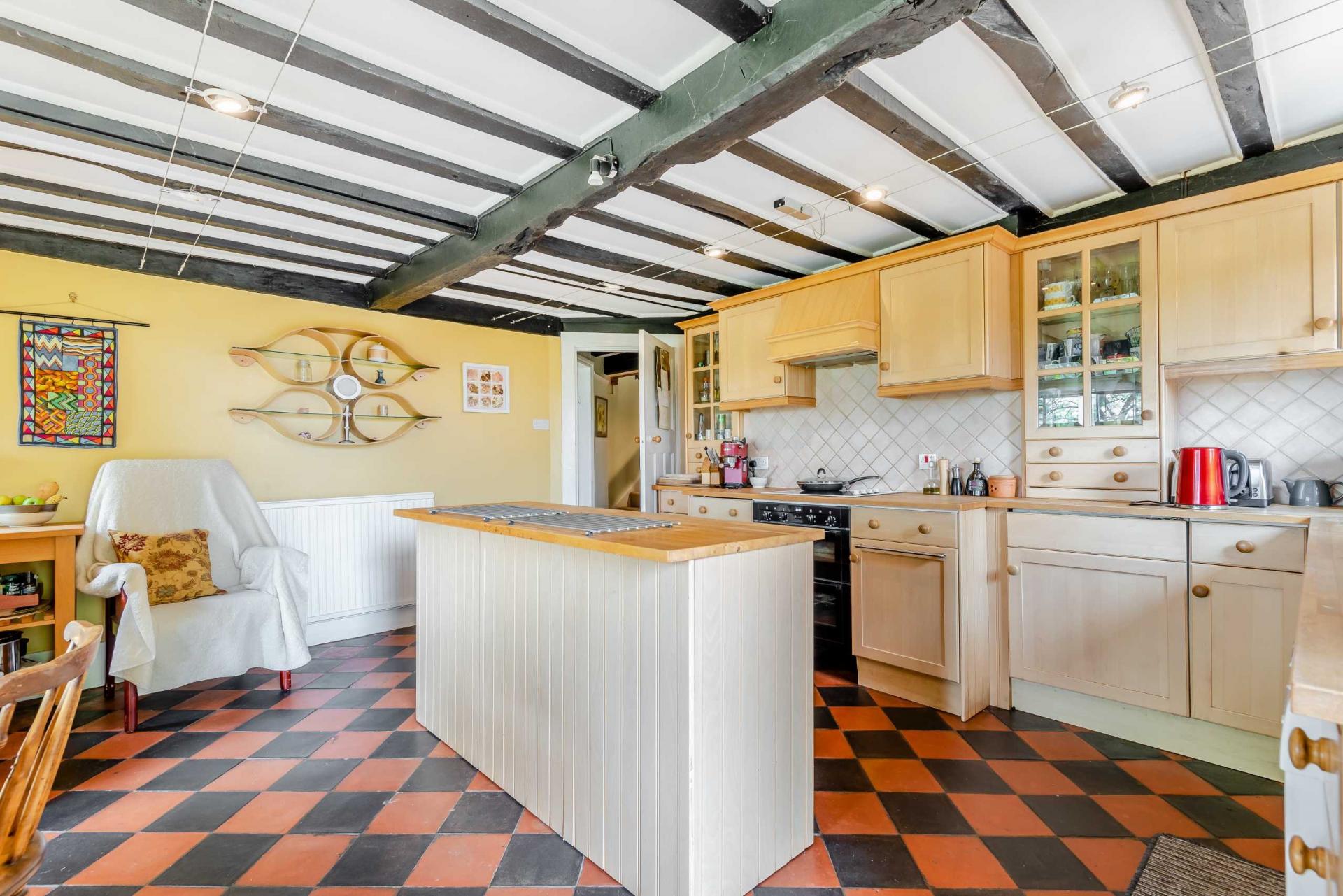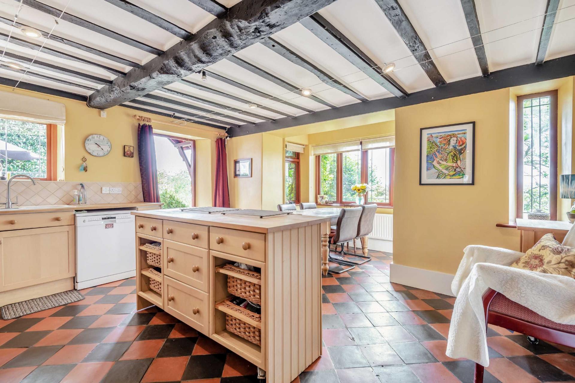 The main entrance to the property leads into the kitchen-dining room, a lovely, bright and open space, with exposed beams to the ceiling and a dining area to bay window offering a pleasant outlook to the front of the property. The kitchen itself features a central island with worksurfaces and storage space, as well as a main L shaped kitchen with space for appliances.