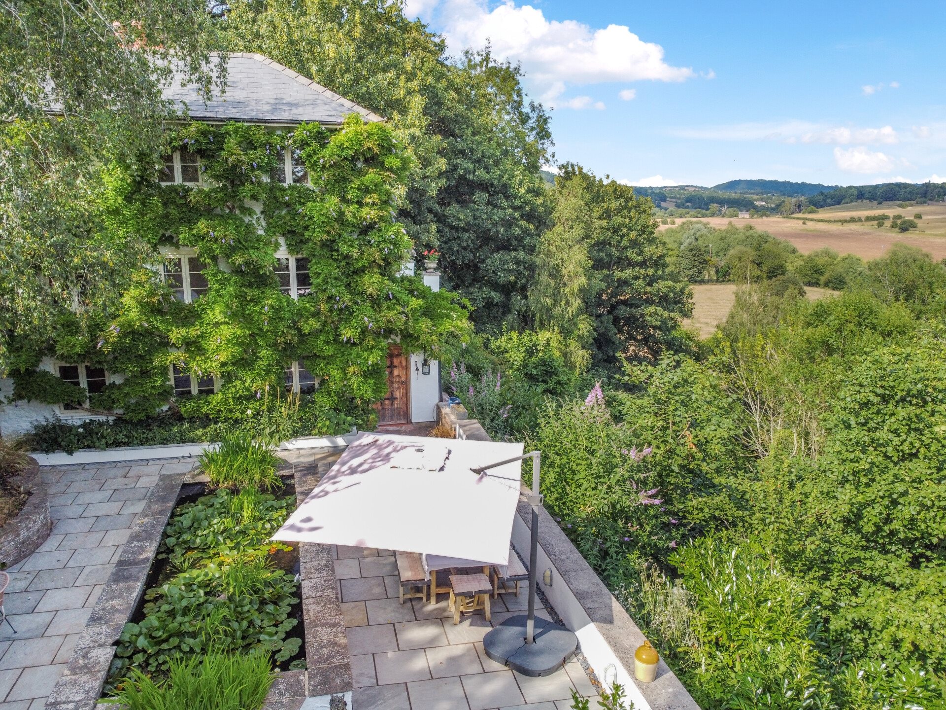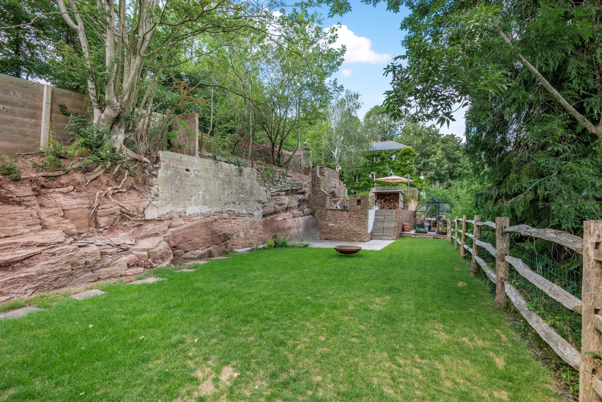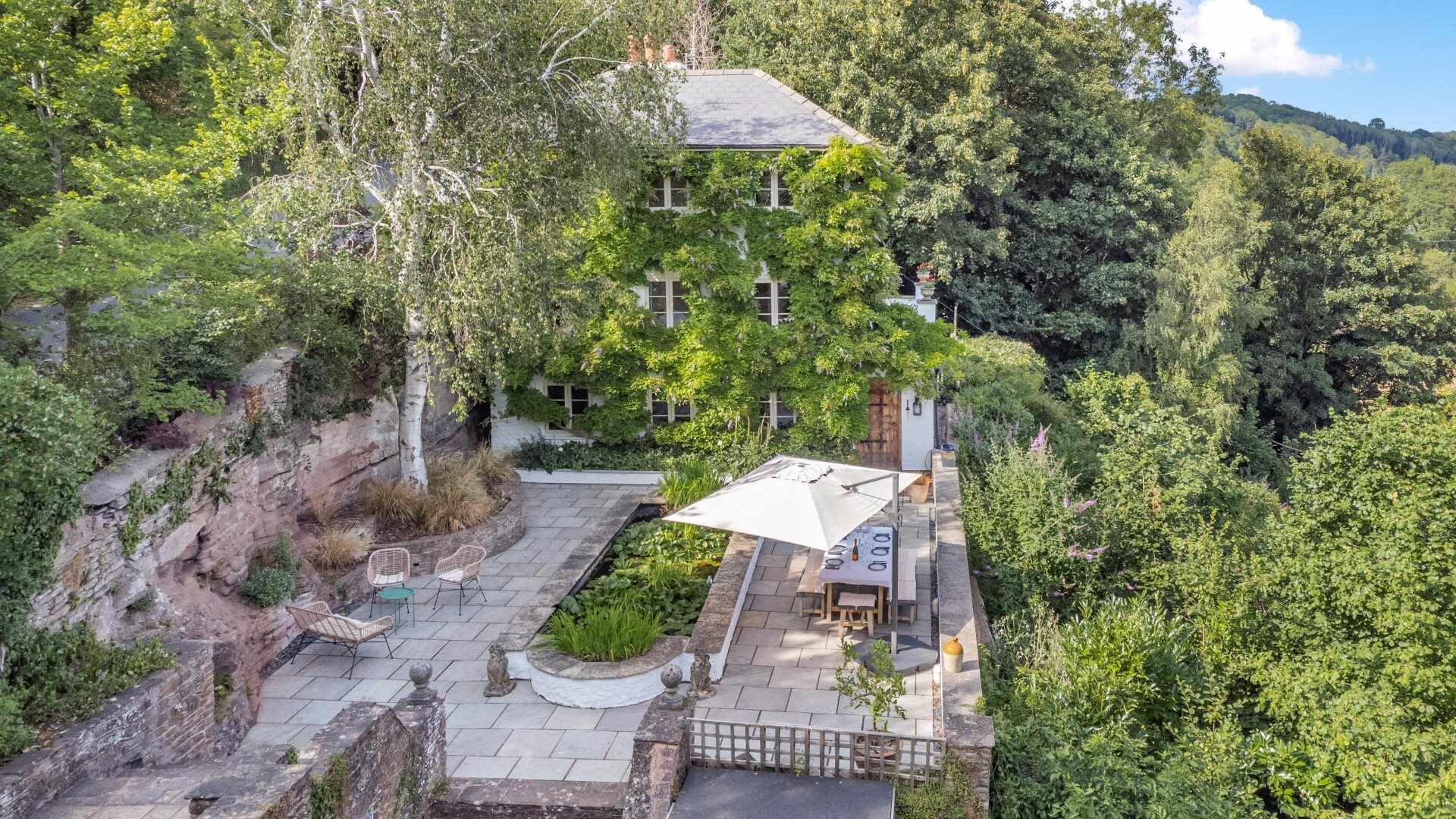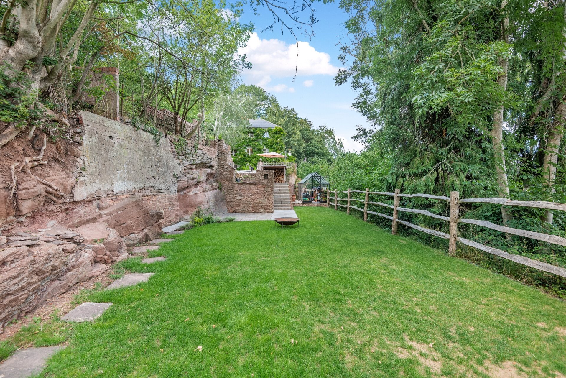To the rear of the house is a second, smaller courtyard area, which leads into a section of native woodland, with additional garden sheds and steps leading up to one of the parking areas.