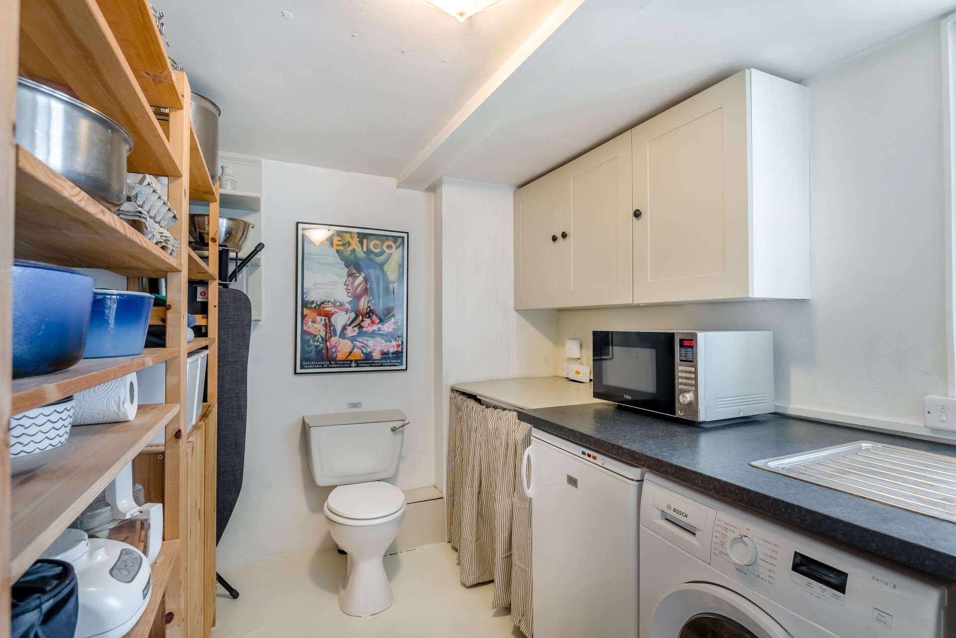To the far end of the kitchen is a pantry, and two openings leading into the snug, which provides another lovely space for reading and relaxing, or possibly home working if desired. From here there is also access into the utility room, which has additional cupboards and worksurfaces, as well as a W.C and wash basin.