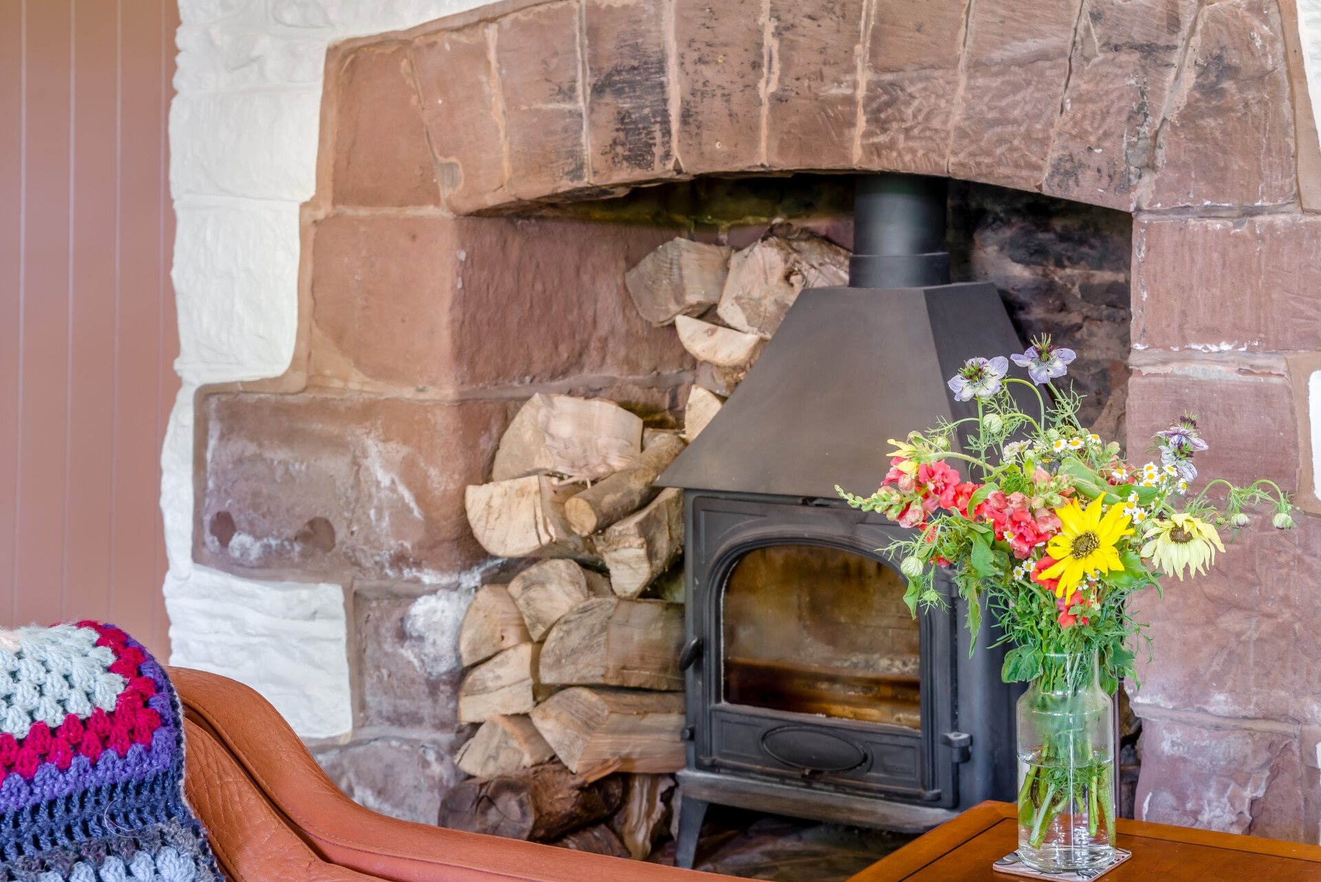 The living room is full of old period charm, with beautiful flagstone flooring, exposed stone walls, fireplace with woodburning stove, fitted bookshelves to the far walls and windows looking out to the front courtyard.