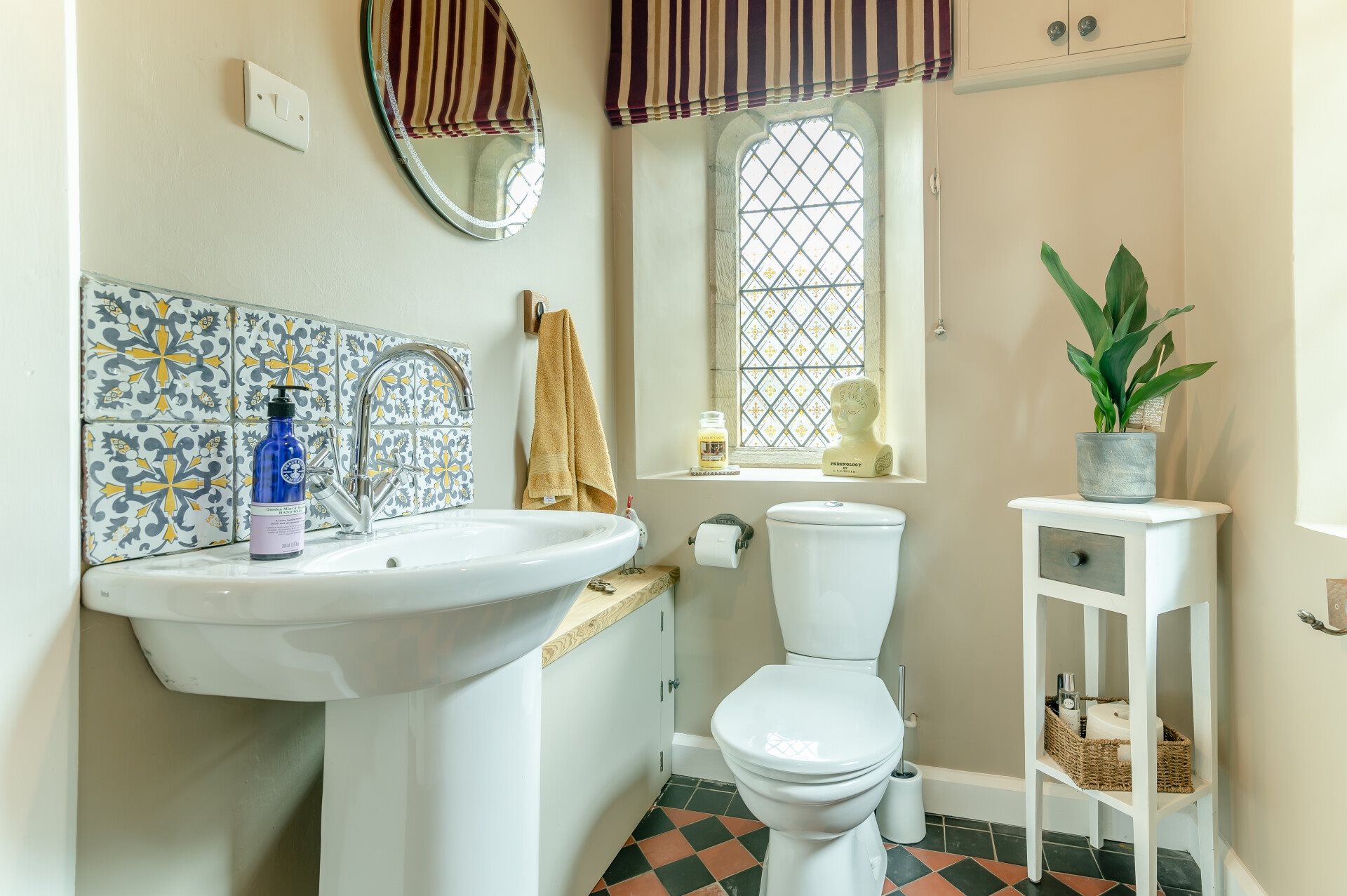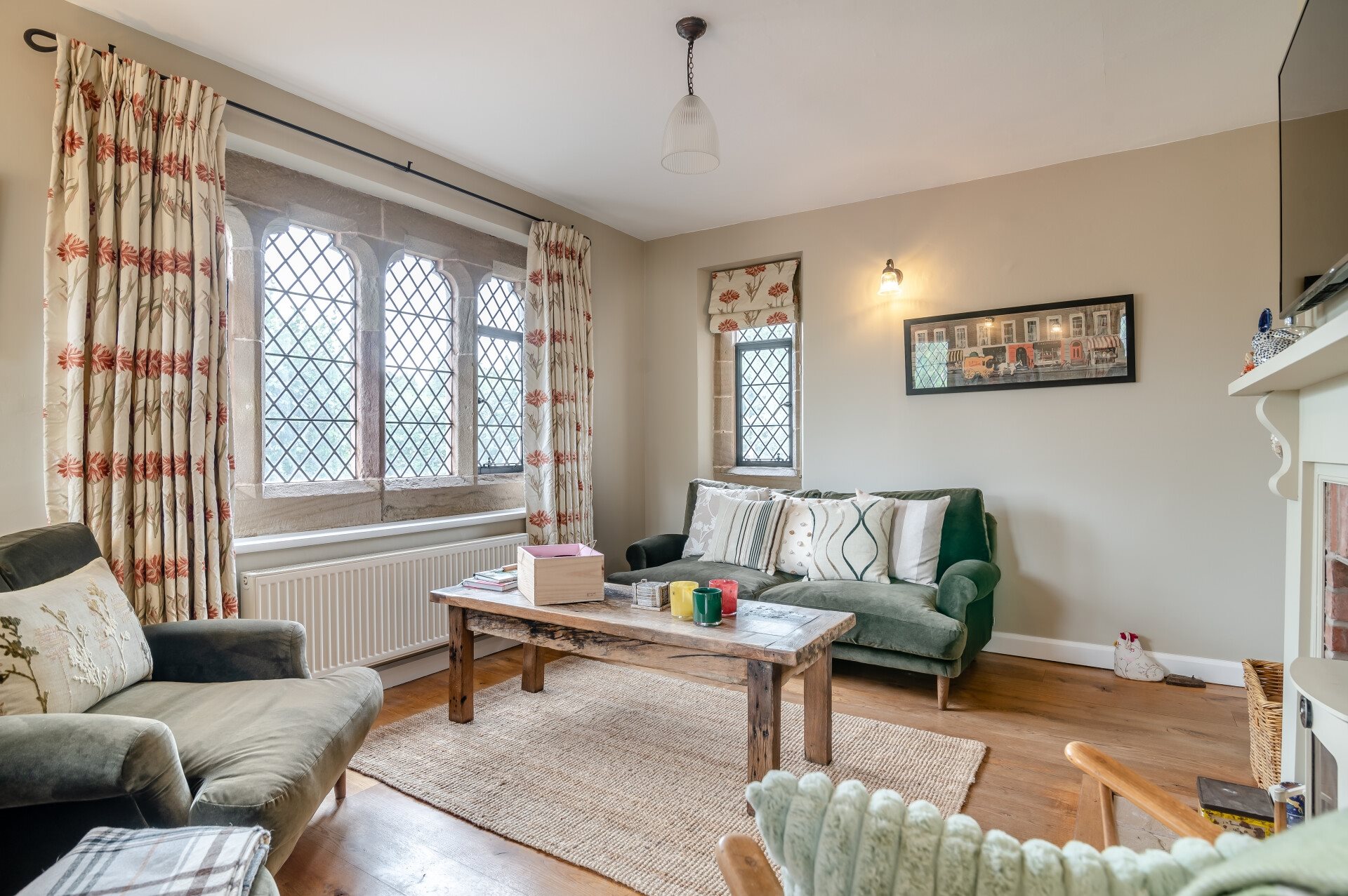 Characterful details include solid oak doors, mosaic tiled flooring, oak floors, and original stone mullion windows with lattice patterns.