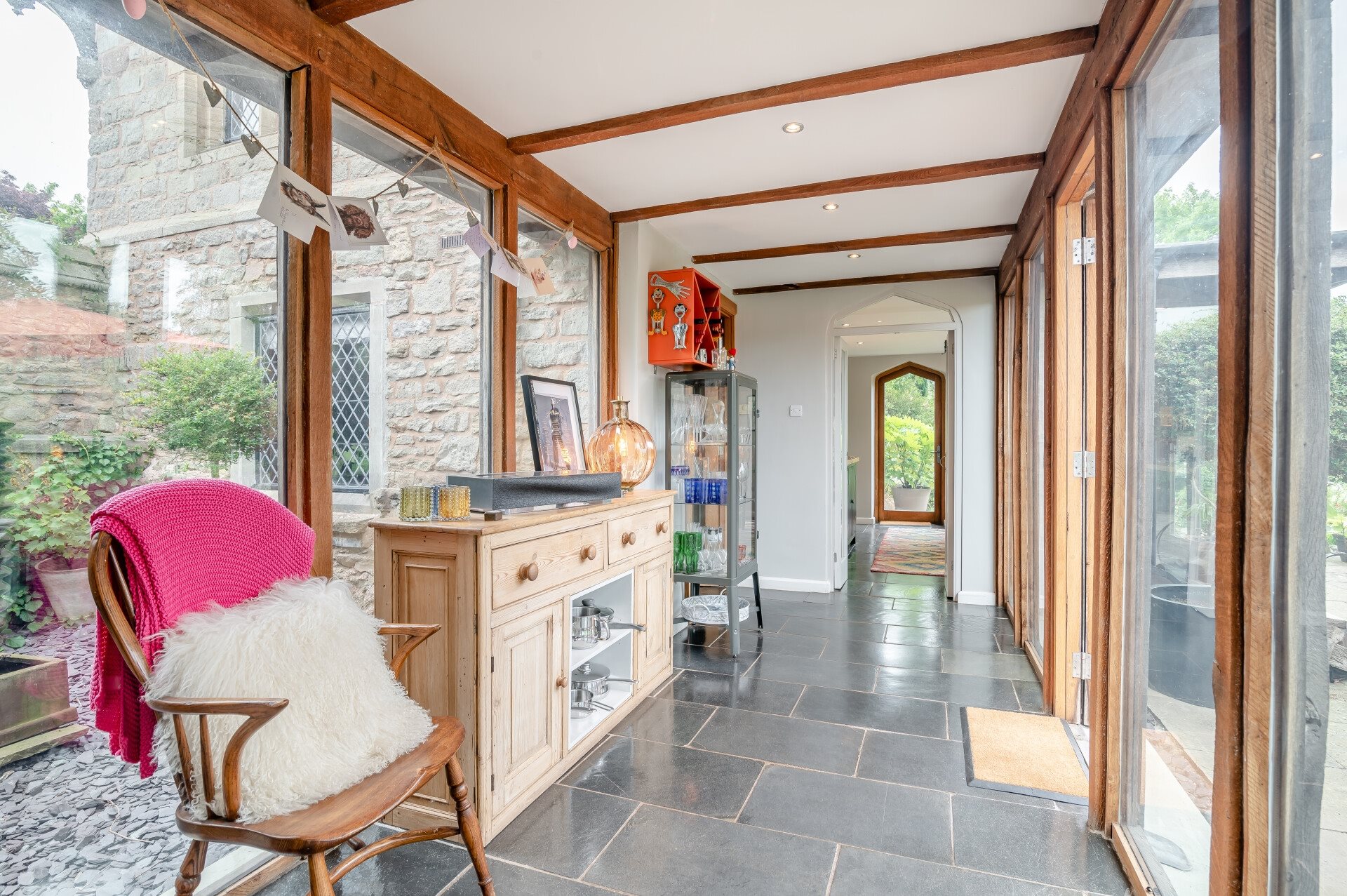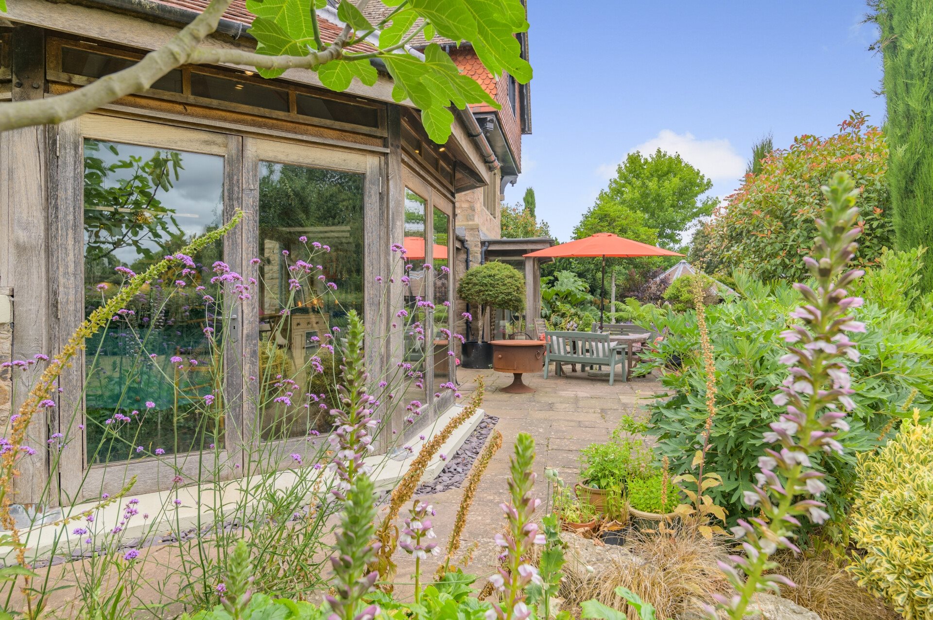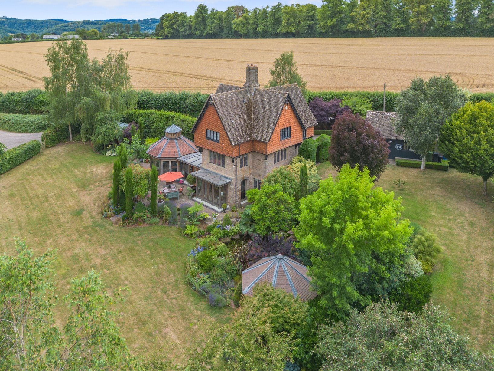 The dining room and bespoke kitchen breakfast room feature floor-to-ceiling glazing, filling the space with natural light and views over the beautifully tended gardens and Herefordshire countryside. The kitchen boasts a vaulted atrium ceiling, central breakfast island, and connects via a glazed walkway to a snug with its own sitting area. Additional accommodation includes a boiler/utility room, understairs cellar, and cloakroom.