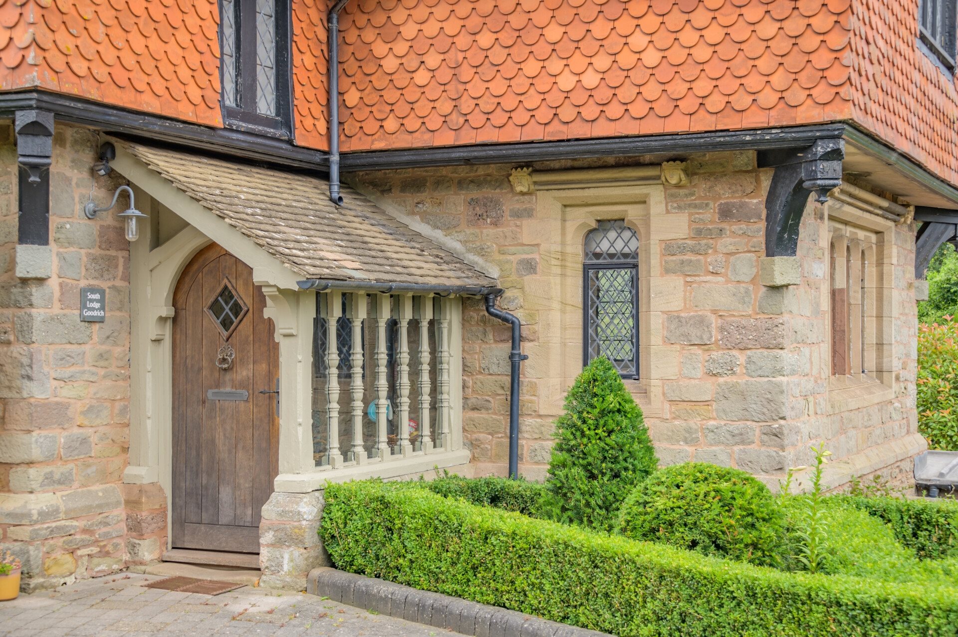 The front of the lodge is far from modest, featuring the carefully crafted heads of former ownersan extraordinary nod to tradition and the property's rich history. Steps beside the house lead down to a patio that wraps around the rear, offering lovely views across the neighbouring fields and the gardens.