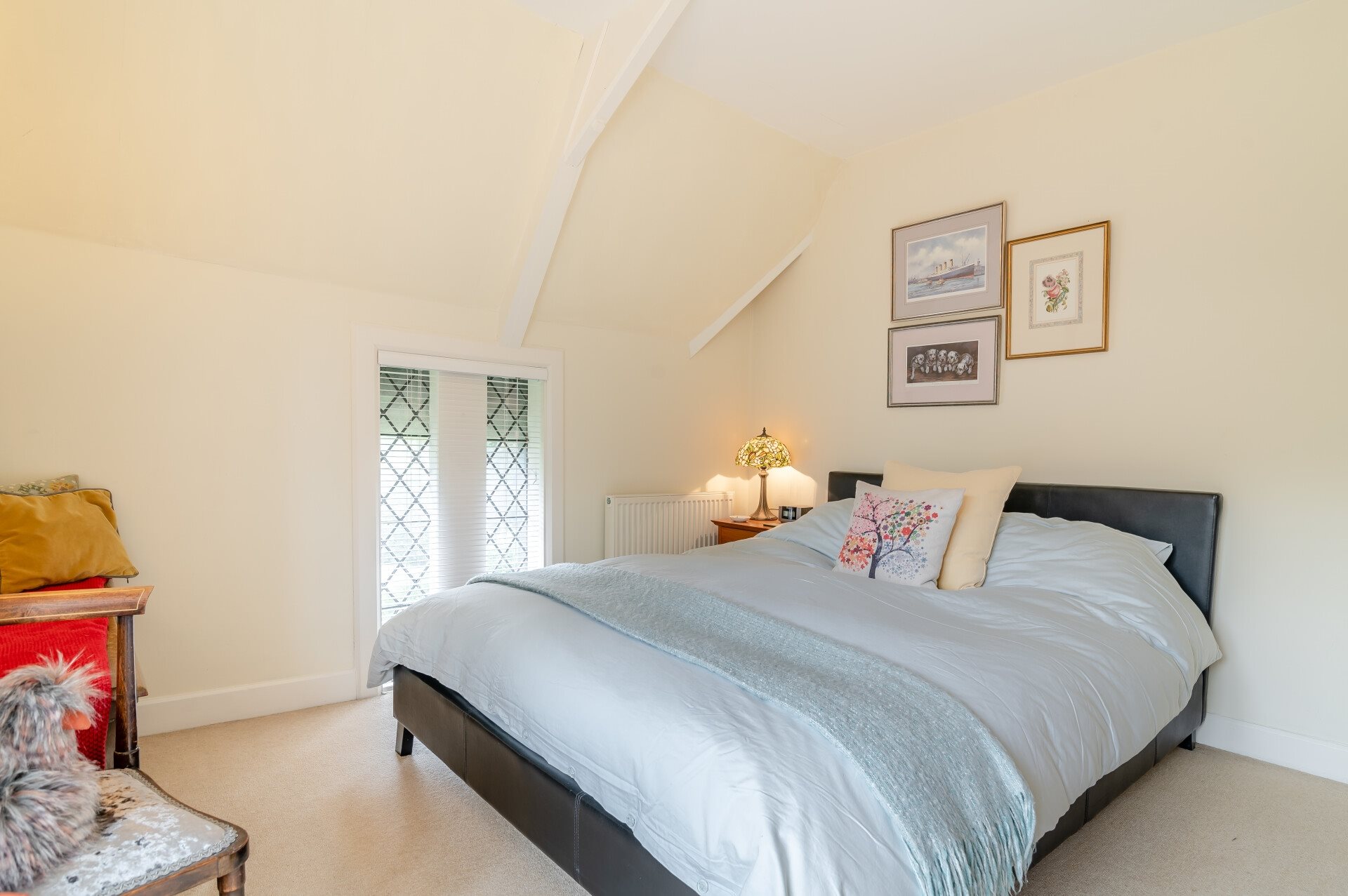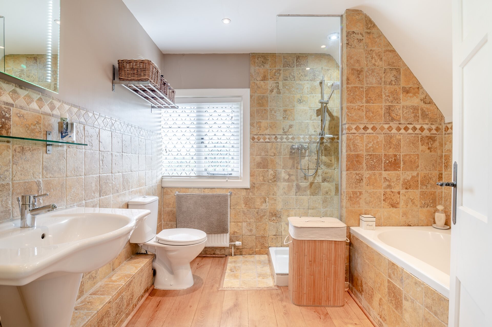 Upstairs, a bright landing leads to four double bedrooms and a family bathroom. The generous main bedroom accommodates a king-size bed and sofa, complemented by a luxury ensuite with a shower cubicle.