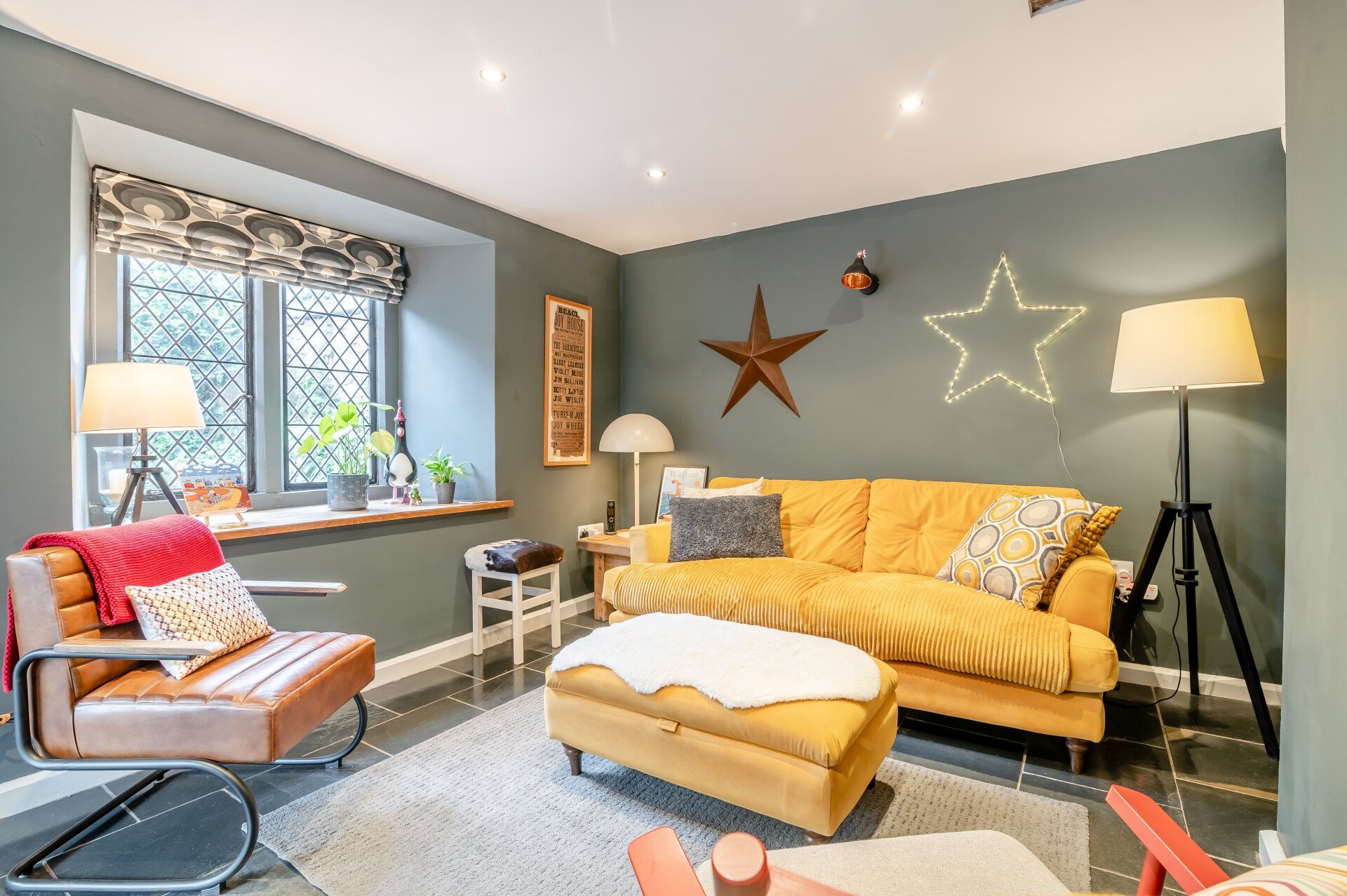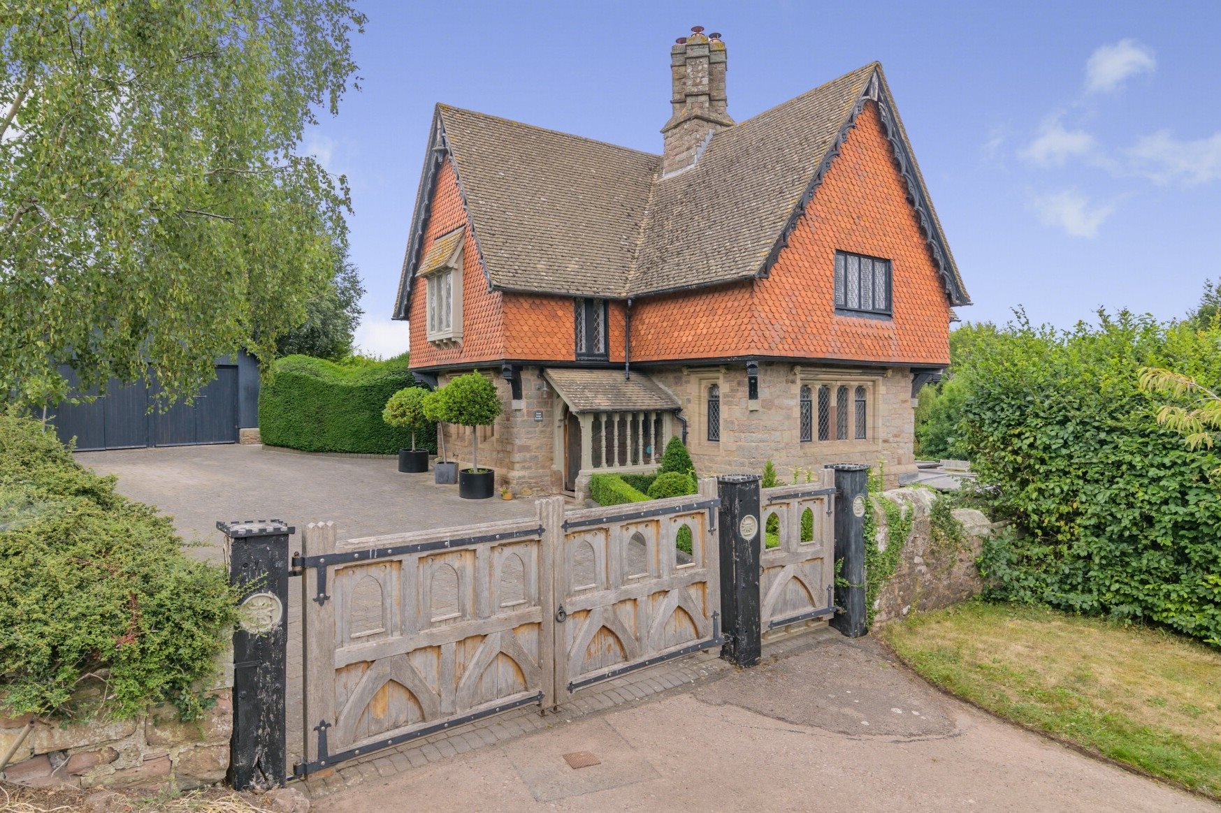 This distinctive stone and timber-framed former gatehouse to Goodrich Court, dating from circa 1850, blends period character with contemporary living across three floors. The central hallway leads to two versatile reception rooms, including a dual-aspect sitting room with a clear-view wood-burning stove and a home office overlooking the grounds.