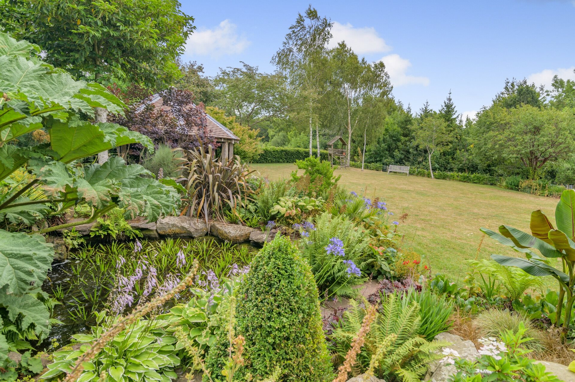 An ornate water feature nestles among vibrant flower and shrub beds, creating a peaceful spot to watch the many species of wildlife that visit the gardens. The extensive lawns are immaculately maintained, dotted with mature trees, flanked by mature hedging, and complemented by two covered entertaining areas, one of which is used as an outdoor kitchen.
