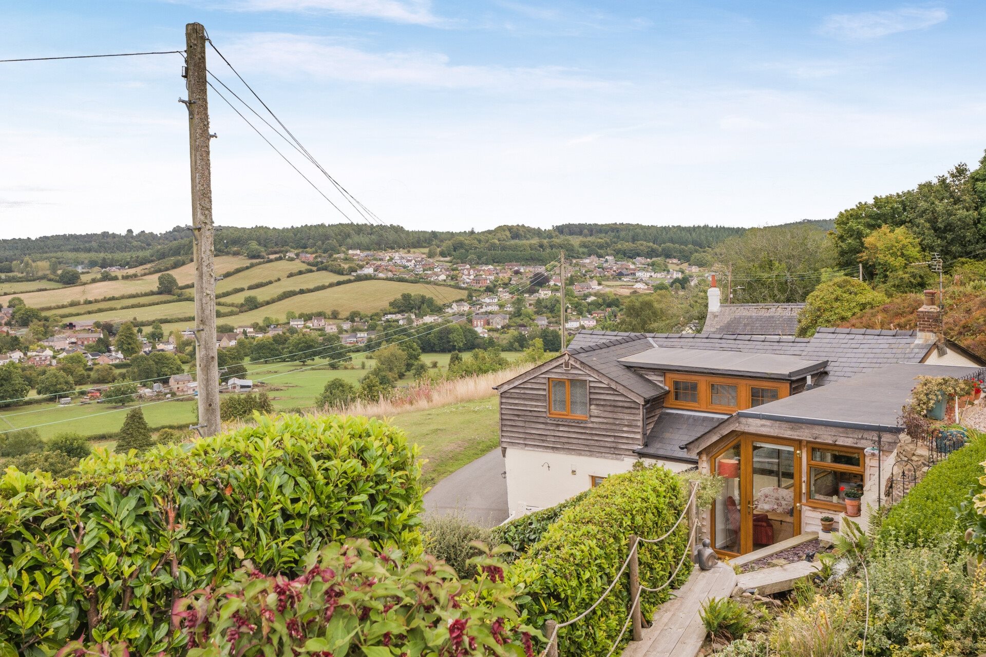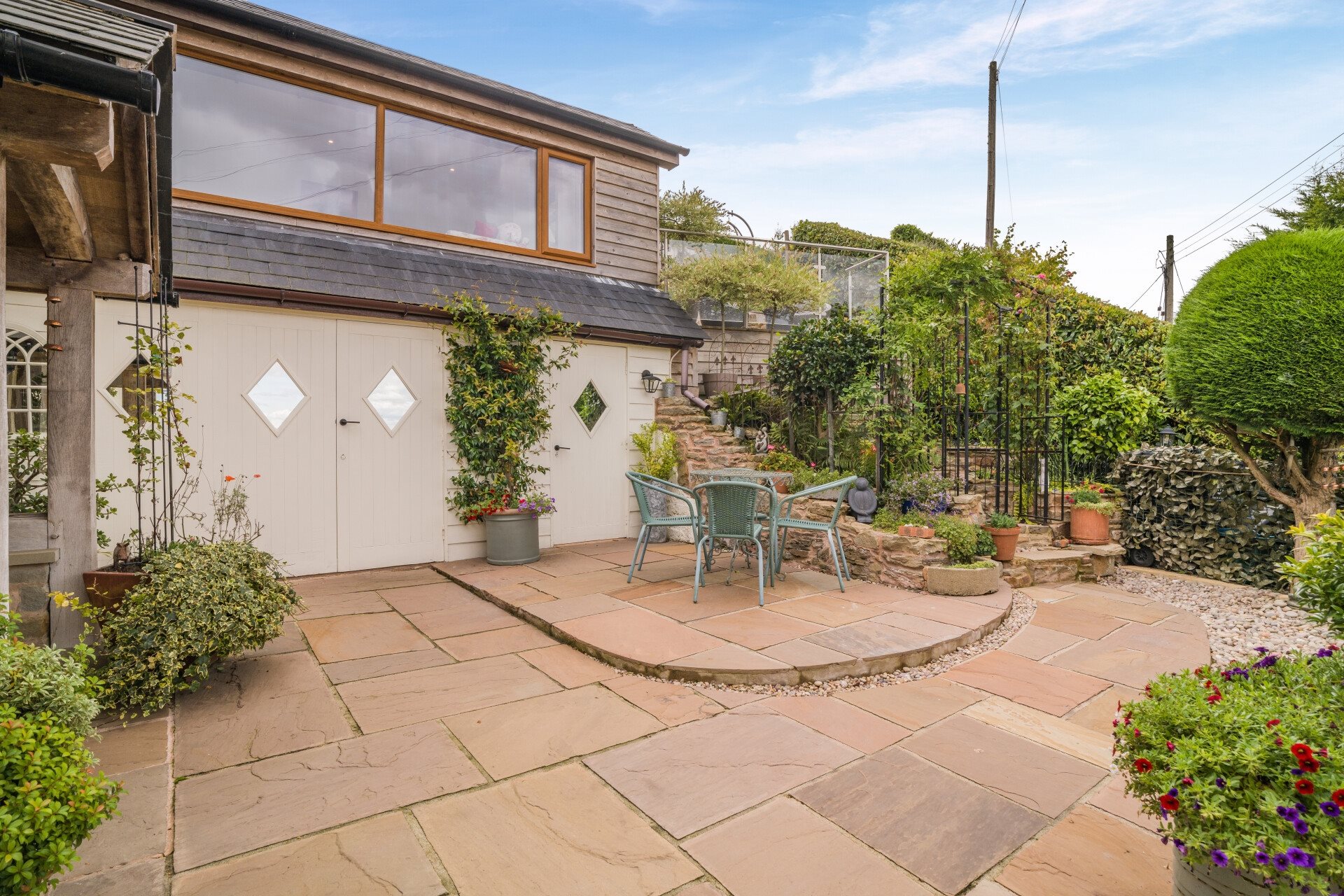 Outside - Every inch of this beautifully landscaped garden has been thoughtfully designed, ensuring even the most unusual or challenging spaces are put to purposeful use. Tiered gardens of this quality, presented and maintained with such care, are a rarity. At the garden's entrance, a gated courtyard welcomes you, with stone steps leading to first floor deck, as previously mentioned. From here and passing a cascading water feature the garden ascends to a lawn, flower beds and summer house, offering a tranquil retreat at the top, where spectacular views stretch towards Drybrook, with a glimpse of The Malverns to the left.