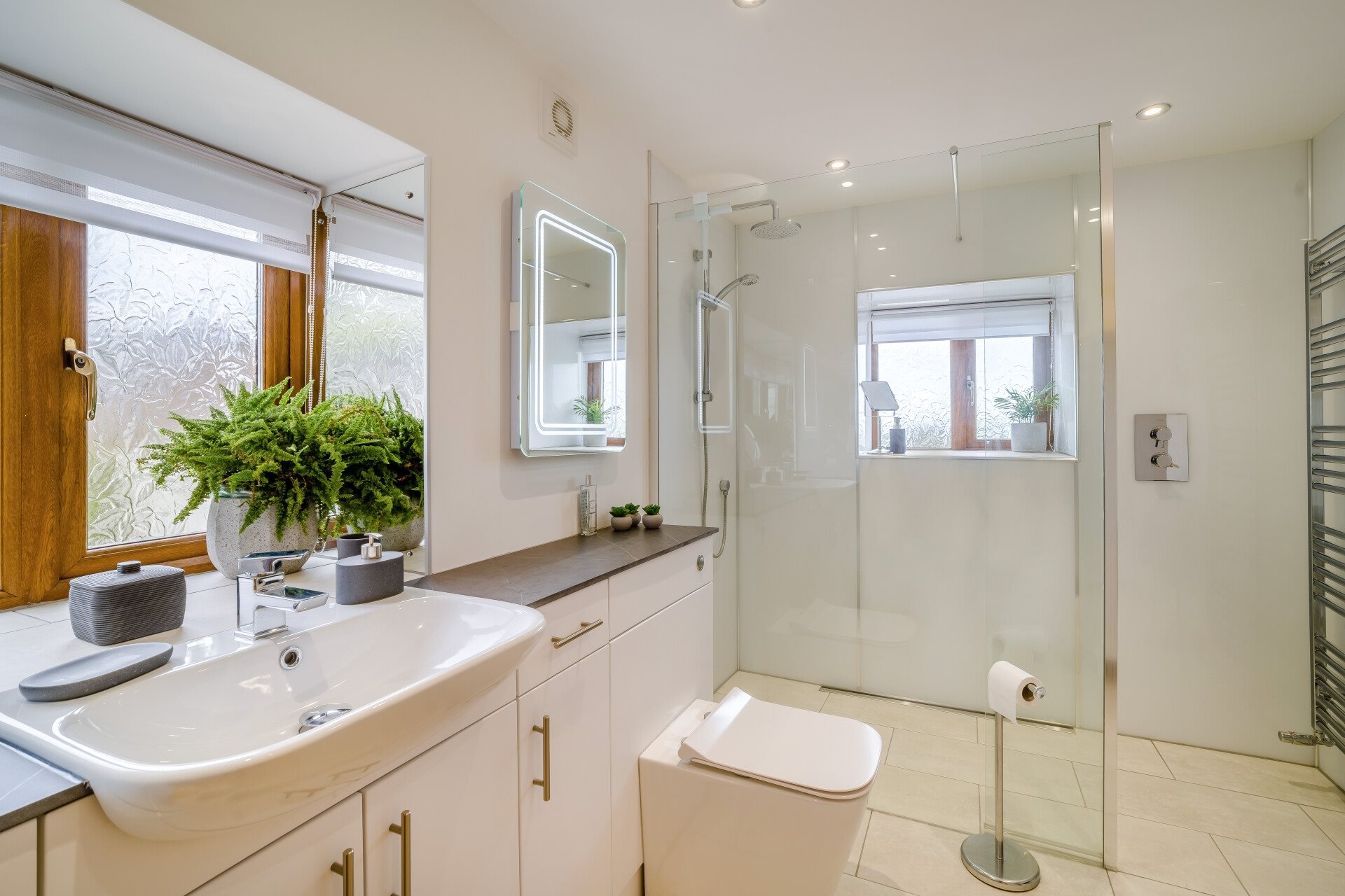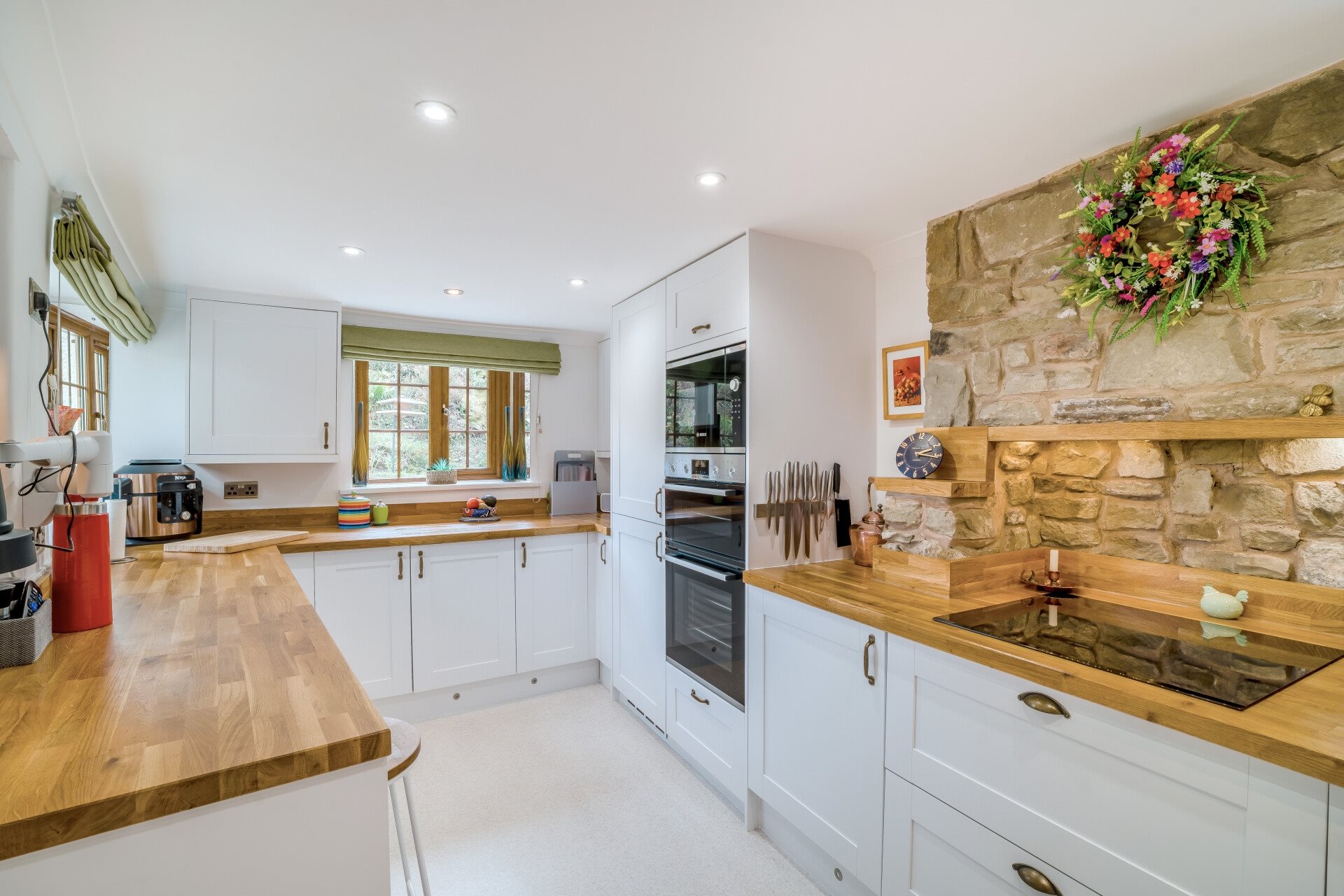 The kitchen, modernised around 2021, is fitted with shaker-style units, solid oak worktops, and a range of integral appliances including a microwave, oven and grill, fridge-freezer, dishwasher, and a Bosch hob cleverly positioned where the original fireplace once stood. This is a wonderfully bright room, enhanced by mirrors set into the window surrounds, which reflect natural light throughout. Plinth lighting adds to the modern feel, and there is ample space for a dining table.
