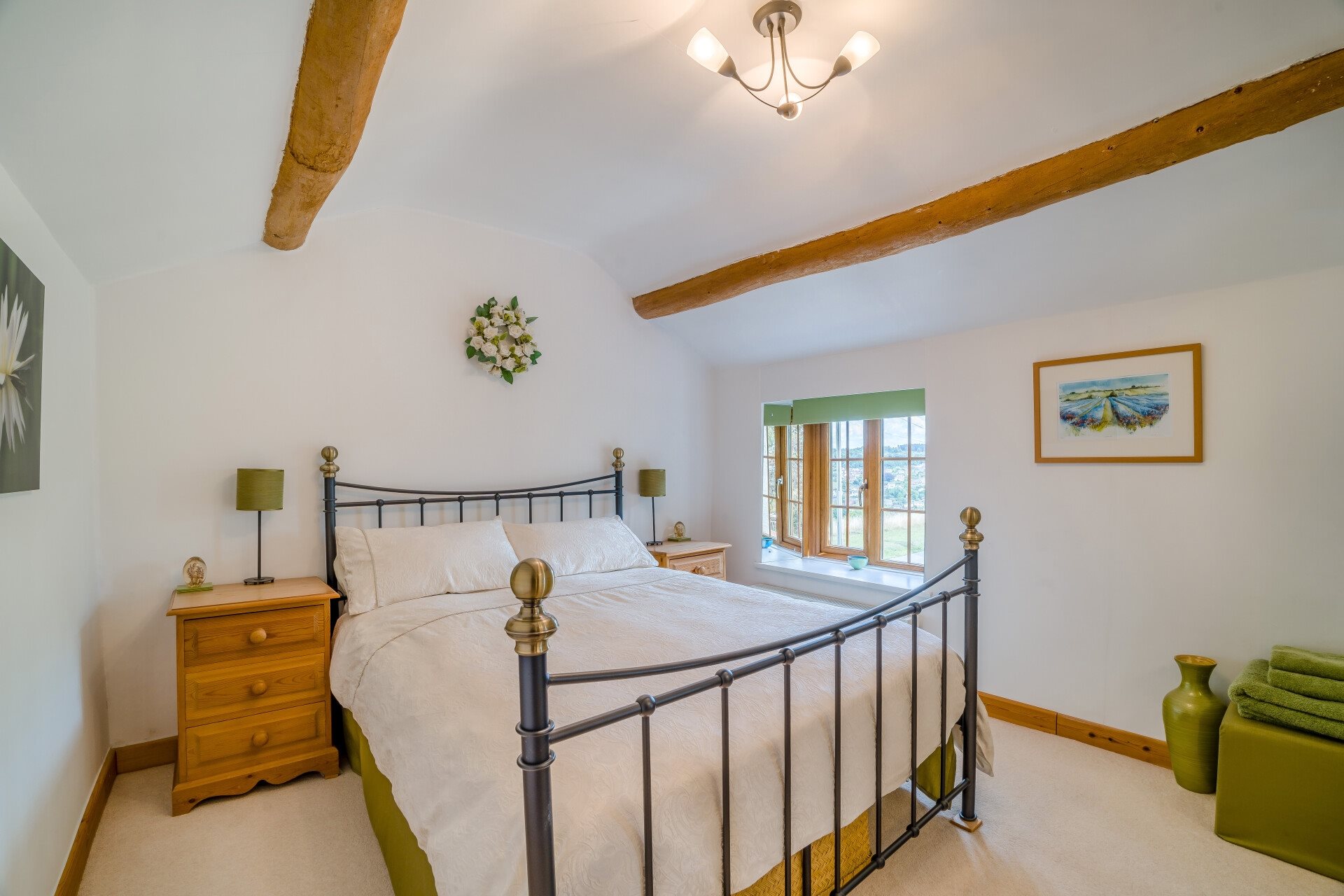 The ground floor also offers a versatile bedroom, equally suited as a reception room if preferred. Situated in the oldest part of the house, it features rustic ceiling beams that highlight its character. From here, a door leads directly into a stylish Jack and Jill shower room, which also connects to the hallway.