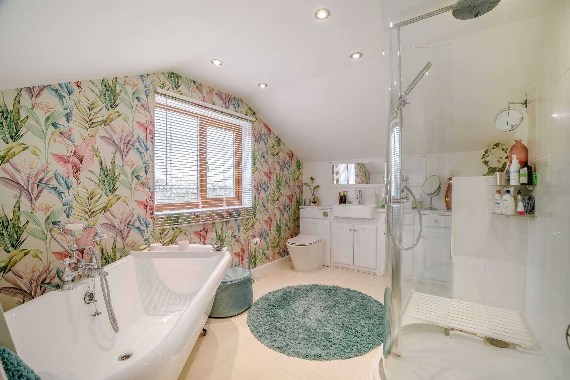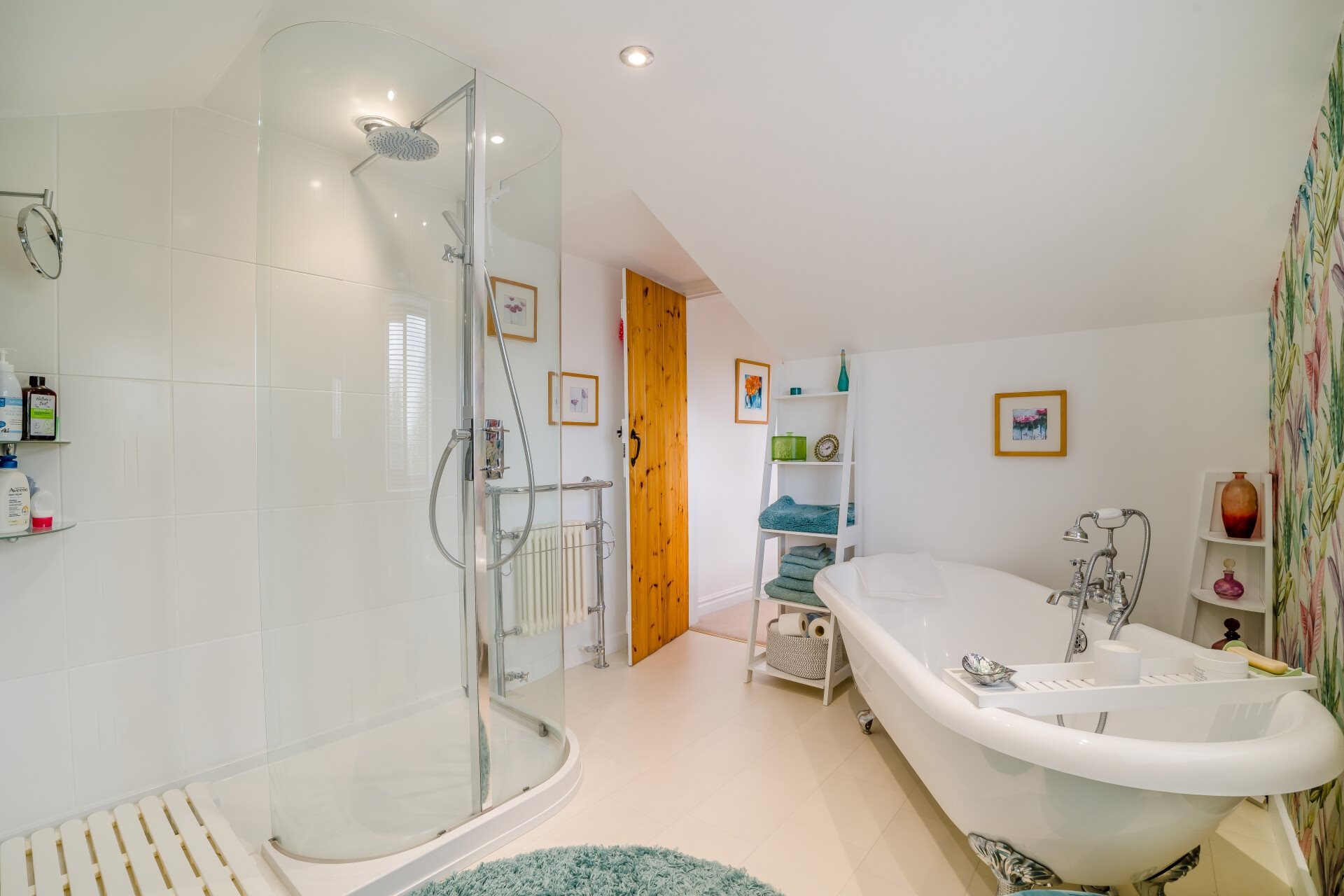 The property benefits from two staircases. The first rises to an open galleried landing overlooking the entrance hall. Here the character of the home is evident, with some low doorways that give way to bedrooms with full head height. On this level are three bedrooms and a beautiful family bathroom, complete with a luxurious Matki shower, ball-and-claw bath, WC, and vanity unit with inset basin.
