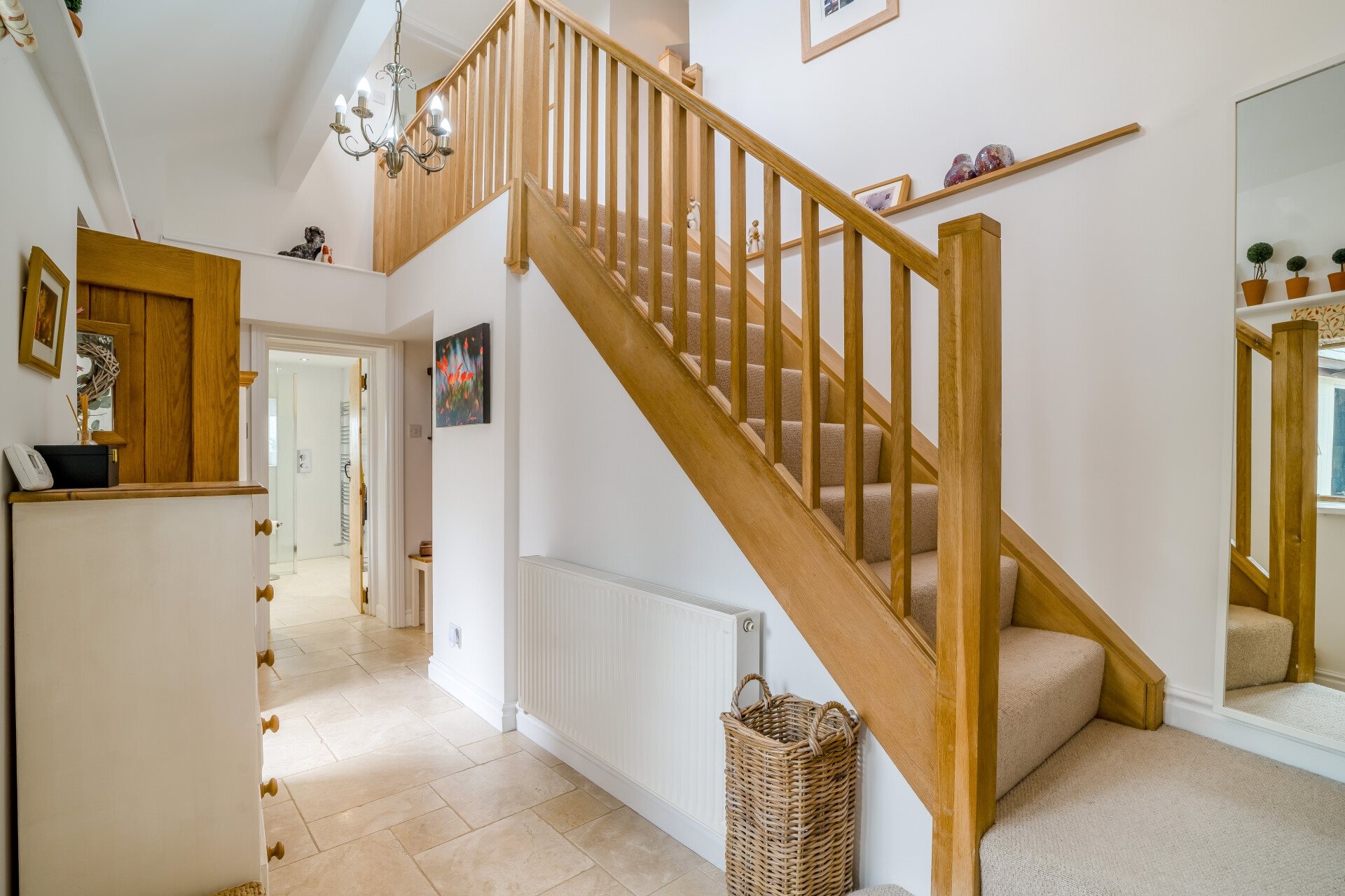 The entrance hall is centrally positioned, light and welcoming, with Mandarin Stone floor tiles that continue into the ground floor cloakroom. From here, the eye is drawn upwards to the galleried landing above, creating an impressive sense of space and flow throughout the ground floor.