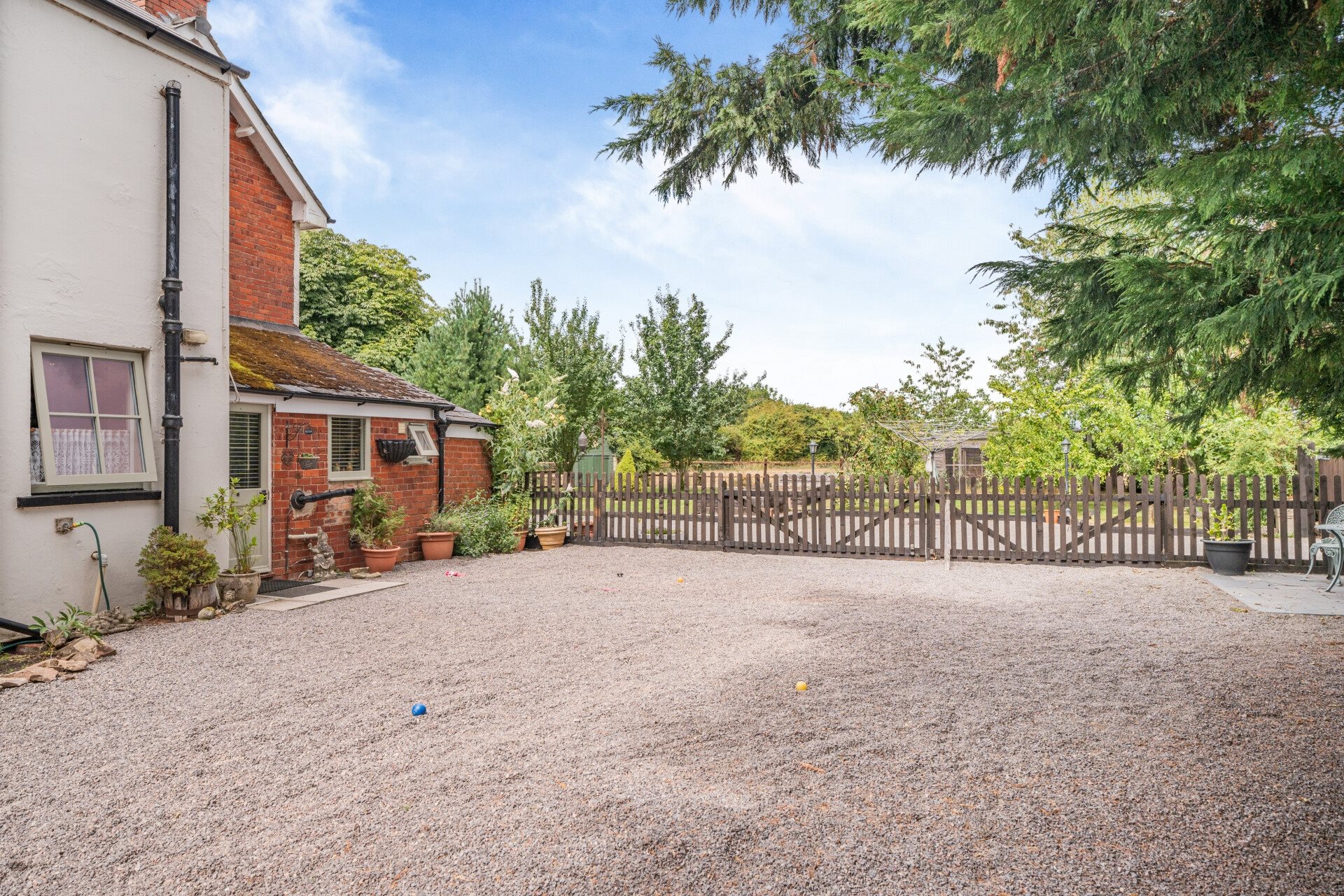 For equestrian or smallholding use, the all-year turnout is well equipped with four shelters, a hay store, and a feed room. A large horse chestnut tree provides natural shade over the yard and partial cover to the paddock, which is accessible via gated entrances from both the yard and garden.