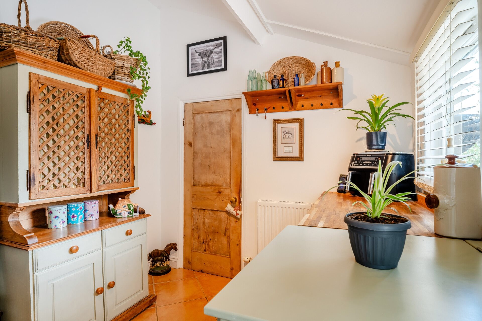 The kitchen is a particular highlight a charming blend of ceramic tiles and original wood flooring, with cabinets painted in Tarnish Shilling. Floor-to-ceiling pantry cupboards offer generous storage alongside an integral dishwasher, wine rack, and a double Belfast sink set into a Fired Earth unit, complemented by matching Fired Earth work surfaces. The fireplace here is a central feature, perfect for placing a large farmhouse table in front.