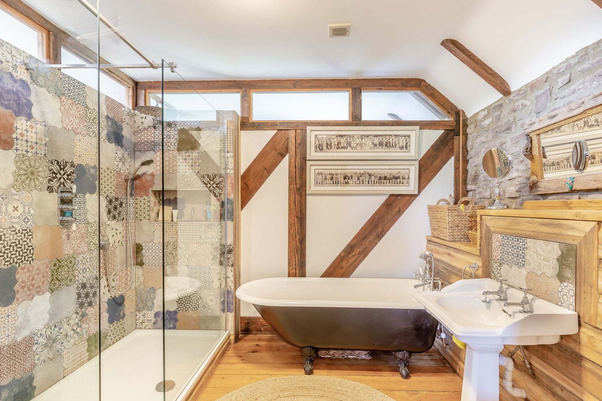 The family bathroom doesn't miss out on character either, with a ball and claw bathtub, separate shower, wash hand basin, and WC, all continuing the home's blend of charm and style.