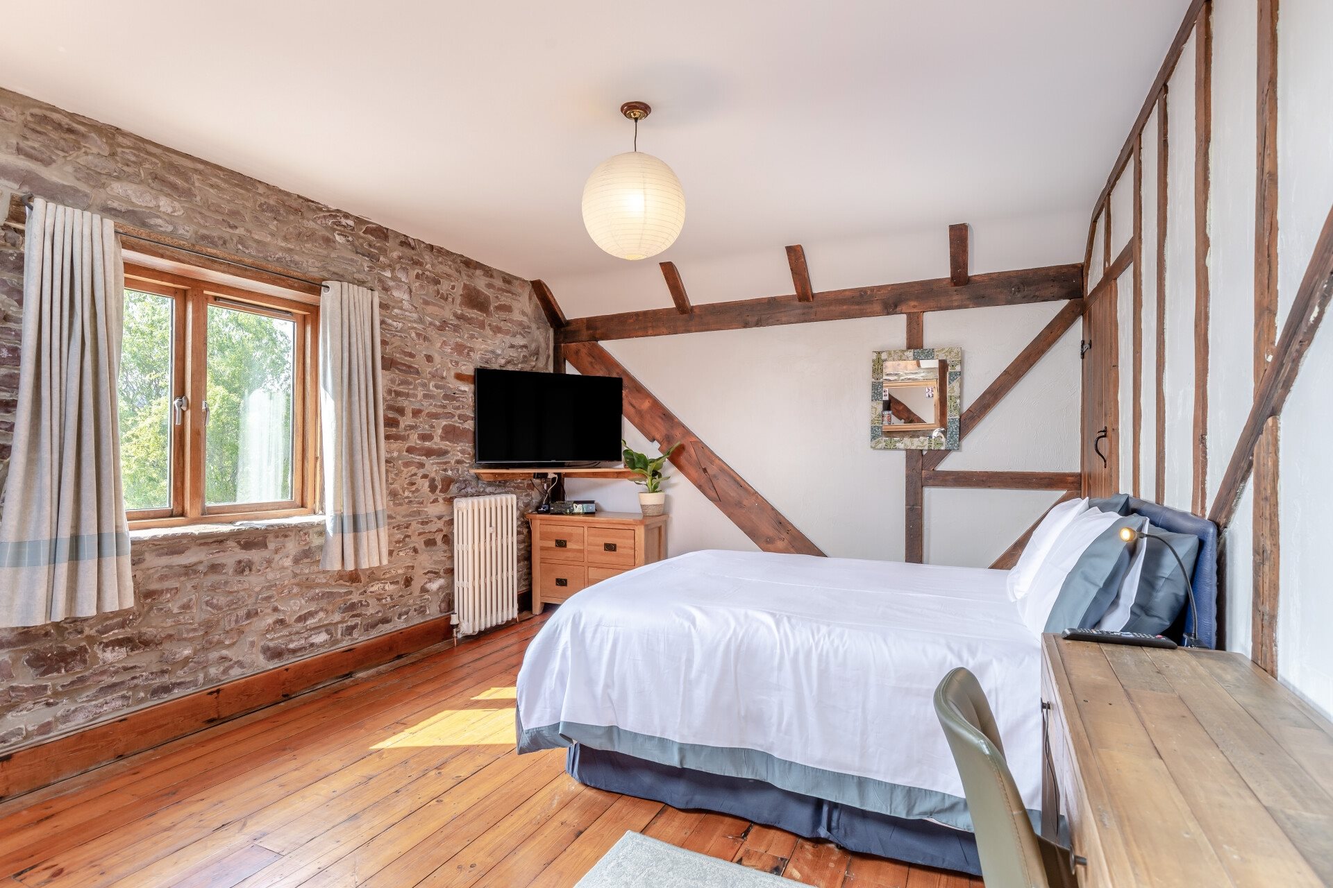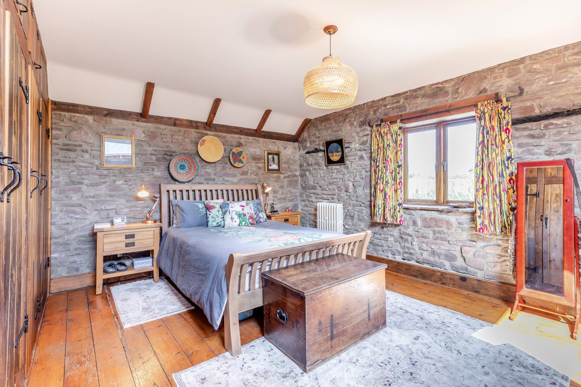 Upstairs, the layout mirrors the ground floor, with exposed beams and rustic features throughout all four bedrooms. Each room enjoys views of the surrounding gardens or neighbouring fields. The principal bedroom is especially impressive, with wall-to-wall fitted wardrobes, one of which conceals a luxurious en-suite. This private sanctuary features a slipper bath, separate shower, and Moroccan-style tiling, offering a true retreat from the rest of the home.
