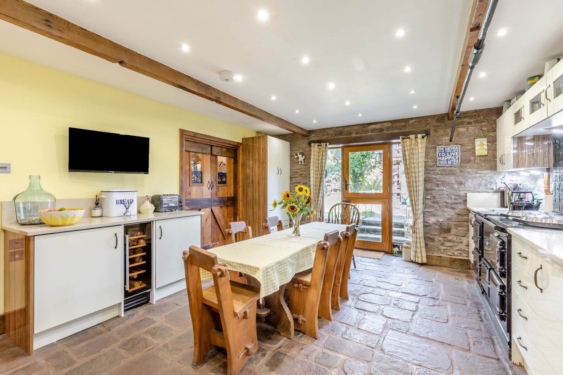 At the heart of the home lies the kitchen, where a classic oil-fired Aga takes centre stage, set on reclaimed Welsh slate flooring. Cream gloss units are paired with granite work surfaces, a Belfast sink, integrated appliances including a dishwasher, twin under-counter fridges, and a wine cooler. Reclaimed Victorian radiators run throughout the property, adding character and warmth.