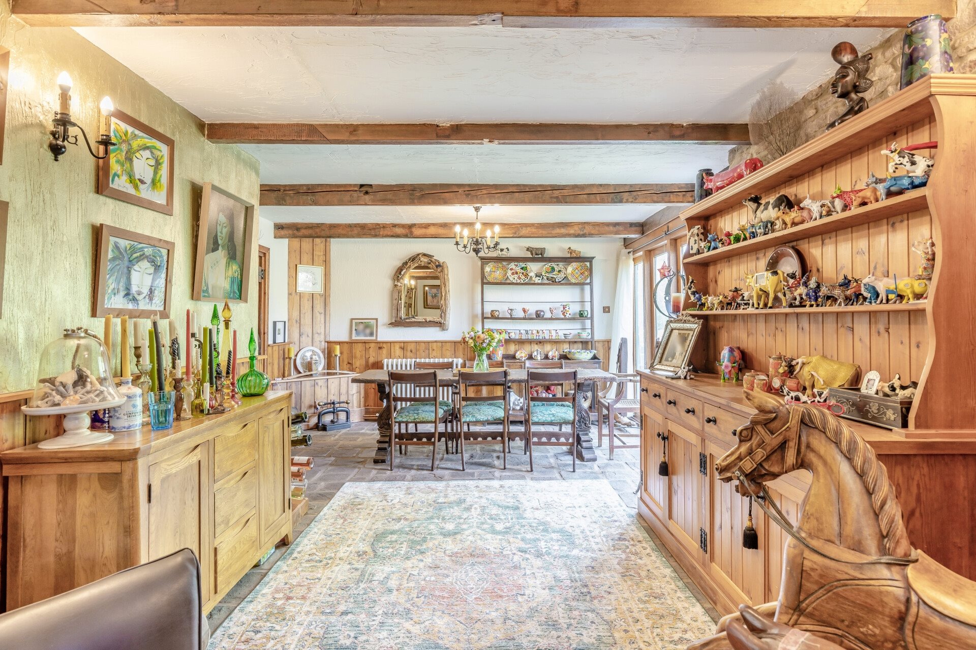 The kitchen flows into the formal dining room, where reclaimed wall panelling adds texture and French doors bring in plenty of light.