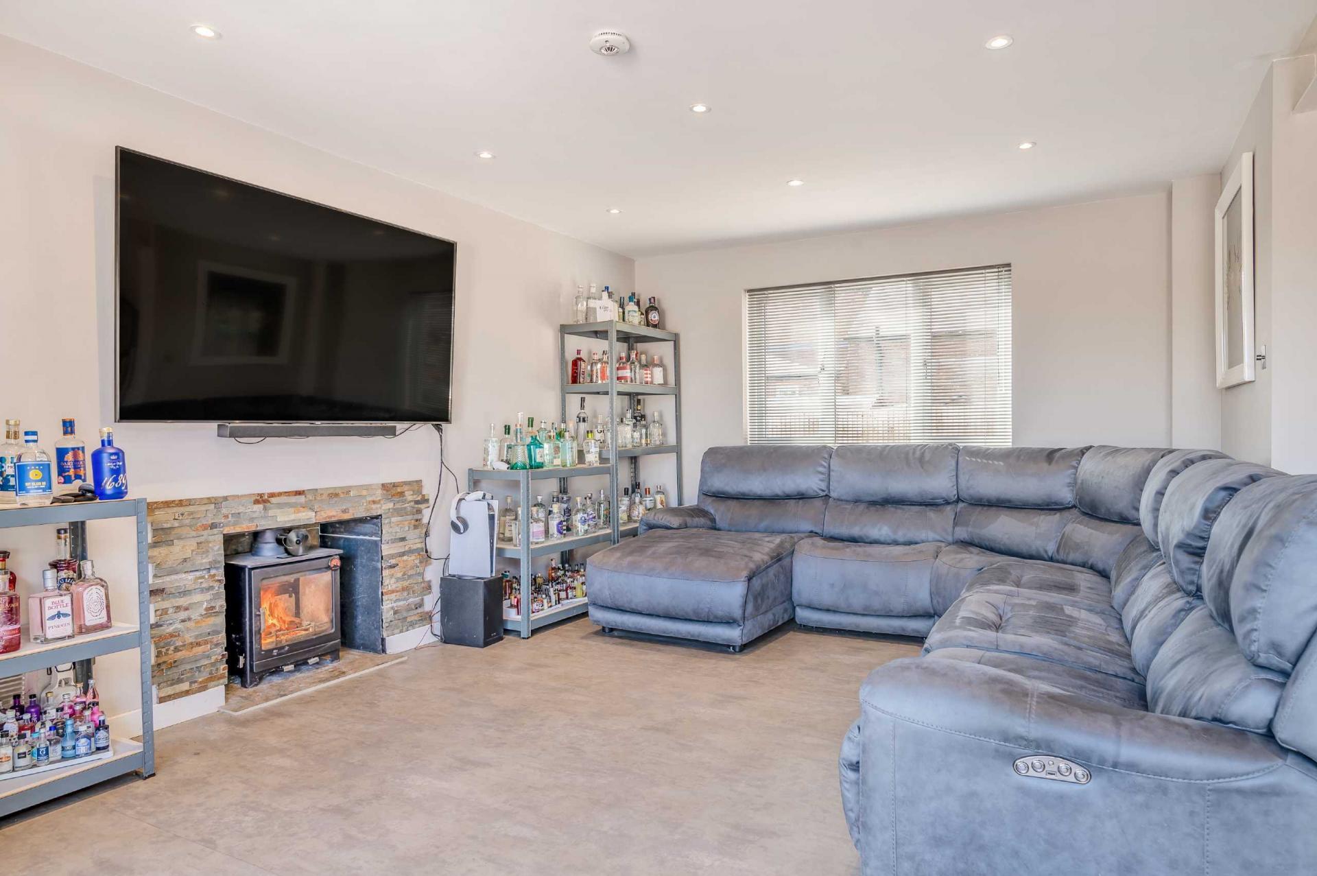 The front door leads into a small inner lobby area, which leads into the immediately impressive open plan kitchen-living room. This is undoubtedly the hub of the home, and acts as a wonderful sociable space, with extensive bi-fold doors opening up from the living area to the outside patio area. The living room also features an 8kw dual fuel log burner, recently installed by the current owners.