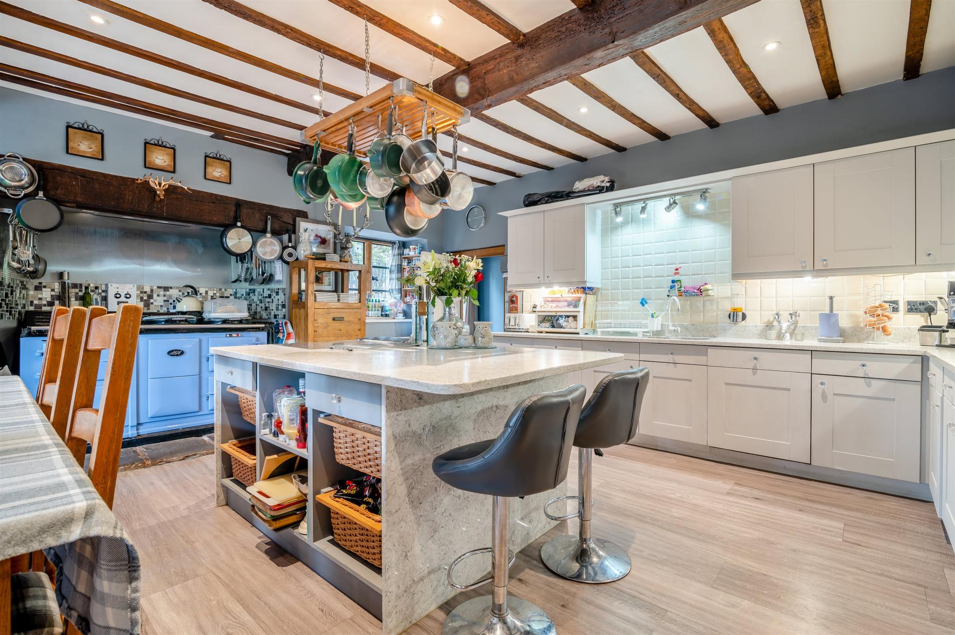 Turning left in the hallway, you enter a wonderful kitchen-dining-family room, complete with modern fitted kitchen, with base and wall mounted units and solid granite worktops, central island with breakfast bar, Aga oven and an integrated dishwasher. There are built-in cabinets, window seat, front and side aspect windows and a corner bar area.