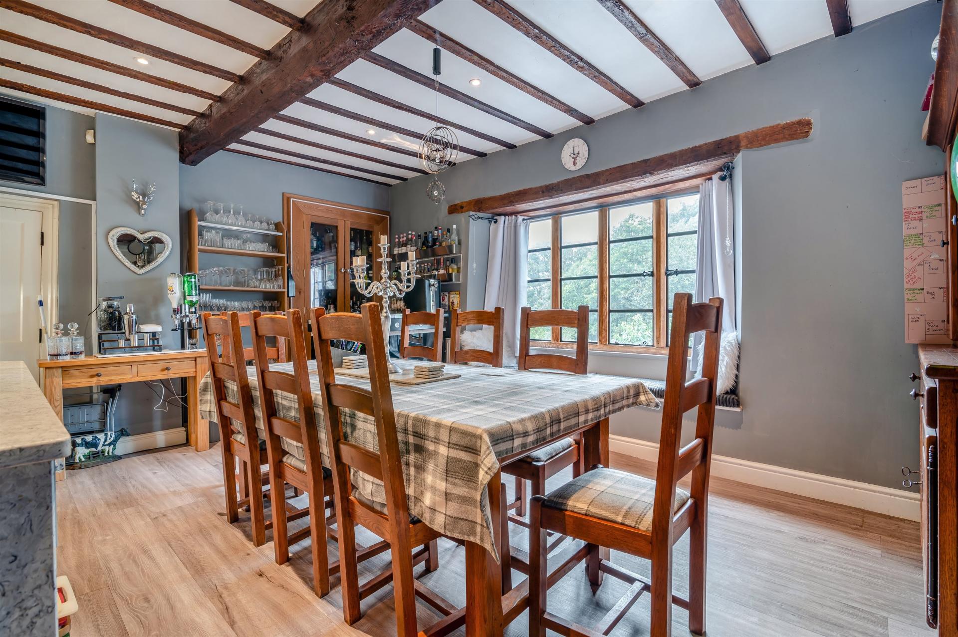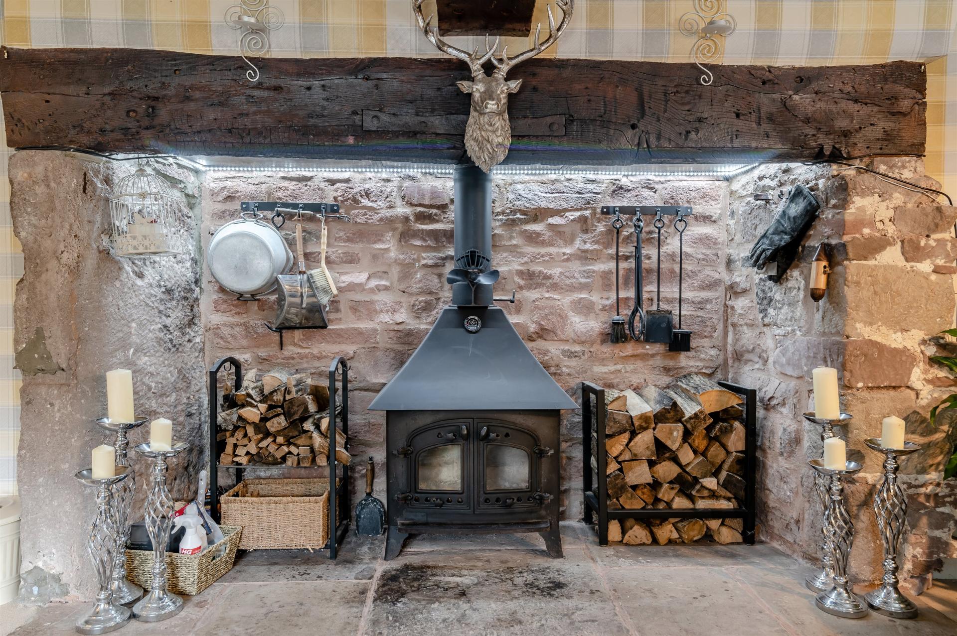 Turning right from the hallway, you enter a beautiful, spacious lounge, with exposed stone fireplace housing a cast iron wood burner, door to storage cupboard, exposed ceiling and wall beams, two front aspect windows and a door leading outside to a lovely covered patio area.
