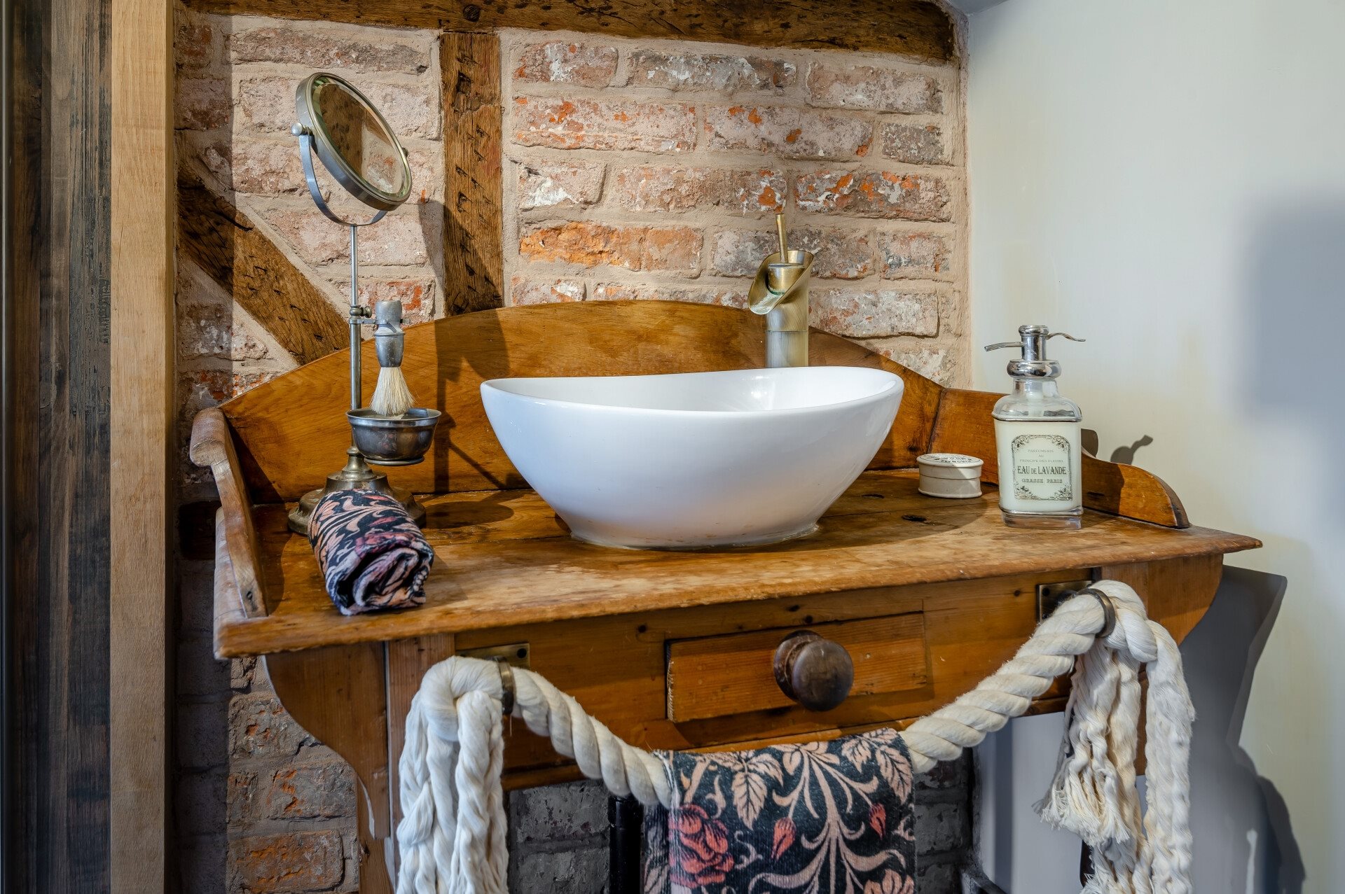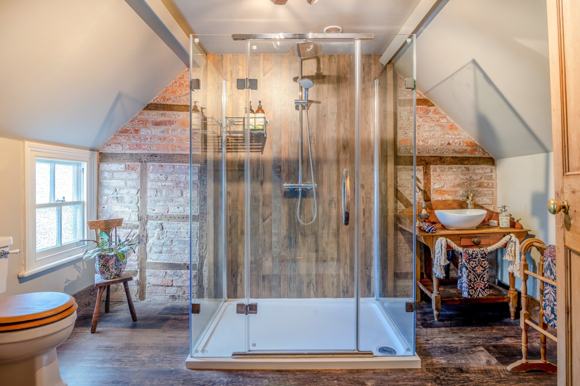 The second bathroom is a real wow factor, having been thoughtfully and tastefully upgraded, with a range of quirky and unique features. There is a large walk ins shower cubicle to the centre, W.C and bowl wash basin set within a rustic wooden unit. There are exposed floorboards and brick walls with wooden beams running through them.