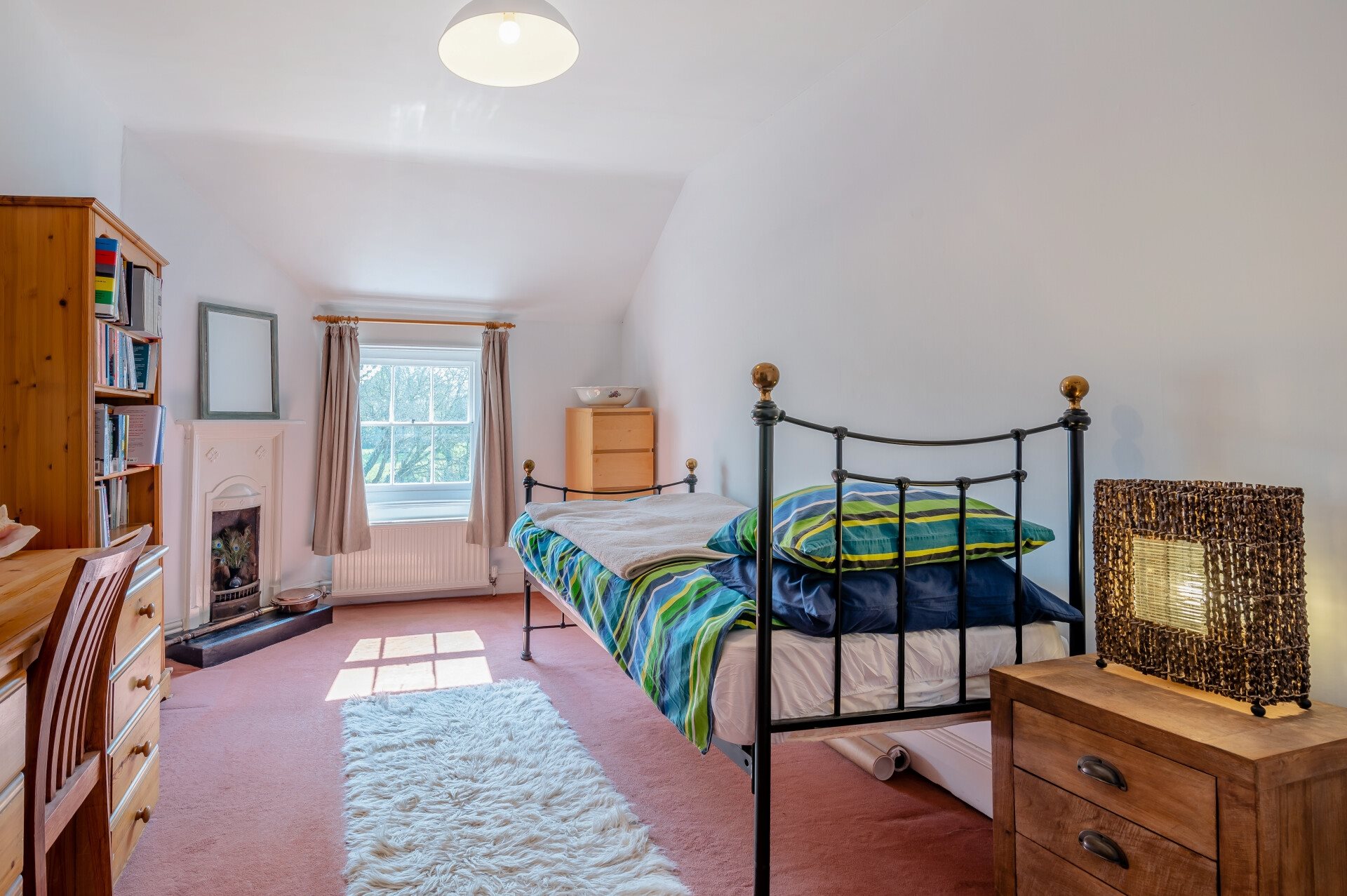 The second bedroom is equally impressive, with large bay window overlooking the gardens and views beyond, a cast iron feature fireplace and storage cupboard with shelving.