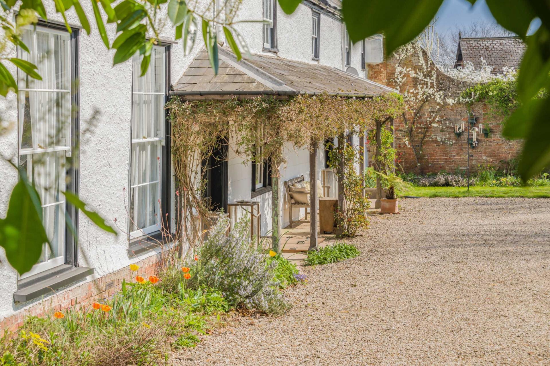 Outside - The property is approached by two five bar gates accessing a semi-circular In-out driveway surrounding a central lawn with flower beds and a small wildlife pond, which attracts a huge array of wildlife, including newts and frogs. The frontage of the house gives a beautiful first impression, with creeping roses and a red brick wall framing it to one side.