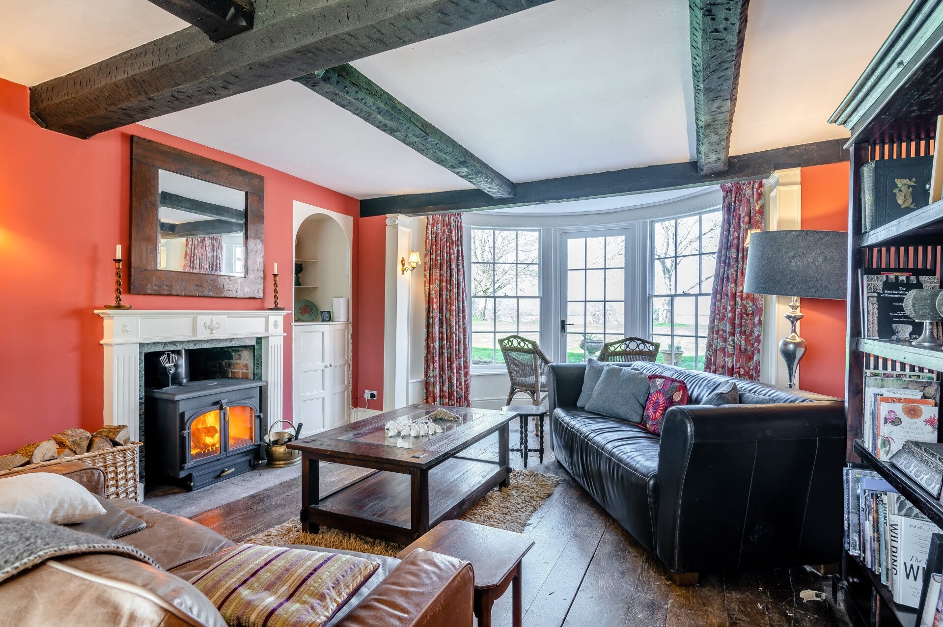 From the entrance hall, you walk through into a wonderfully bright lounge, which enjoys a lovely outlook to the rear gardens via a bay window. There is a woodburning stove set within a timber surround fireplace, exposed floorboards and beams, and fitted storage shelving and cupboards.