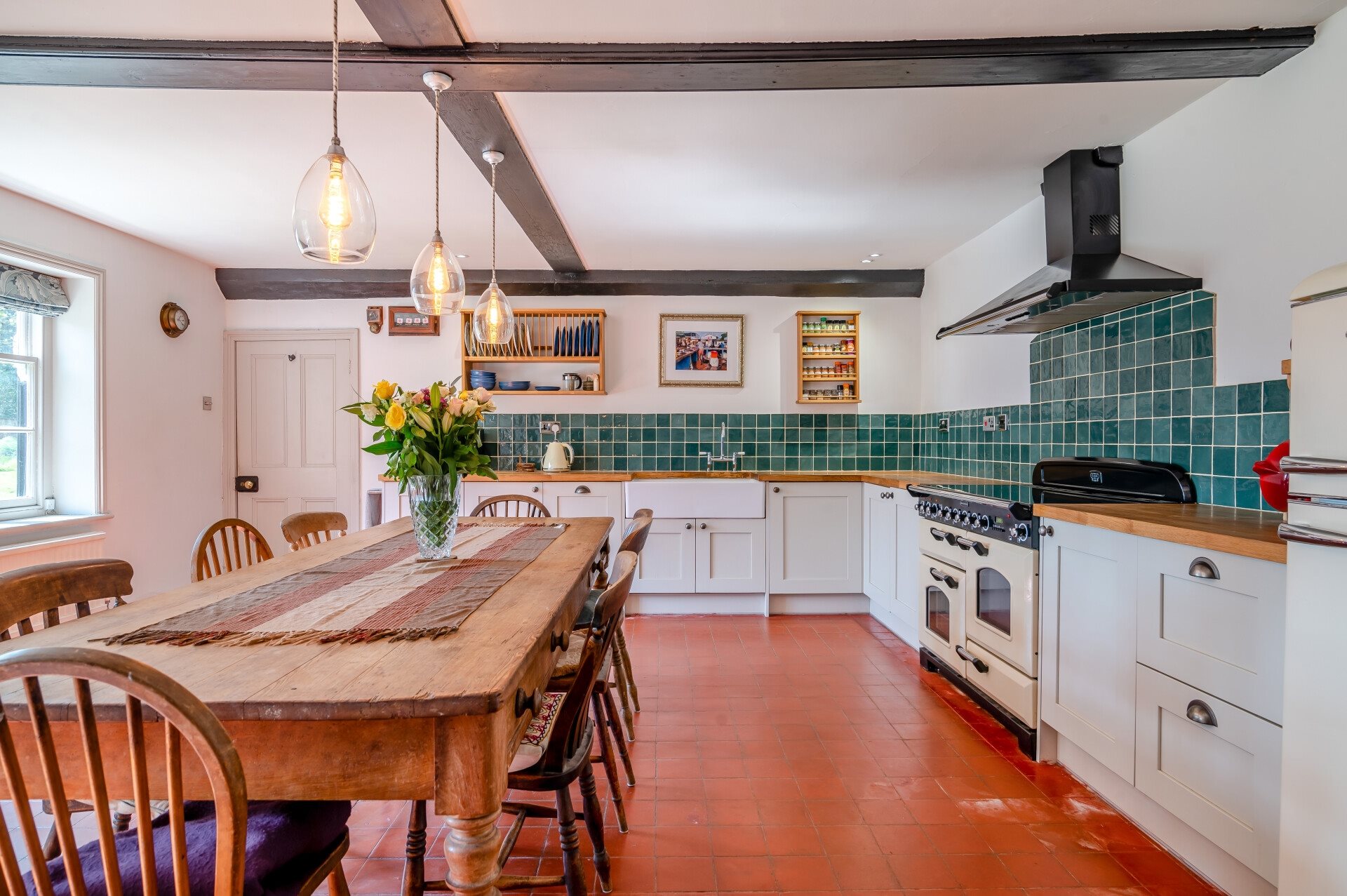 The farmhouse style kitchen lies to the opposite end of the house, and is exceptionally spacious, with room for a large breakfast or dining table. There are modern pastel grey units with timber worksurfaces, a Rangemaster cooker and space for a fridge-freezer, with two windows looking out to the front gardens.