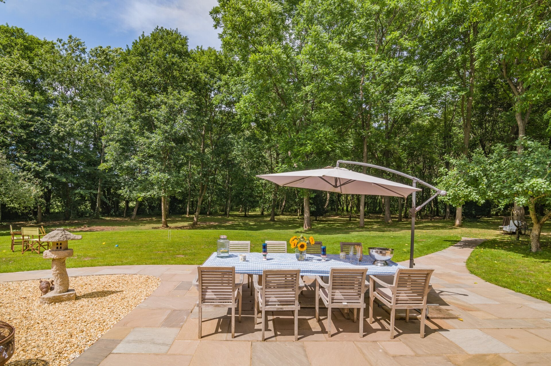 Leading round to the side you are greeted by a truly delightful patio area, which offers a stunning space to indulge in outside dining and entertaining, enjoying the tranquillity and privacy offered by the woodlands beyond. Adjacent to the patio area, there is a space dedicated to vegetable growing with raised beds, as well as a range of mature fruit trees.